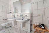 Das Badezimmer verfügt über Tageslicht, eine Badewanne und Dusche, WC sowie zwei Waschtische mit Spiegel.
