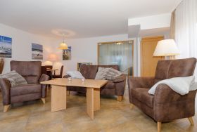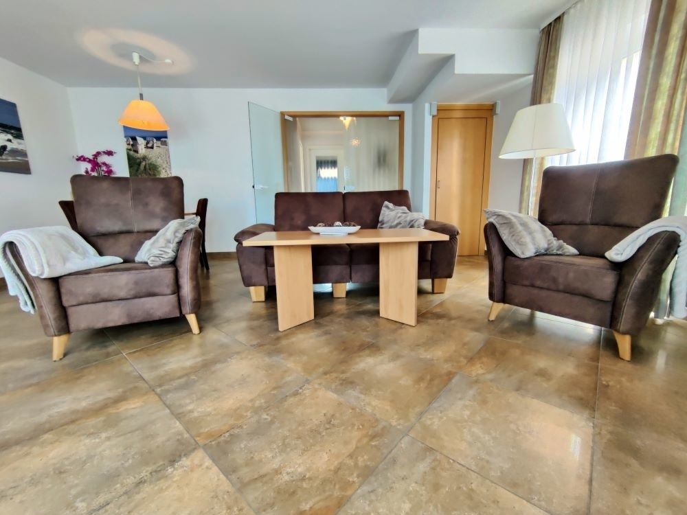 Geräumige, schön eingerichtete Wohnung mit tollem Meerblick. Die Ledersofas laden zum Entspannen ein, hier können Sie den Tag ausklingen lassen.