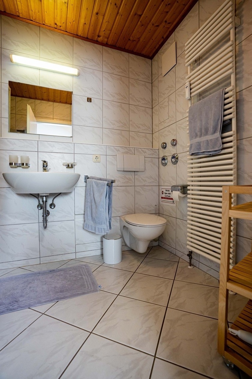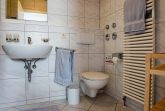 Das Badezimmer verfügt über eine Dusche, WC sowie einem Waschtisch mit beleuchteten Spiegel. Im kleinen Gäste WC gibt es ebenfalls einen Waschtisch.