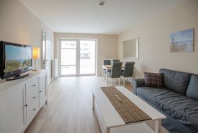 Das Wohnzimmer ist mit Schlafsofa, Couchtisch, Sideboard und TV und mit Esstisch für 4 Personen eingerichtet. Von hier aus haben Sie Zugang zum großen, sonnigen Balkon.