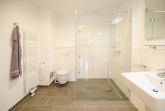 Das Badezimmer verfügt über eine große ebenerdige Dusche und WC.