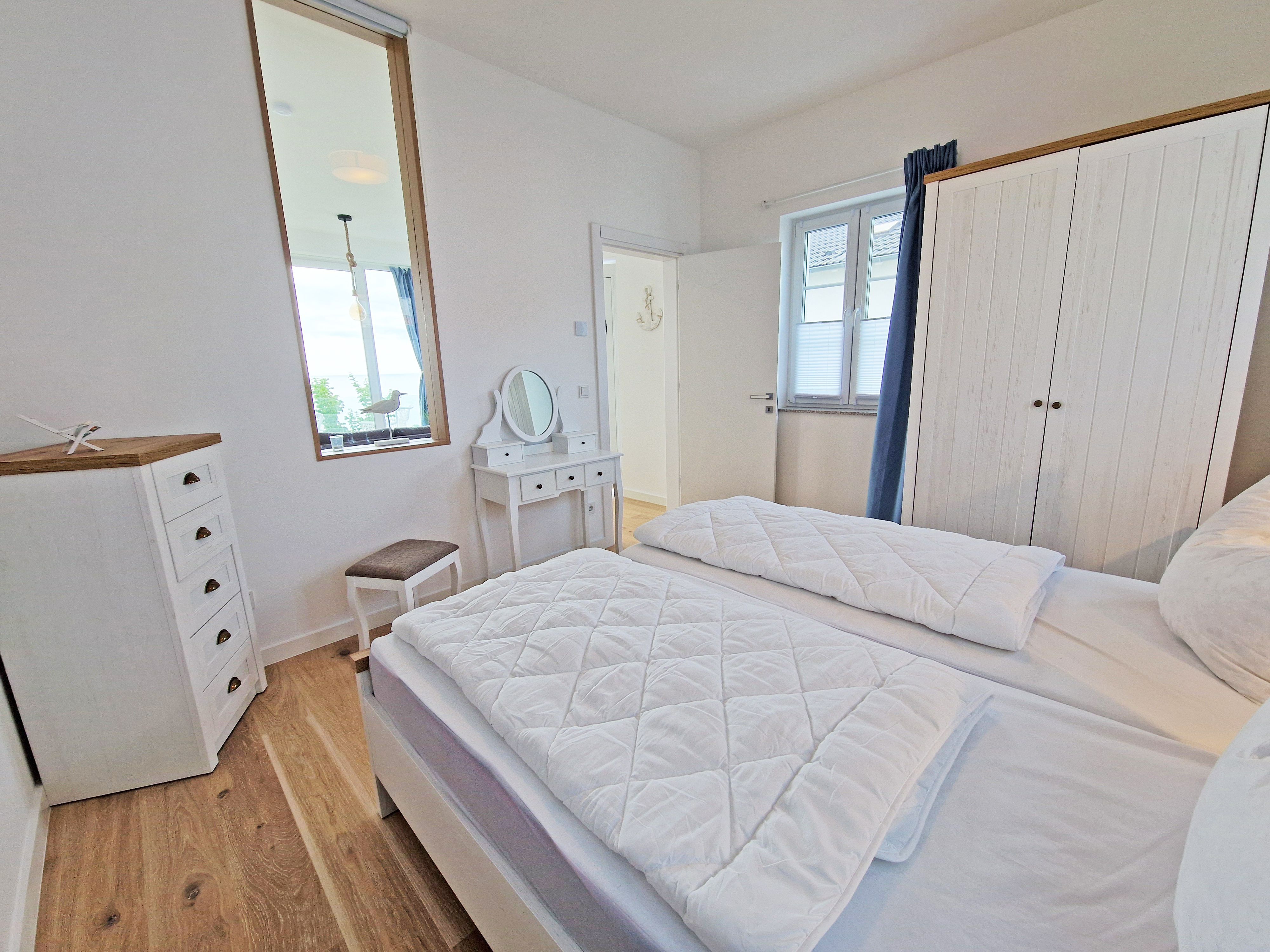 Ein Schlafzimmer mit Doppelbett und Kleiderschrank.