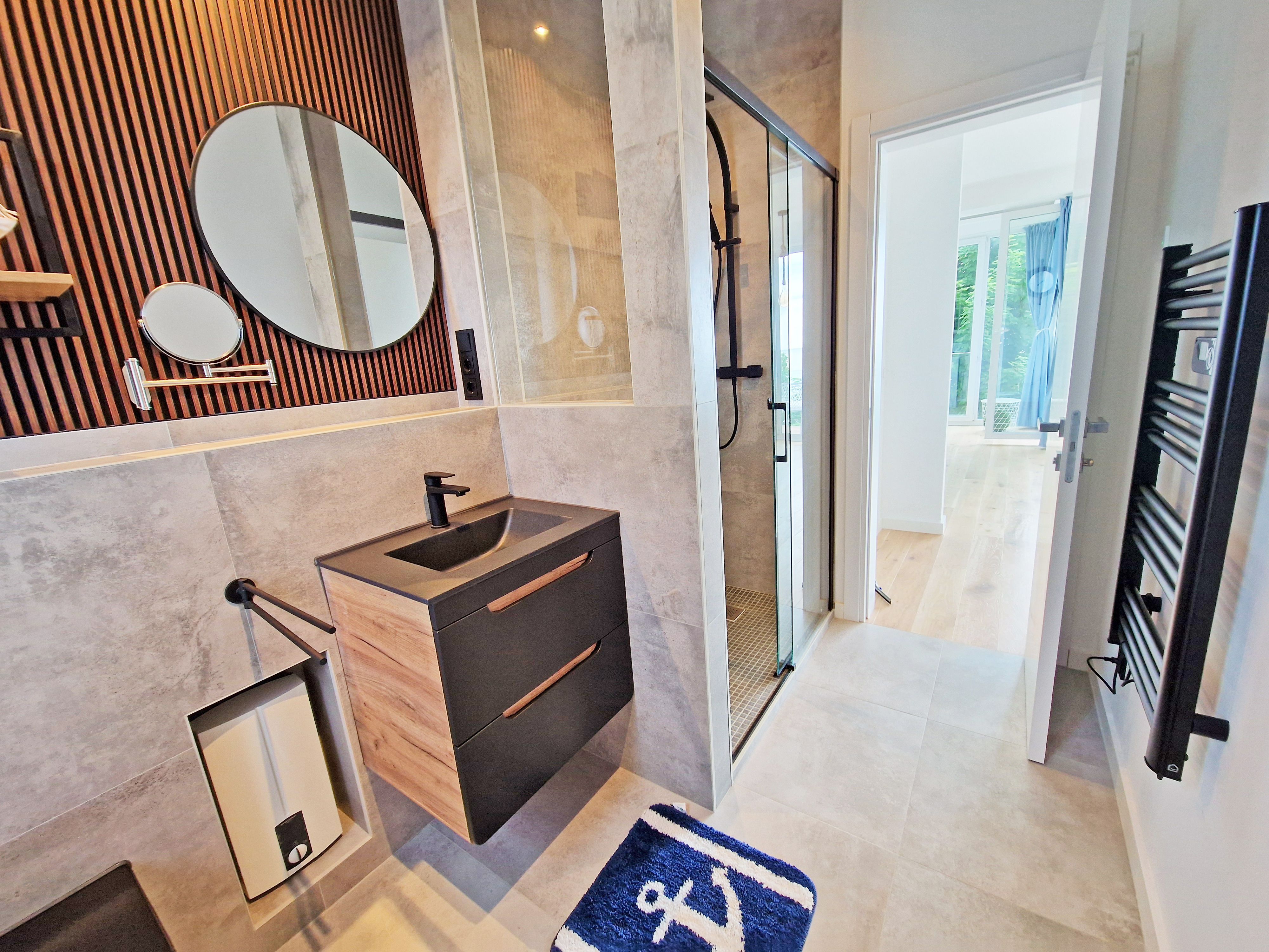 Das moderne Badezimmer ist ausgestattet mit bodengleicher Dusche, Regenbrause und WC.