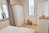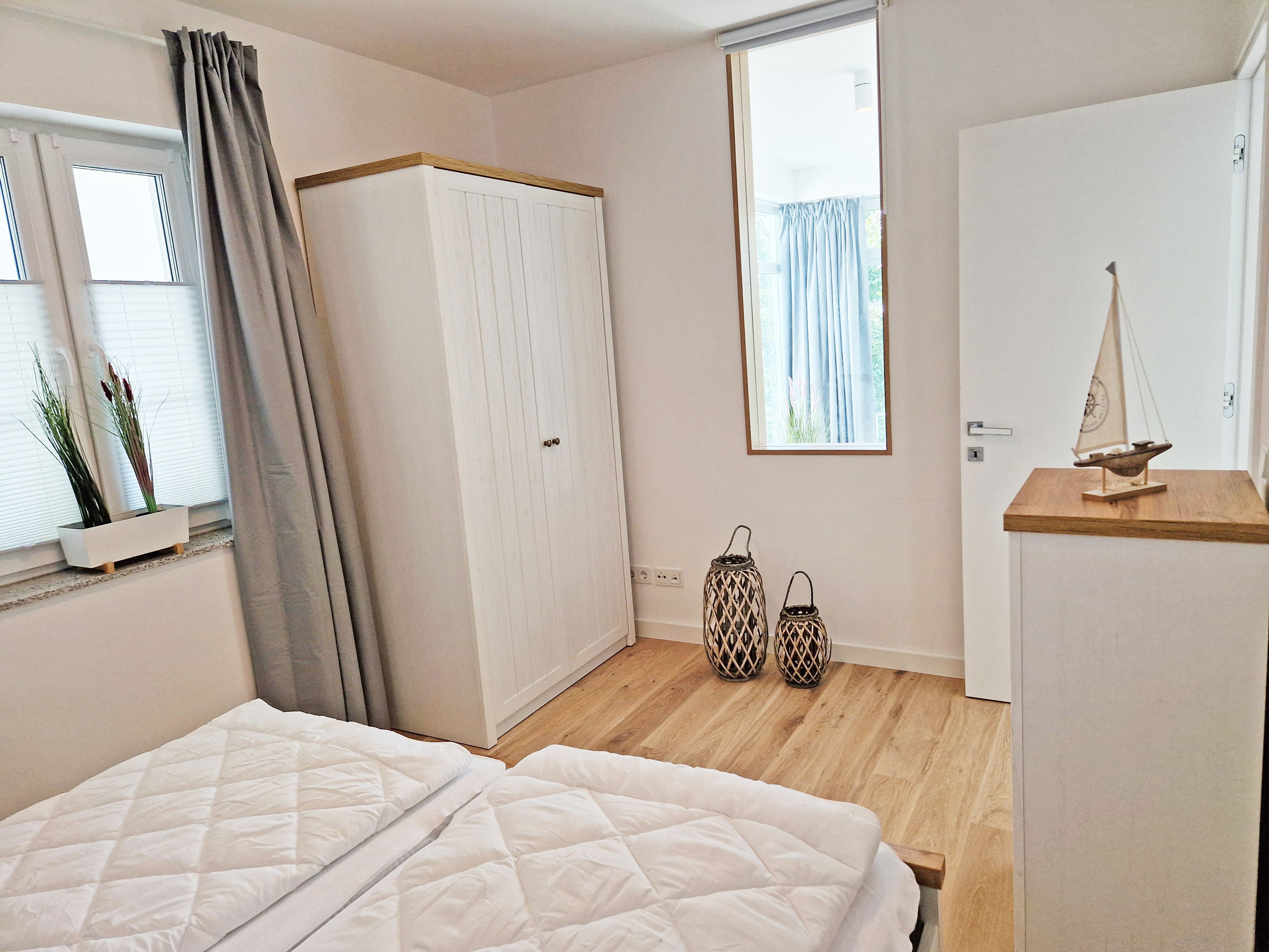 Ein Schlafzimmer mit Doppelbett und Kleiderschrank.