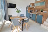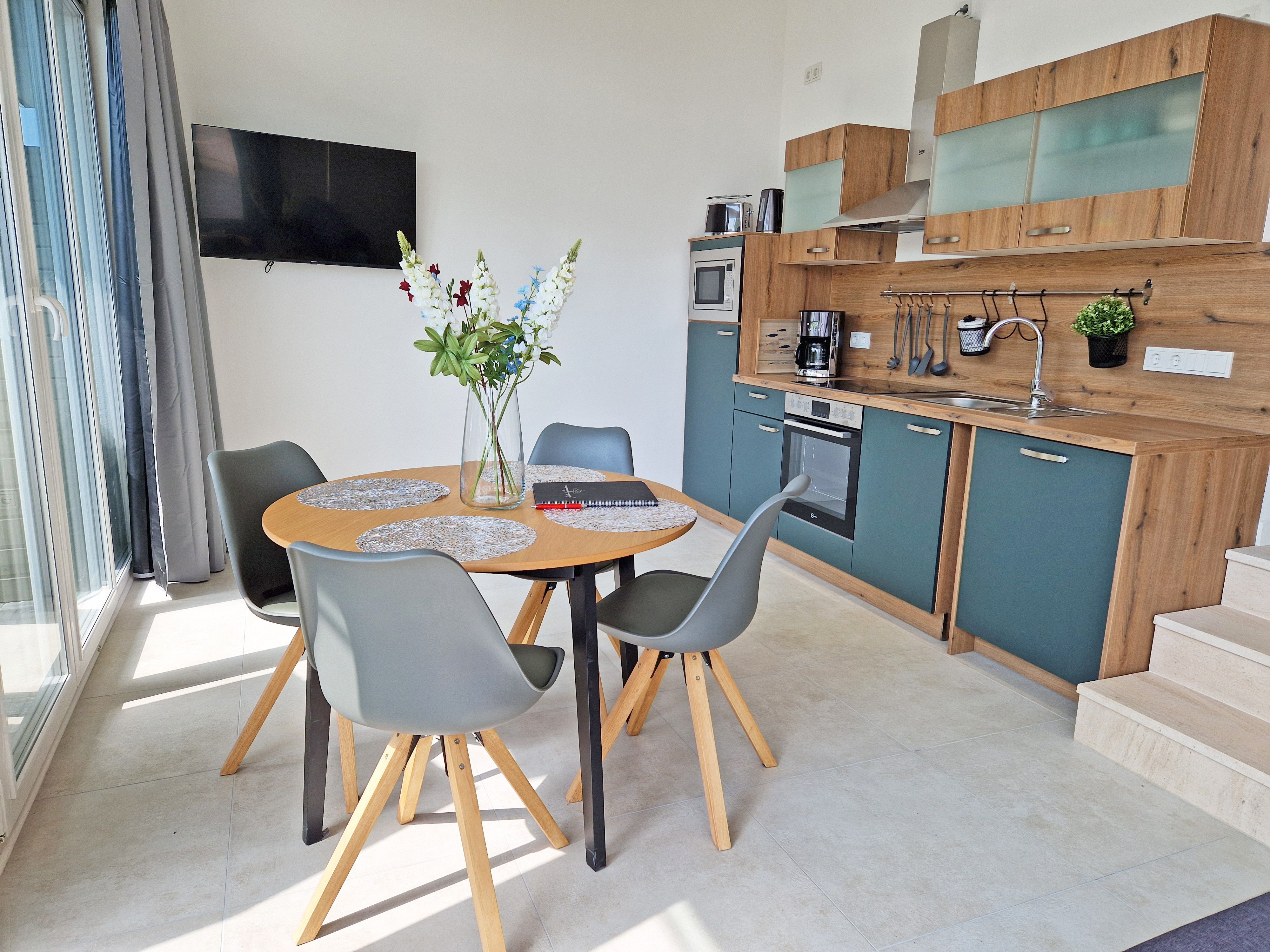 Die Appartements sind durch eine Treppe verbunden. Dadurch besteht die Möglichkeit aus 2 Appartements ein großes Feriendomizil zu machen. Alle Appartements verfügen über eine Fußbodenheizung und einem eigenen Parkplatz. Dieser steht in 300 Meter Entfernung zur Verfügung. Moderne Bäder mit bodengleicher Dusche und Wellnessbrause sowie eine komplett und hochwertig eingerichtete Küche warten auf Sie. Auf dem Balkon bzw. Terrasse laden elegante Möbel zum Sonnen und Verweilen ein. Am Haus befinden sich Fahrradständer die zur Verfügung stehen.
