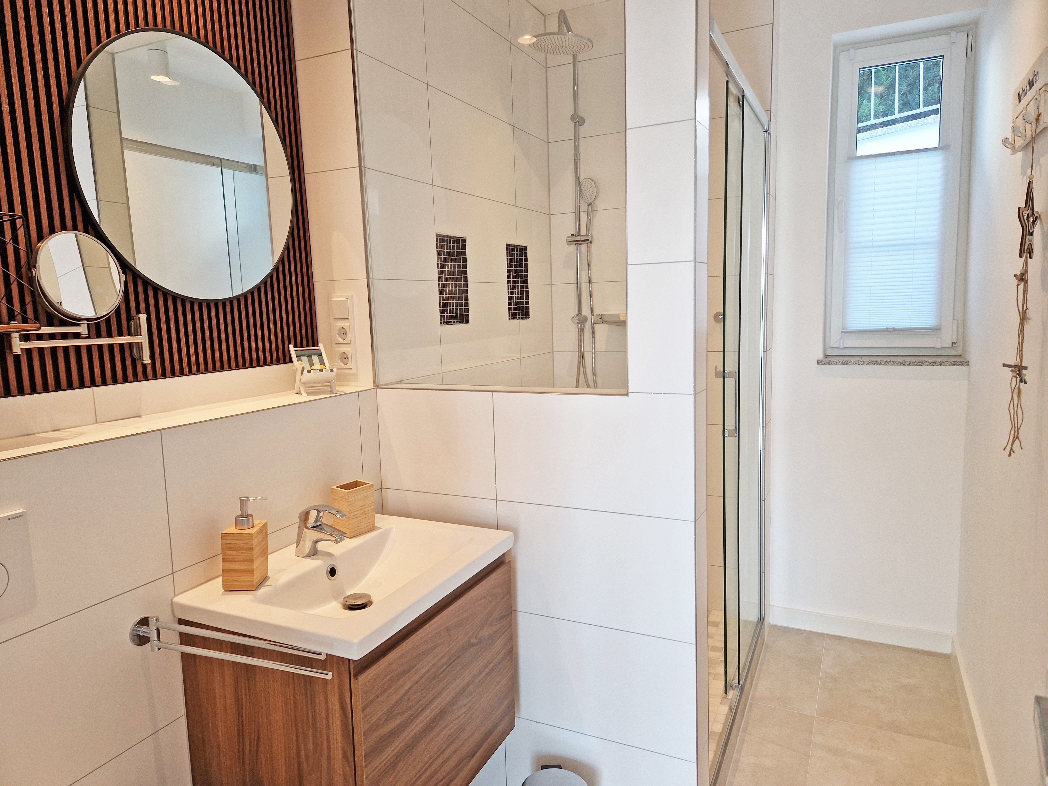 Das moderne Badezimmer ist ausgestattet mit bodengleicher Dusche, Regenbrause und WC.