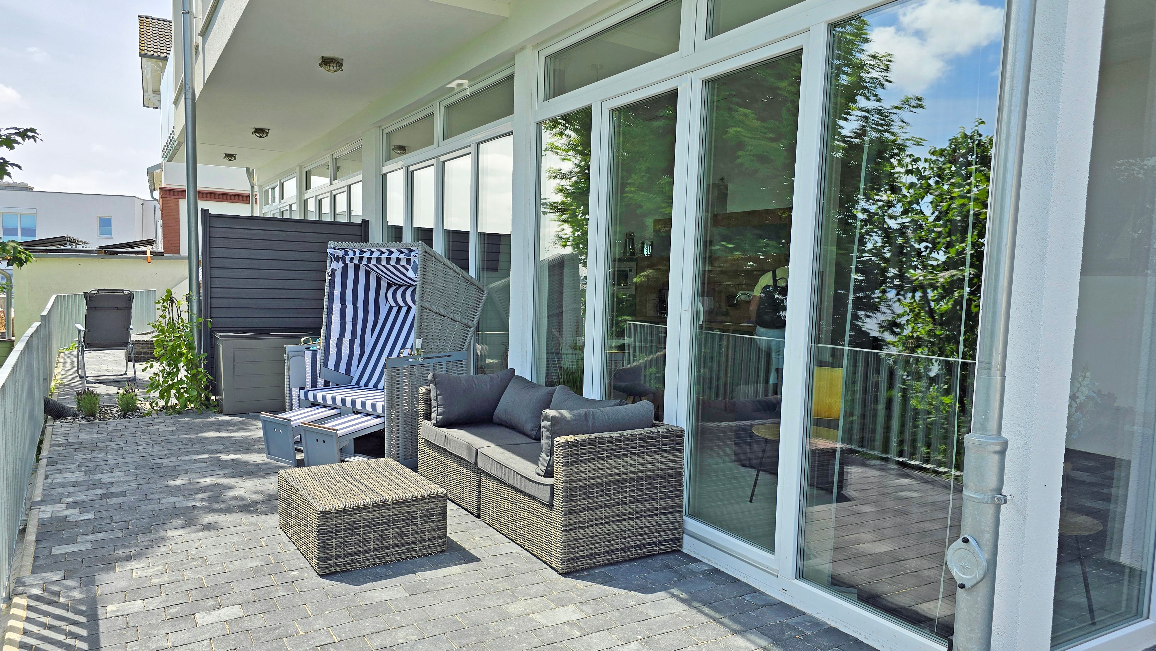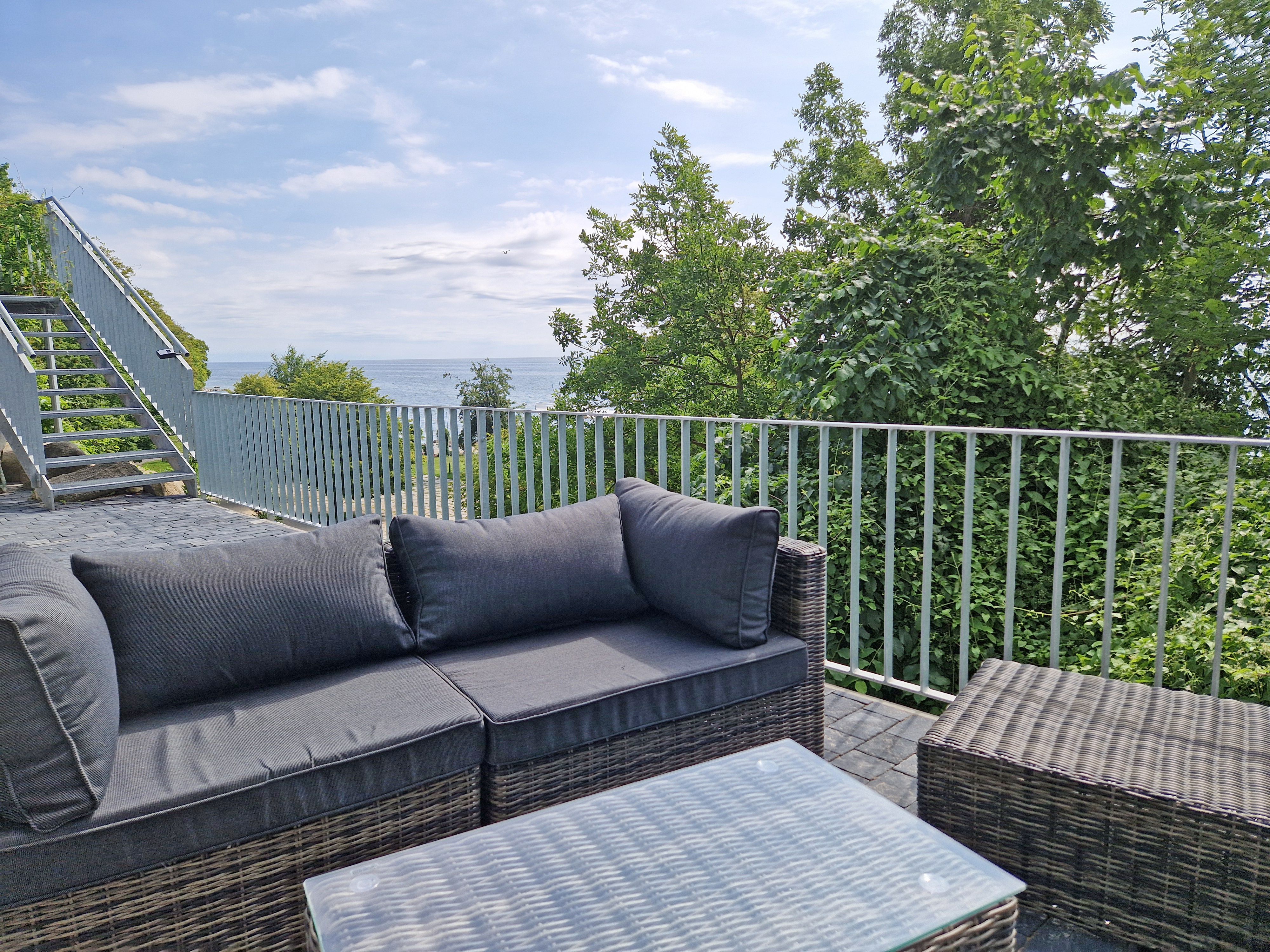 Die großzügige Terrasse mit Loungemöbeln und Strandkorb in Südlage, mit Meerblick, garantieren einen erholsamen Urlaub.