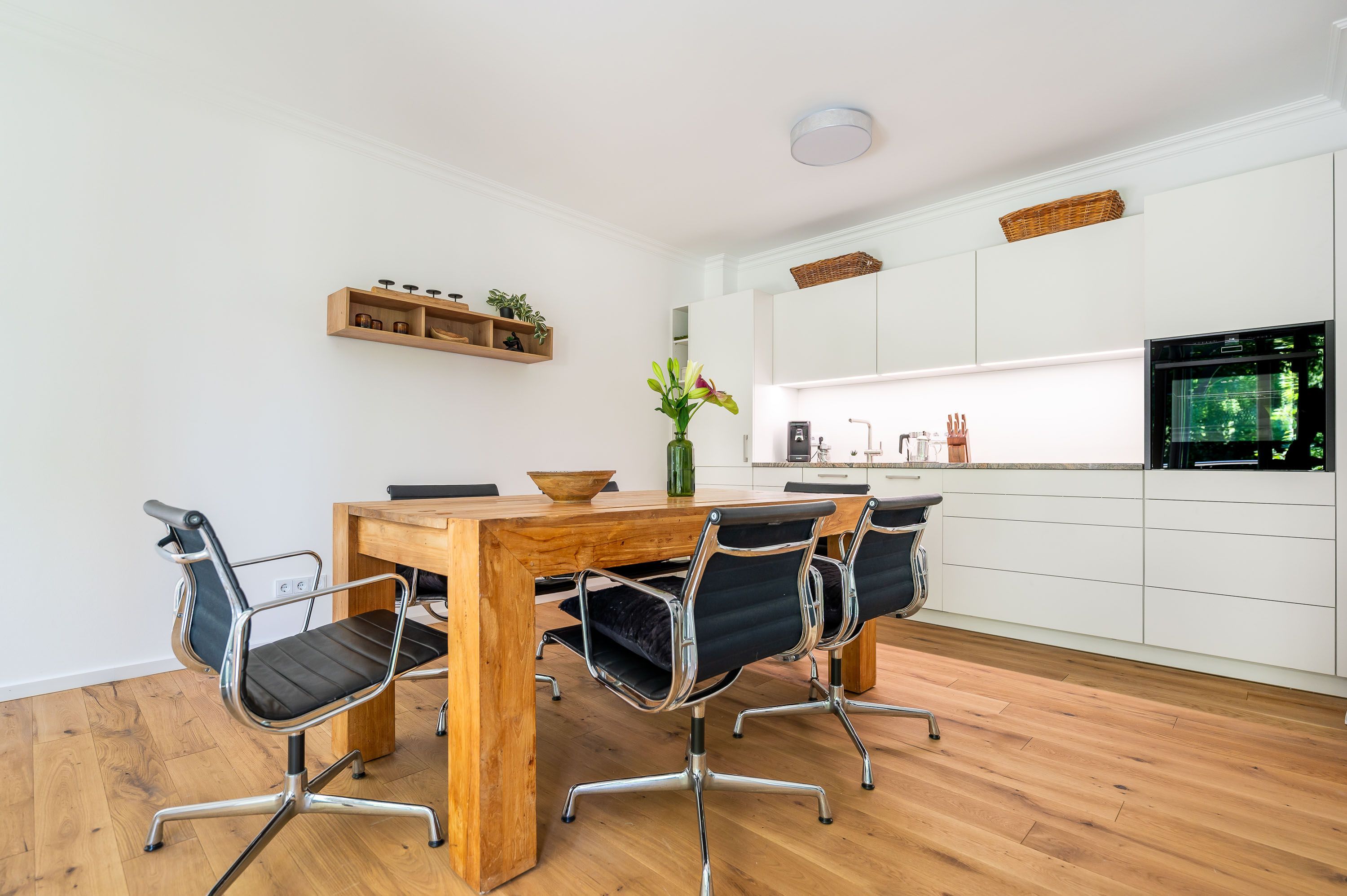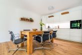 Der großzügige Holszesstisch im Essbereich bietet reichlich Platz für geselliges Beisammensein, aber auch sehr gut geeignet, falls die Arbeit doch mal mit muss.