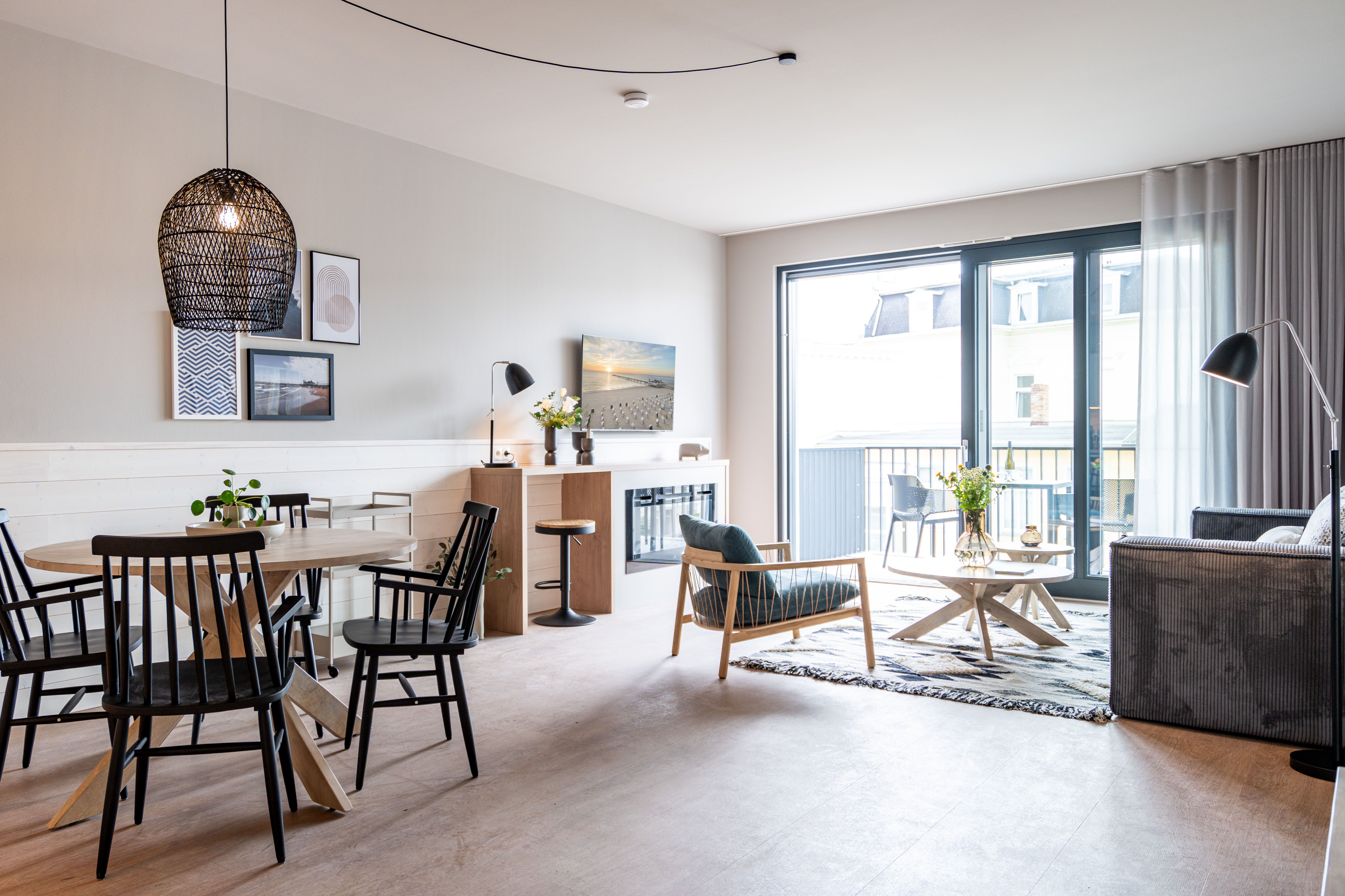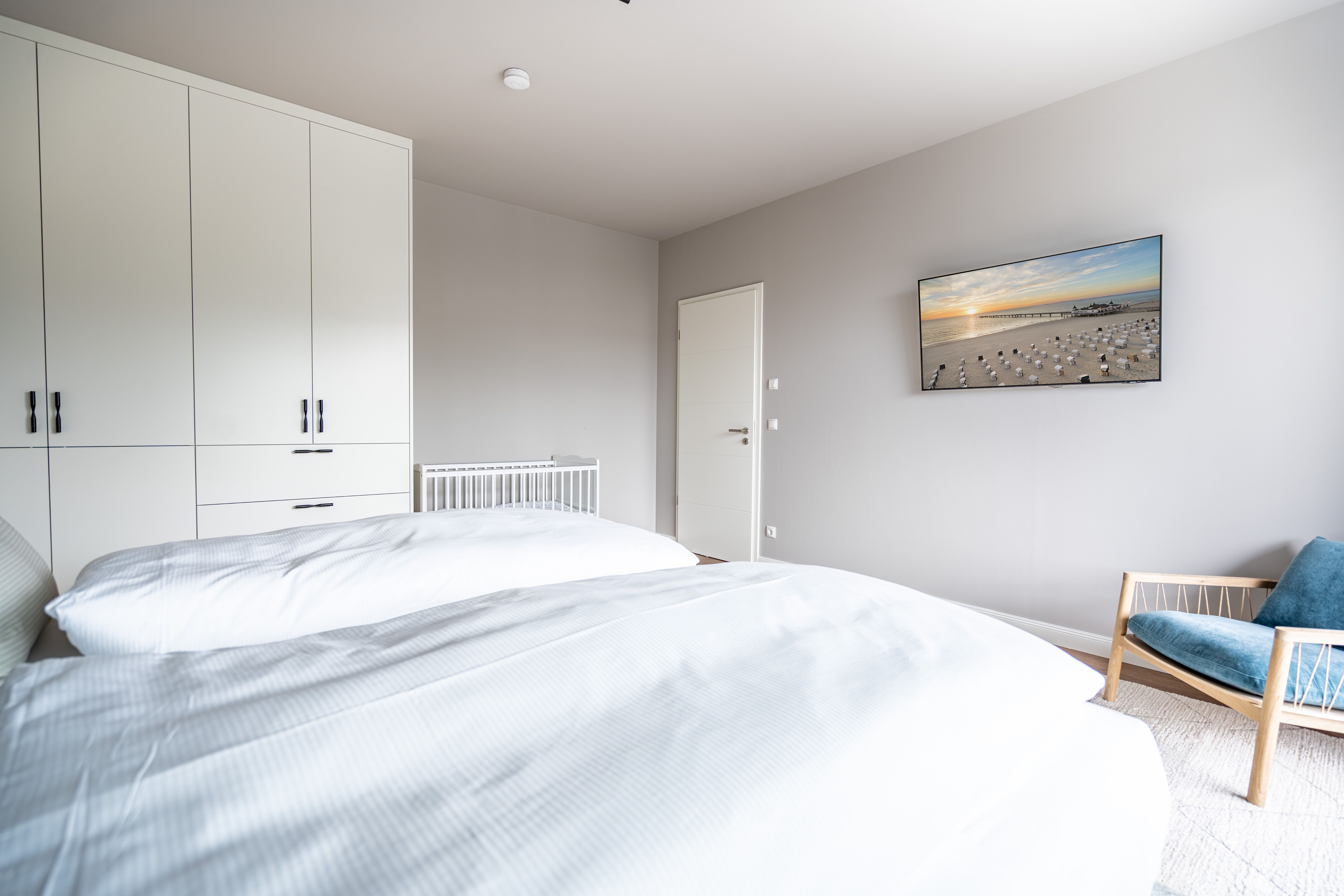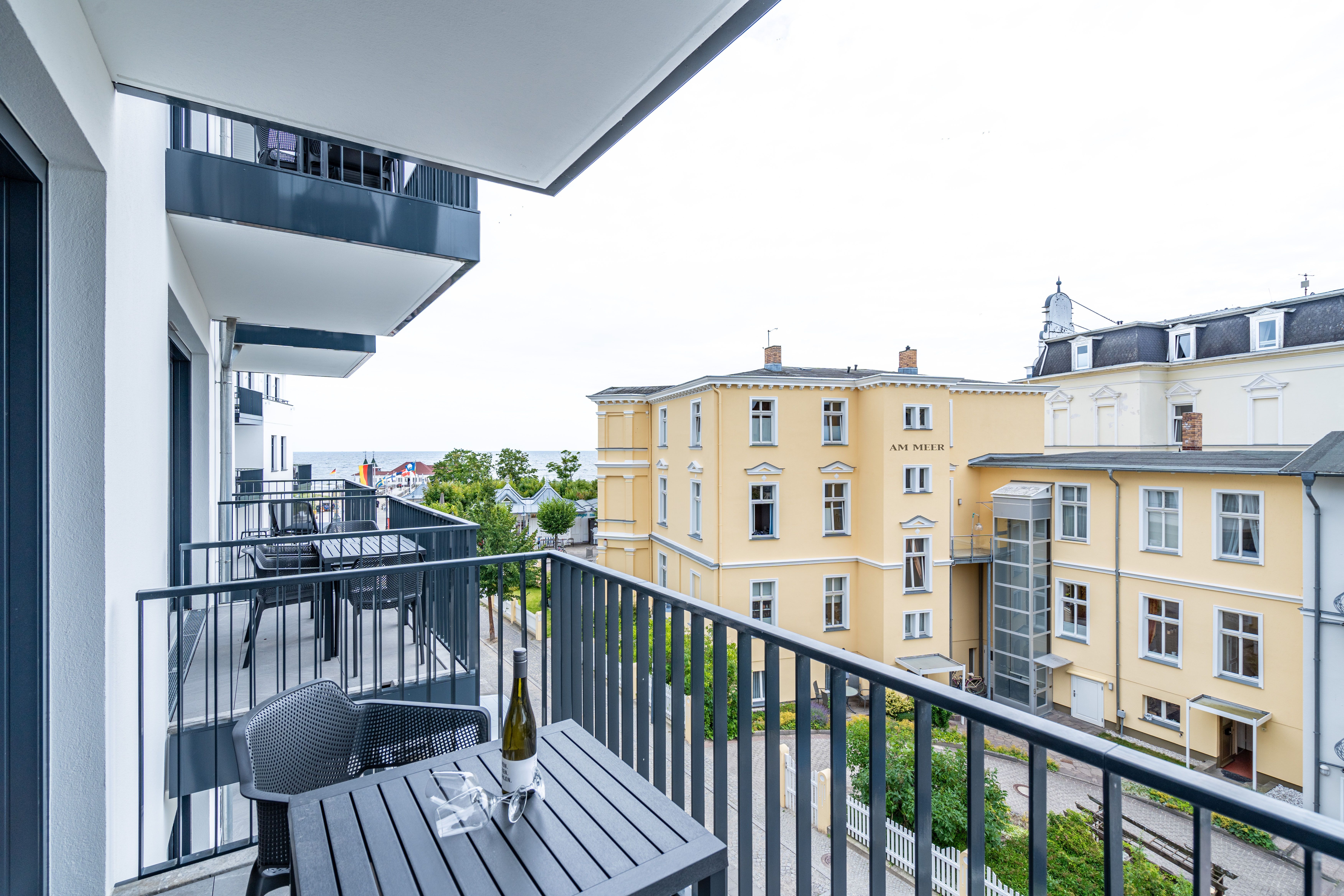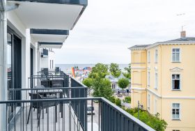 Direkt an der Ostsee mit Blick aufs Wasser mehr Meer geht nicht. Diese stilvolle 2-Raum-Wohnung B 2.3 im zweiten Obergeschoss der Strandterrasse ist mit ihren 77 Quadratmeter ein ideales Urlaubsparadies für bis zu 2 Personen und 1 Kleinkind im Babybett. Hier können Sie gleich von zwei Balkonen die Ahlbecker Seebrücke und die dahinter liegende Ostsee genießen. Dazu bietet das Appartement alle Annehmlichkeiten, die Sie sich wünschen. Das großzügige Wohn-Esszimmer mit der integrierten, offenen Küche ist ein kleines Wohlfühlreich der Extraklasse. Komfortable und stylische Möbel im skandinavischen Design sorgen dafür, dass Sie sich hier rundum geborgen fühlen. Zum ausgiebigen Entspannen vor dem Elektrokamin (ohne Wärmeabgabe) eignet sich das tolle Sofa oder der Sessel bestens. Filmabende werden dank des großen Flat-TV (50 Zoll) zu Heimkinoerlebnissen. Ein gemütlicher Essplatz für 4 Personen lädt zum Verweilen ein, während eine Arbeitsstation den Raum funktional ergänzt. Die Küchenzeile ist mit allem ausgestattet, was man zum Kochen und Zubereiten der Mahlzeiten brauchen kann. Dazu gehören moderne Elektrogeräte wie ein Backofen, ein 3-Platten-Induktionsherd oder eine Nespresso-Kapselmaschine. Der Zugang zum ersten Süd-Ost-Balkon bietet einen herrlichen Ausblick und ist mit einem Gartentisch und 2 Stühlen ausgestattet. Auf den zweiten Süd-Ost-Balkon können Sie vom Schlafzimmer aus hinaustreten. Auf der dortigen Gartenliege können Sie sich wunderbar an der frischen Brise erfreuen, die vom Meer herüberweht. Das Schlafzimmer verfügt über ein großes Boxspringdoppelbett (2,00m x 2,00m), ein festes Babybett, einen großen Kleiderschrank und einen Flat-TV (50 Zoll). Ihr Badezimmer wird an ungemütlichen Tagen zu einer kleinen Wellnessoase. Denn es verfügt neben der Dusche, dem Waschtisch und dem WC über eine Infrarotsaunakabine, die Auszeitabende in kuschelige Mußestunden verwandelt. In der Tiefgarage gehört zu Ihrer Wohnung ein PKW-Stellplatz. Herzlich Willkommen in dieser charmanten Ferienwohnung. Wir wünschen Ihnen hier eine wunderbar erholsame Zeit.