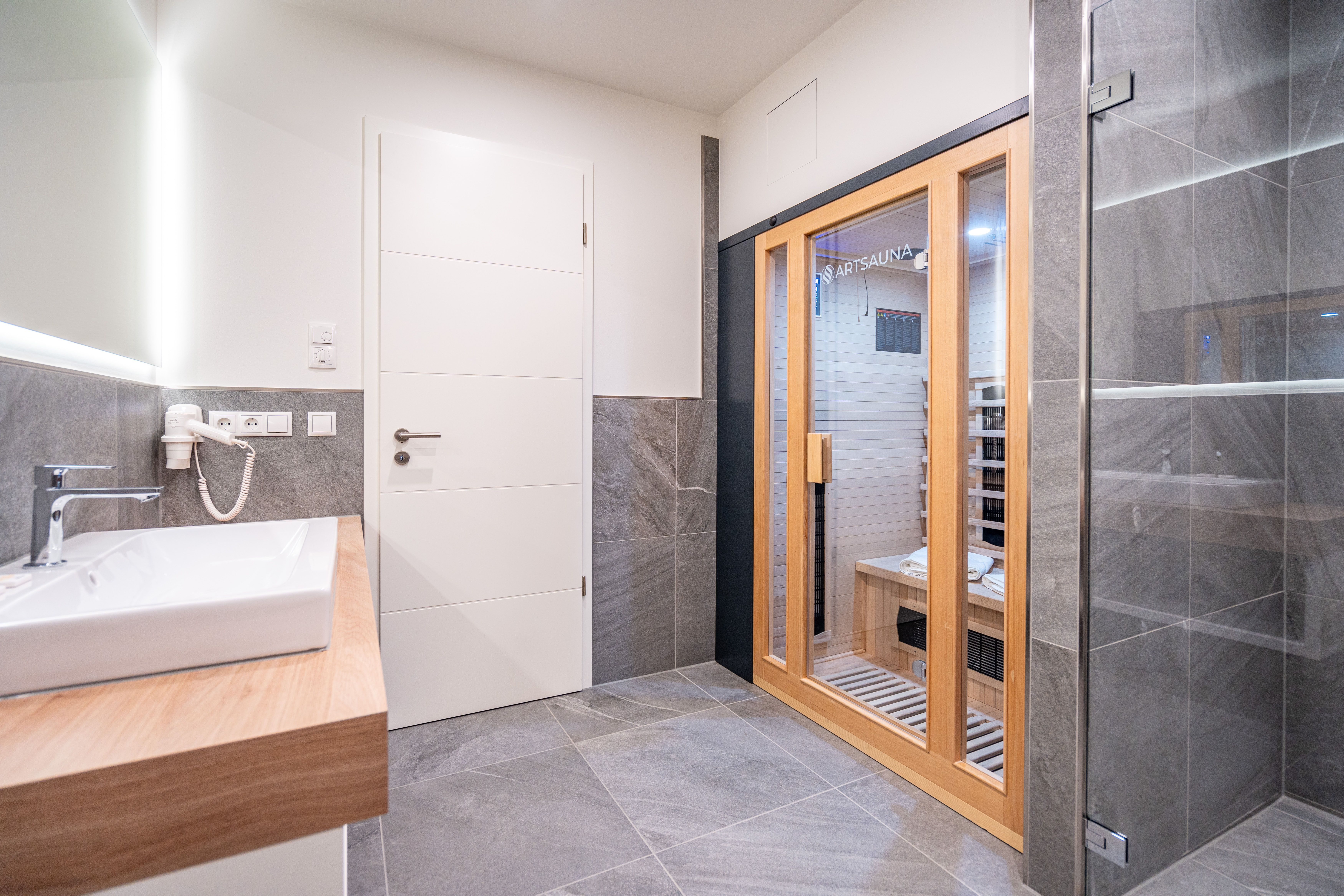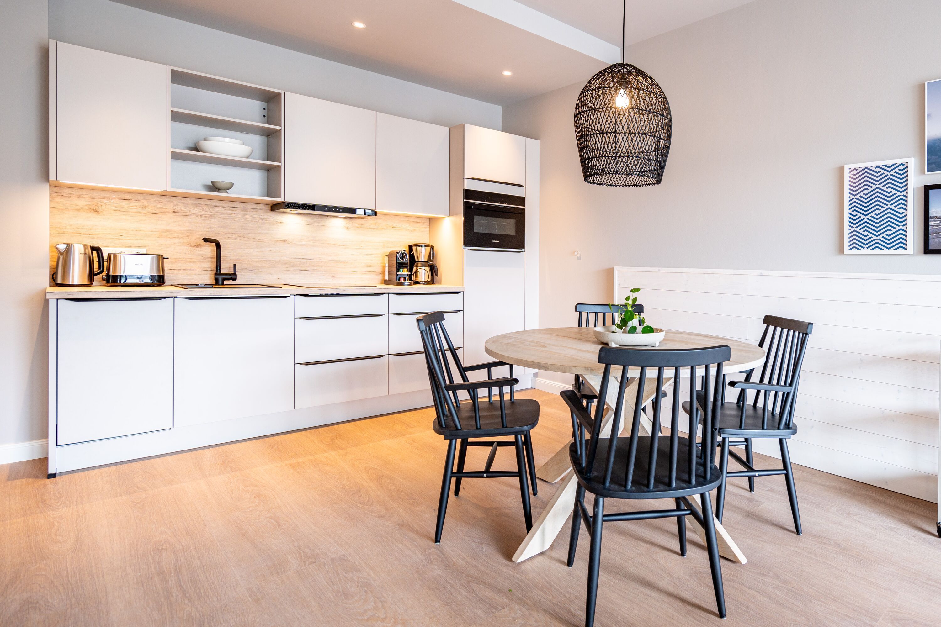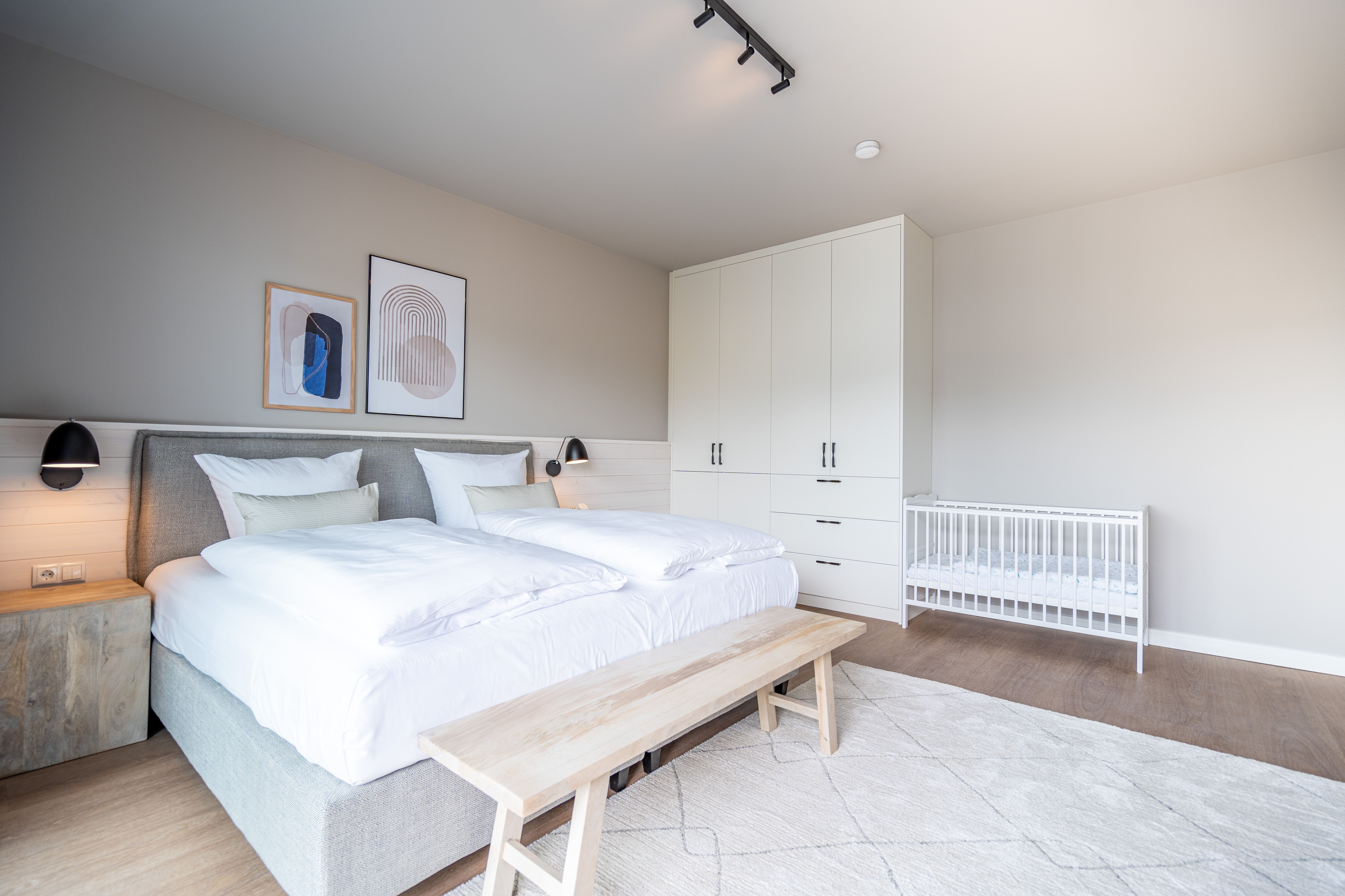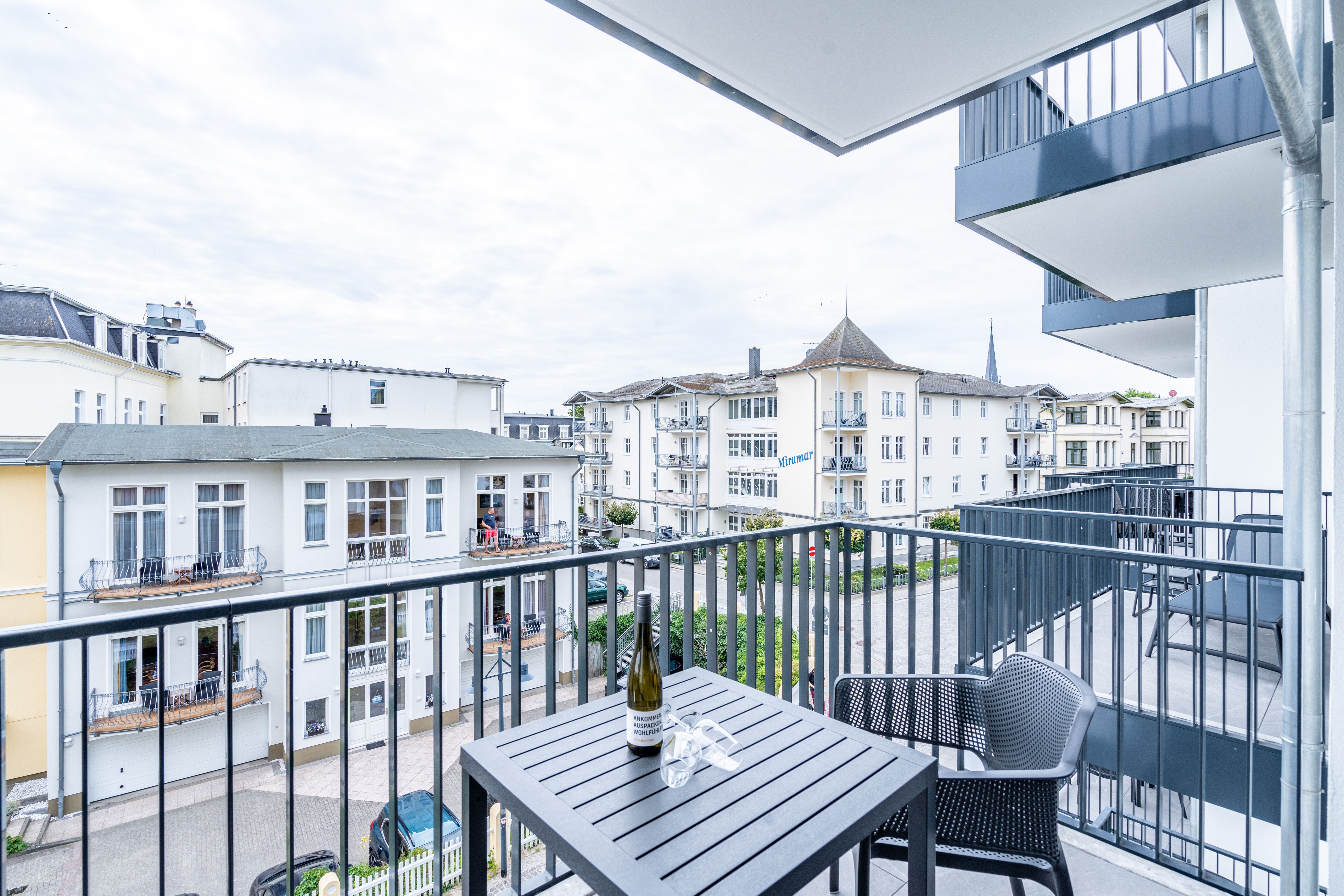 Direkt an der Ostsee mit Blick aufs Wasser mehr Meer geht nicht. Diese stilvolle 2-Raum-Wohnung B 2.3 im zweiten Obergeschoss der Strandterrasse ist mit ihren 77 Quadratmeter ein ideales Urlaubsparadies für bis zu 2 Personen und 1 Kleinkind im Babybett. Hier können Sie gleich von zwei Balkonen die Ahlbecker Seebrücke und die dahinter liegende Ostsee genießen. Dazu bietet das Appartement alle Annehmlichkeiten, die Sie sich wünschen. Das großzügige Wohn-Esszimmer mit der integrierten, offenen Küche ist ein kleines Wohlfühlreich der Extraklasse. Komfortable und stylische Möbel im skandinavischen Design sorgen dafür, dass Sie sich hier rundum geborgen fühlen. Zum ausgiebigen Entspannen vor dem Elektrokamin (ohne Wärmeabgabe) eignet sich das tolle Sofa oder der Sessel bestens. Filmabende werden dank des großen Flat-TV (50 Zoll) zu Heimkinoerlebnissen. Ein gemütlicher Essplatz für 4 Personen lädt zum Verweilen ein, während eine Arbeitsstation den Raum funktional ergänzt. Die Küchenzeile ist mit allem ausgestattet, was man zum Kochen und Zubereiten der Mahlzeiten brauchen kann. Dazu gehören moderne Elektrogeräte wie ein Backofen, ein 3-Platten-Induktionsherd oder eine Nespresso-Kapselmaschine. Der Zugang zum ersten Süd-Ost-Balkon bietet einen herrlichen Ausblick und ist mit einem Gartentisch und 2 Stühlen ausgestattet. Auf den zweiten Süd-Ost-Balkon können Sie vom Schlafzimmer aus hinaustreten. Auf der dortigen Gartenliege können Sie sich wunderbar an der frischen Brise erfreuen, die vom Meer herüberweht. Das Schlafzimmer verfügt über ein großes Boxspringdoppelbett (2,00m x 2,00m), ein festes Babybett, einen großen Kleiderschrank und einen Flat-TV (50 Zoll). Ihr Badezimmer wird an ungemütlichen Tagen zu einer kleinen Wellnessoase. Denn es verfügt neben der Dusche, dem Waschtisch und dem WC über eine Infrarotsaunakabine, die Auszeitabende in kuschelige Mußestunden verwandelt. In der Tiefgarage gehört zu Ihrer Wohnung ein PKW-Stellplatz. Herzlich Willkommen in dieser charmanten Ferienwohnung. Wir wünschen Ihnen hier eine wunderbar erholsame Zeit.