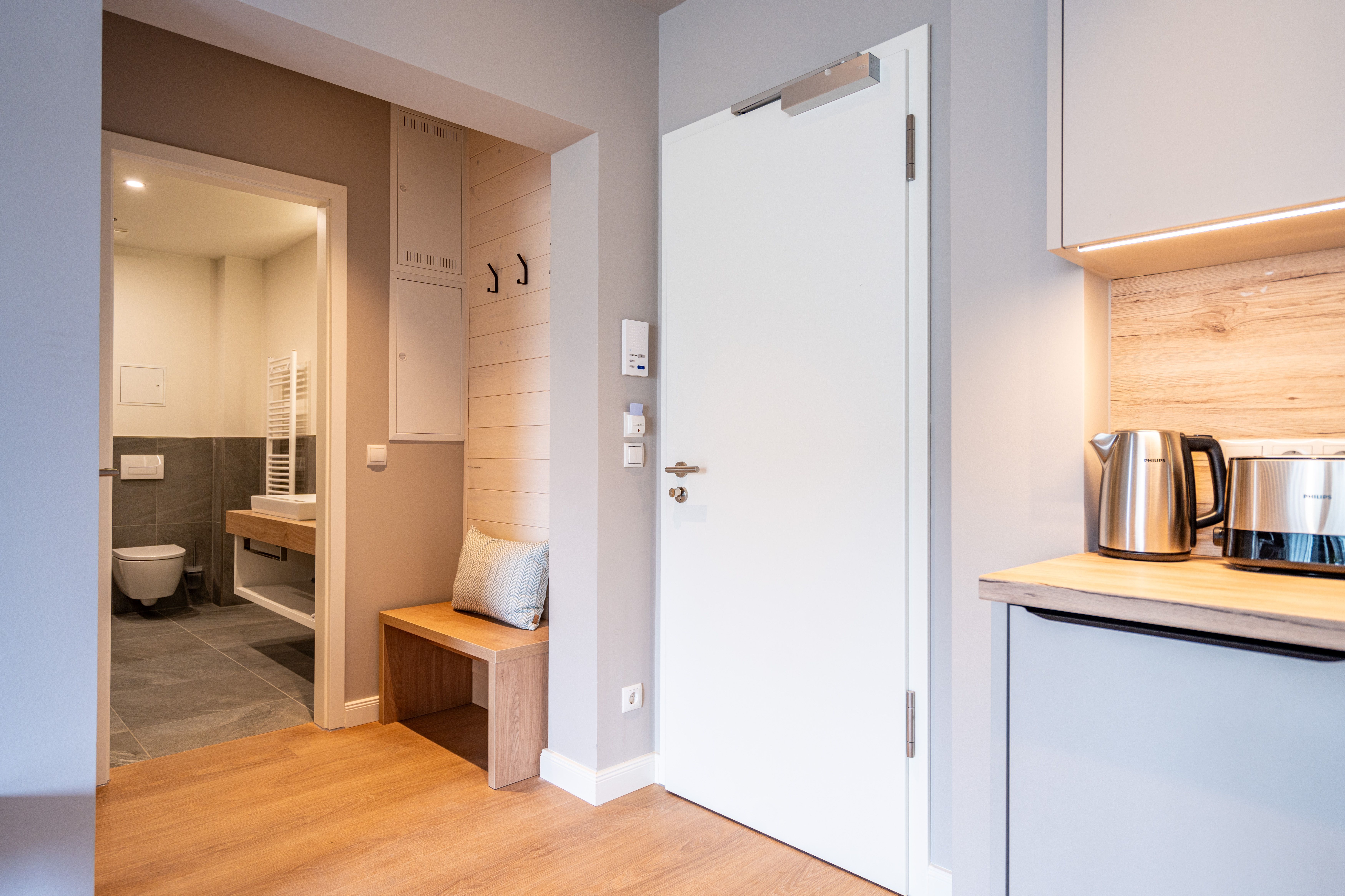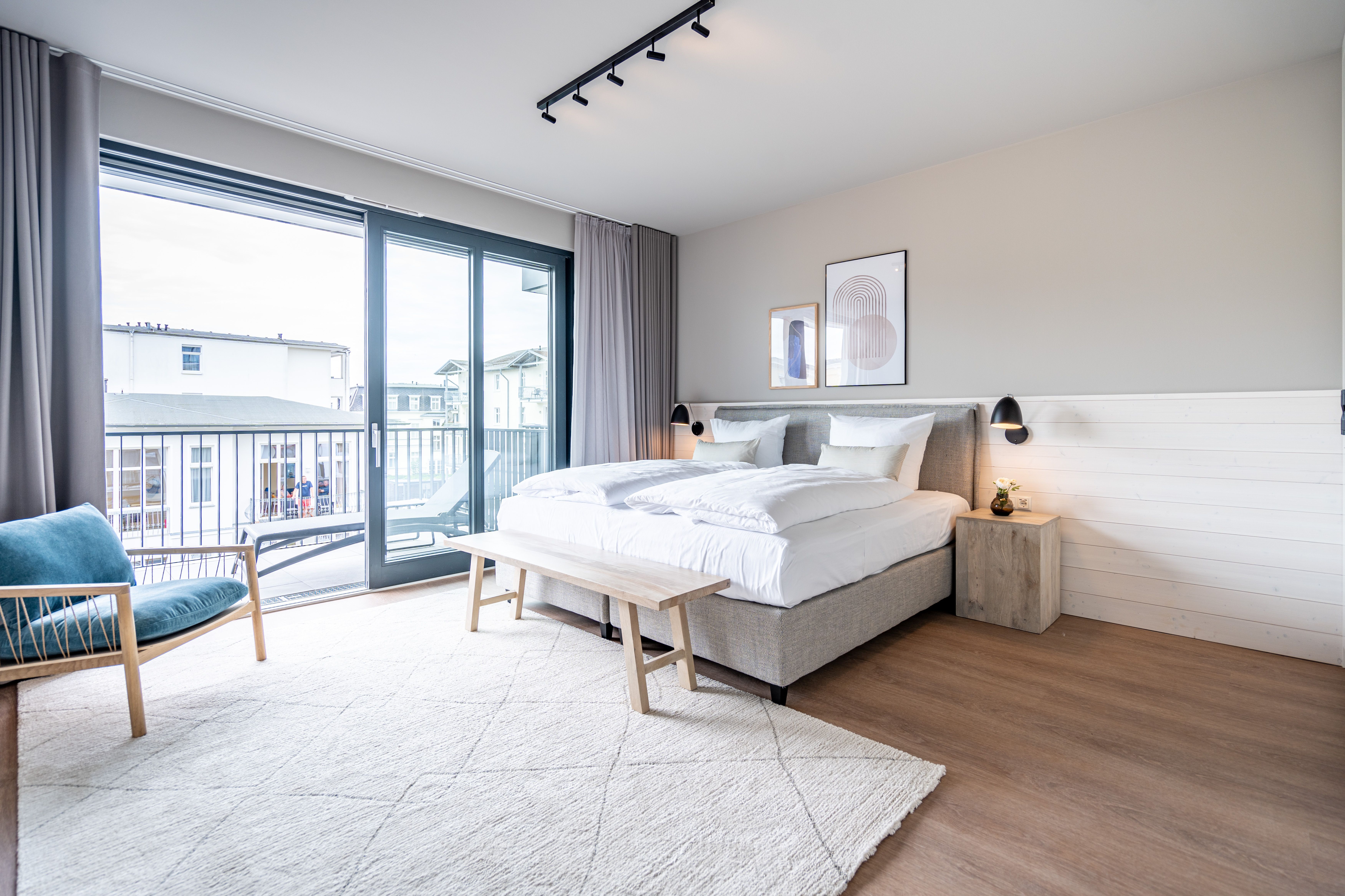 Die 2024 fertig gestellte Strandterrasse liegt direkt an der belebten Strandpromenade und bietet einen einzigartigen Ausblick auf die Grand Dame der historischen Seebrücken sowie die historische Konzertmuschel, einem beliebten Treffpunkt für Kunst und Kultur. Dahinter liegt die Ostsee ein Panorama, das zu den schönsten in den Kaiserbädern gehört. Es ist wie das Abtauchen in eine andere Zeit. In eine Zeit, in der man mit Stock, Sonnenschirm und Hut fürs „Sehen und gesehen werden“ über die Promenade schlenderte; aber auch in eine Zeit, in der damals wie heute Zeit einmal für eine kurze Weile keine Rolle spielt. Weil man angekommen ist im Loslassen, Entspannen und Genießen. Es ist dieser besondere Geruch nach Meeresluft und Freiheit, der in Erinnerung bleibt. Dazu die Bilder, die man mitnimmt. Von langen Strandspaziergängen, vom Lachen in fröhlich schäumenden Ostseewellen, von der Zeit in einem wunderschönen Urlaubsdomizil. Denn genau das ist die Strandterrasse mit ihren 56 modernen und exklusiven Ferienappartements direkt gegenüber der Ahlbecker Seebrücke. Die Ein-, Zwei- oder Dreizimmerwohnungen zwischen 40 und 70 Quadratmeter groß sind von einer Innenarchitektin gemeinsam mit unserem Erfahrungsschatz an Gästewünschen mit viel Liebe zum Detail und ganz individuell konzipiert worden. Entspannung und Wohlfühlen stehen an erster Stelle. Alles ist aufeinander abgestimmt und sorgt für eine gemütliche Atmosphäre. Wählen Sie zwischen einem Domizil in einem hellen, sandfarbenen Designkonzept oder einem Appartement mit anthrazitfarbenen Farbakzenten. Alle Appartements verfügen gleichermaßen über eine stilvolle und komfortable Einrichtung, die passgenau angefertigt worden ist, sowie über moderne Küchen und Bäder. Jedem Schlafzimmer ist ein eigenes Bad mit Dusche zugeordnet (außer App. B4.5). Die Appartements besitzen fast alle einen Balkon viele schauen sogar zur Ostsee hinaus. Die meisten Feriendomizile haben einen Elektrokamin und Infrarotsaunen. Im Erdgeschoss befindet sich ein separater Gemeinschaftsraum für Fahrräder. Außerdem besteht die Möglichkeit, im Gemeinschaftswaschraum 2 Waschmaschinen & Trockner zu nutzen. Ergänzt wird das Angebot durch eine Gemeinschaftssauna, die täglich von 11:00 bis 22:00 Uhr nutzbar ist. In der Tiefgarage (Einfahrtshöhe 2,03 Meter) steht für jede Wohnung 1 Pkw-Stellplatz zur Verfügung. Ist alles zur Zufriedenheit untergebracht? Dann kann der Urlaub ja beginnen. Und beim Blick vom Balkon über die Ostsee treffen sich zum Sonnenaufgang das Heute und das Damals. Gelassenheit legt sich beim Gang hinunter an den Strand auf die Seele. Jetzt darf die Zeit stehenbleiben.