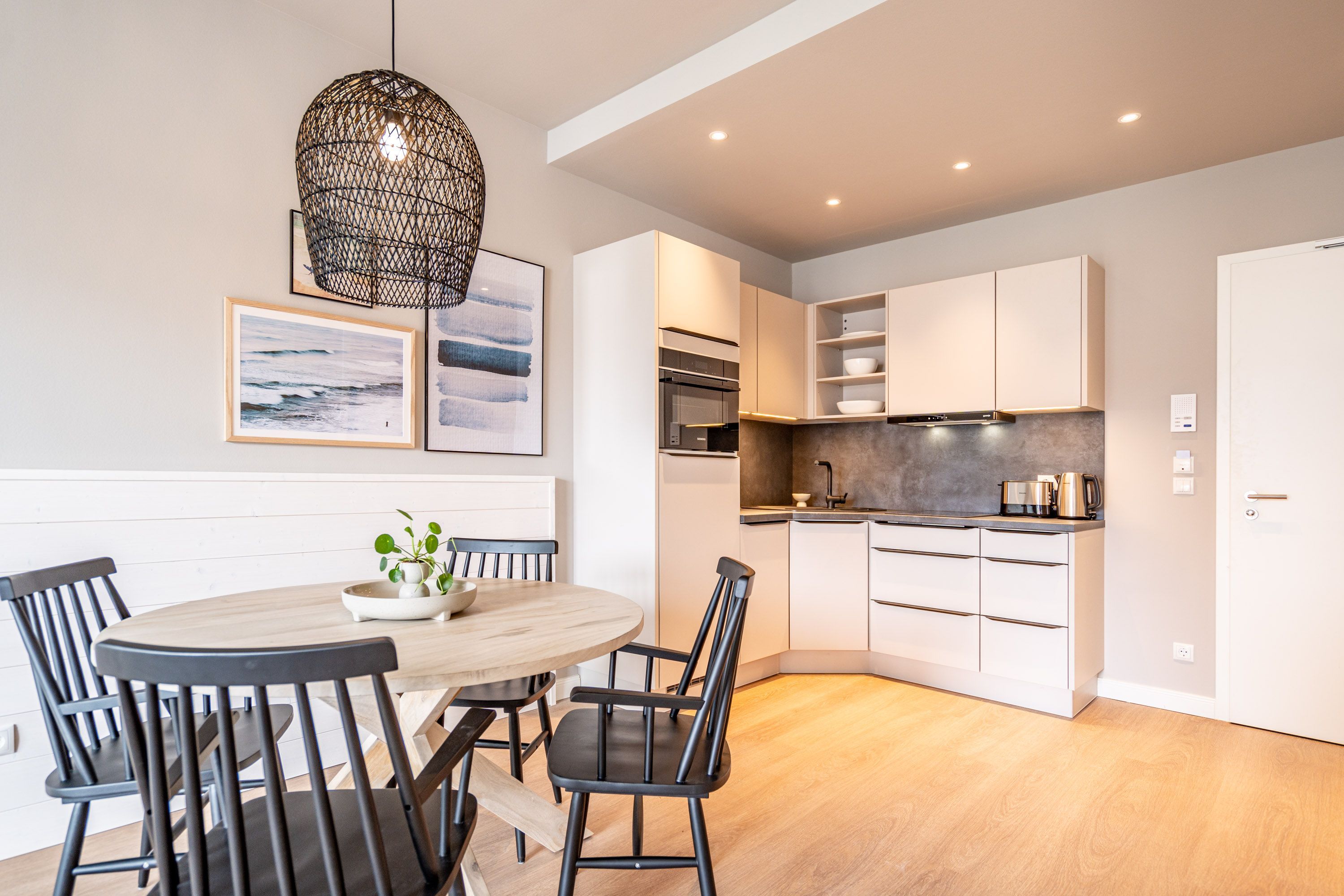 Willkommen im 2-Raum-Appartement B 2.6 (Haus B) in der Strandterrasse. Mittendrin, statt nur dabei können Sie bei diesem wunderschönen und gemütlichen Auszeitdomizil zu Recht sagen. Denn es befindet sich nur 80 Meter von der Ahlbecker Promenade und vom Strand entfernt. Die 53 Quadratmeter sind ein kuscheliges Auszeitzuhause für zwei Personen. Eine luftig leichte Atmosphäre empfängt Sie. Denn durch die großen Fenster fällt viel Licht in die Räume. Die Einrichtung ist in nordischem Design gehalten und birgt das Potential für viel Entspannung und Ruhe. Machen Sie es sich auf dem stylischen Sofa gemütlich. Genießen Sie den Blick auf den Elektrokamin (ohne Wärmeabgabe). Ein großer Flat-TV (50 Zoll) sorgt für echtes Heimkinofeeling. Vom Wohnzimmer aus haben Sie Zugang zum Süd-West-Balkon mit einem Tisch und zwei Stühlen. Auf ihm können Sie sich an der Sonnenseite der Insel erfreuen. Ob Frühstück oder Abendessen – wenn das Wetter mitspielt, schmeckt es unter freiem Himmel doch gleich nochmal so gut. Zubereiten können Sie die Mahlzeiten in der zum Wohnzimmer hin offenen Küche. Sie ist mit hochwertigen Elektrogeräten und allem zum Kochen Nötigen voll ausgestattet. Ein schöner Esstisch lädt zu gemeinsamen Genuss-und Mußestunden ein. Doch zum Wichtigsten im Urlaub zählt bekanntlich ein erholsamer Schlaf. Das komfortable Boxspringdoppelbett (1,80m x 2,00m) im geräumigen Schlafzimmer bringt sie perfekt in süße Träume. Das Zimmer ist zudem mit einem Kleiderschrank und ebenfalls mit einem Flat-TV (50 Zoll) eingerichtet. Ein modernes Duschbad mit Waschtisch, Infrarotsaunakabine und WC komplettiert das Angebot. Zur Wohnung gehört ein PKW-Stellplatz in der Tiefgarage. Sie müssen also nur noch ankommen. Das Wohlfühlen setzt dann automatisch ein, wenn Sie die stilvolle Ferienwohnung betreten.