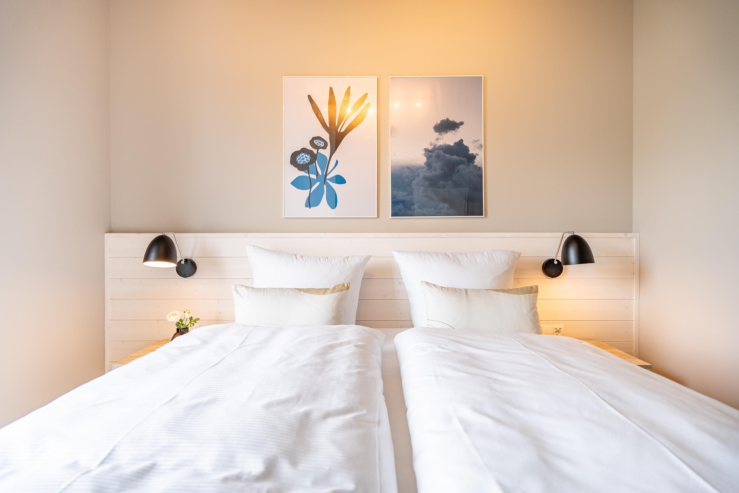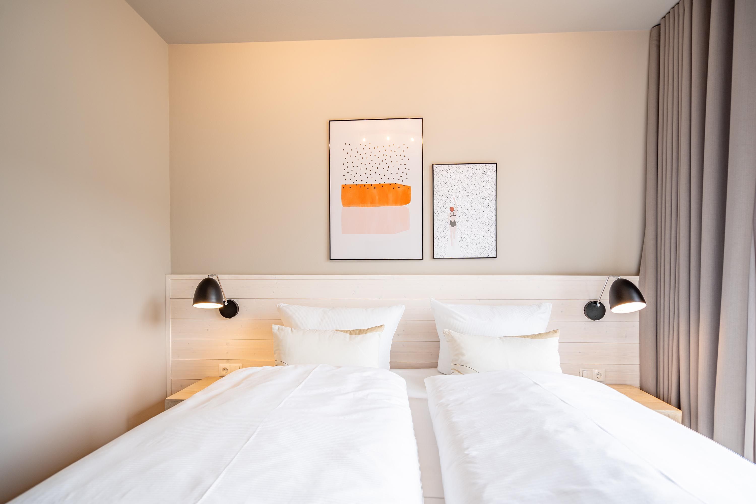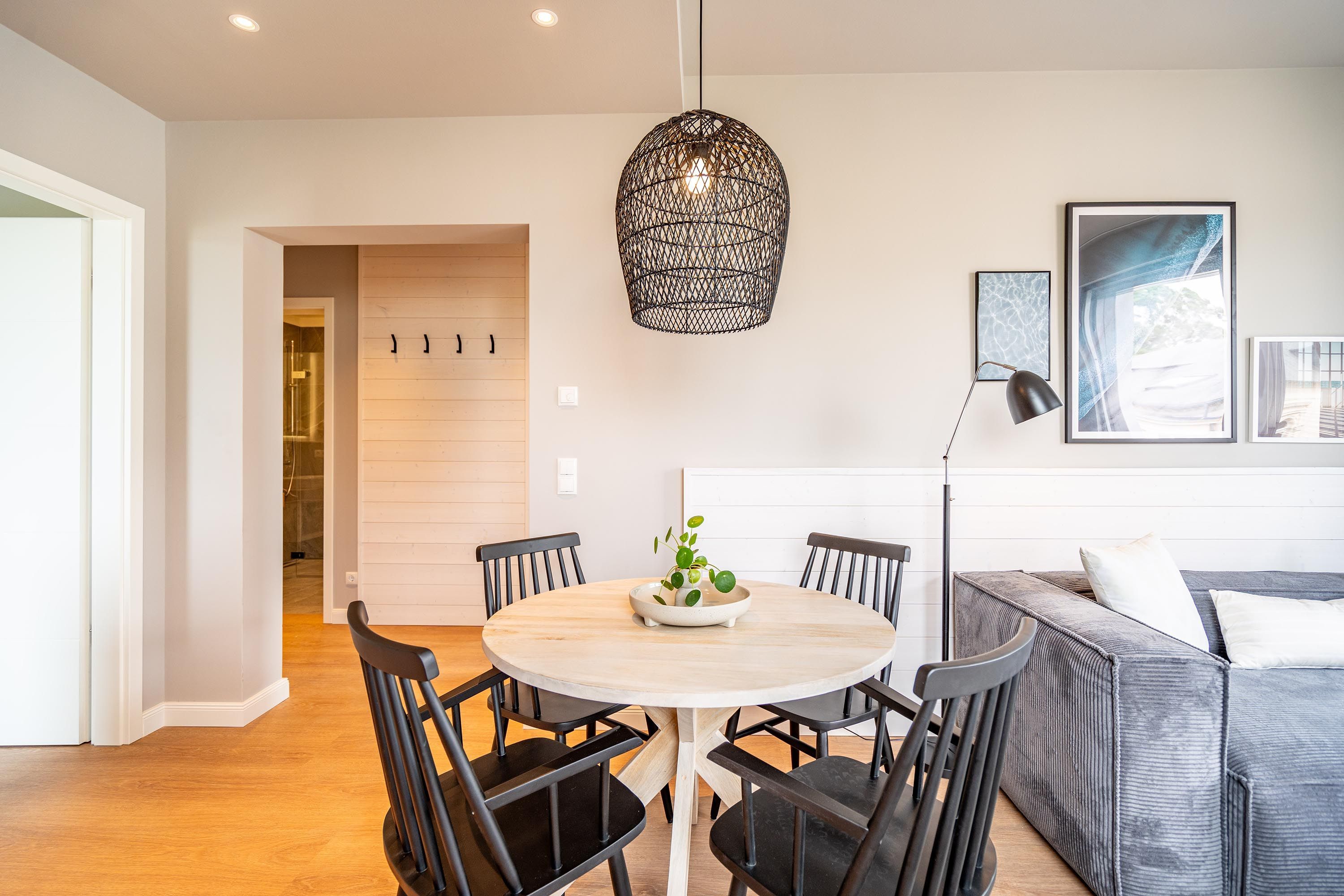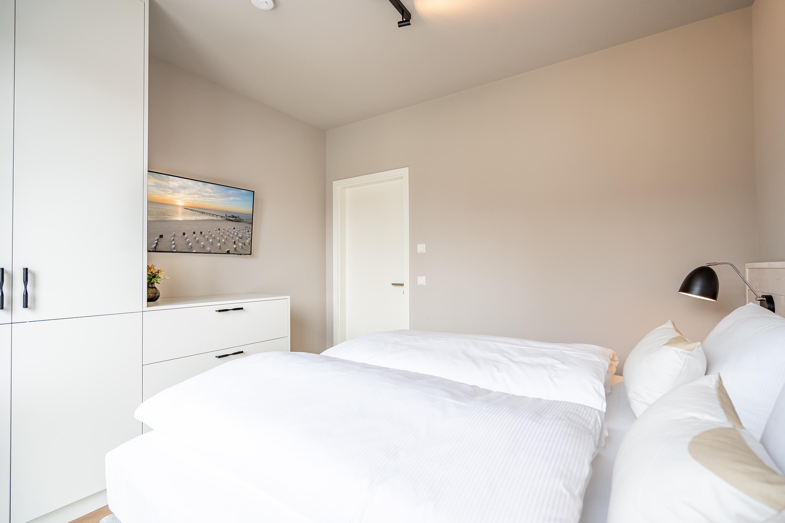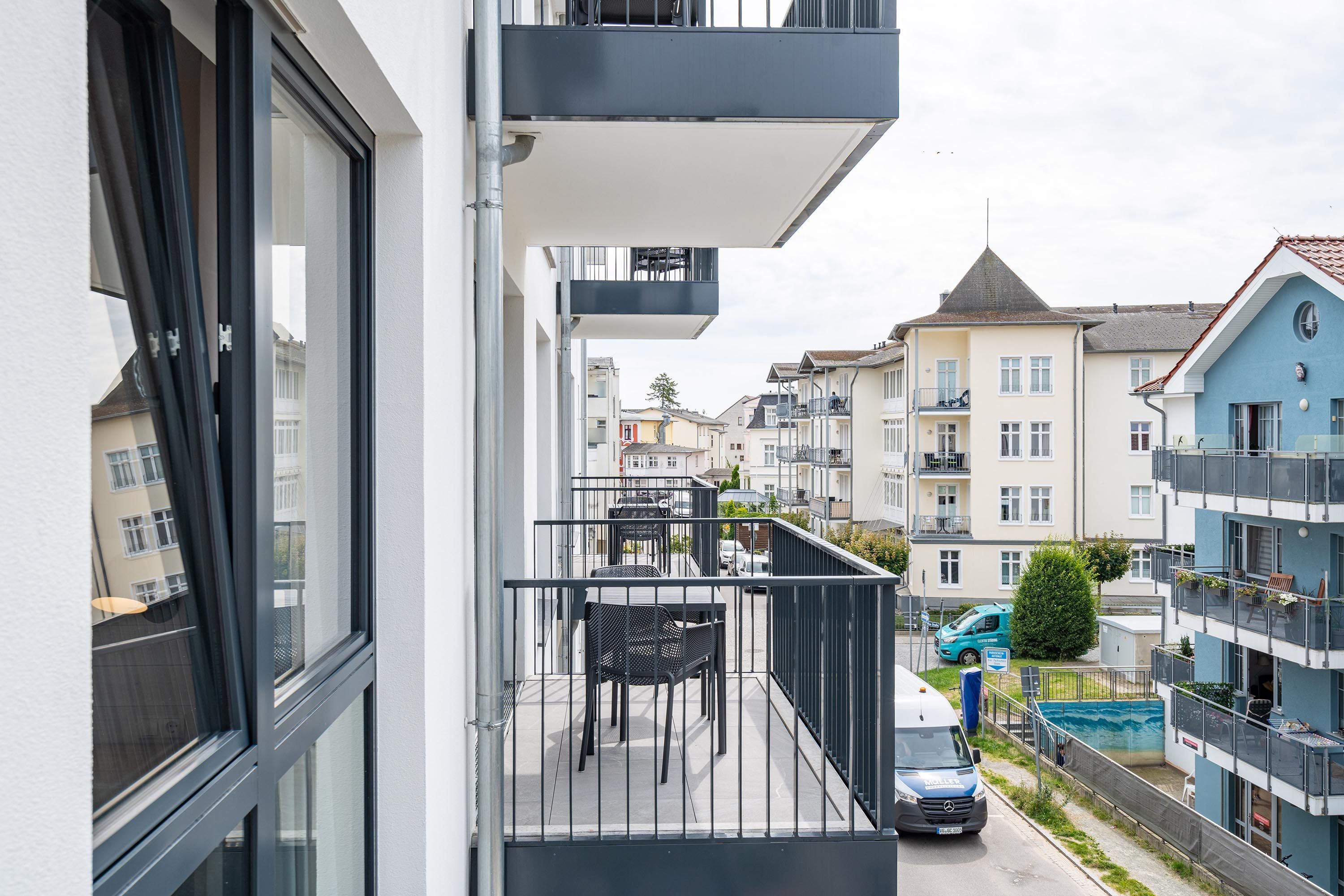 Für alle Ostseesehnsüchtigen wird das 3-Raum-Appartement B 2.7 (Haus B) in der 2. Etage der Strandterrasse das absolute Traumauszeitdomizil sein. Ein wunderschönes und kuscheliges Designkonzept, eine moderne und hochwertige Ausstattung und die Nähe zur Ostsee sprechen für sich. Die 58 Quadratmeter bieten Platz für bis zu 4 Personen. Doch finden Sie hier nicht nur einen Platz zum Schlafen, sondern einen Ort zum Wohlfühlen und Runterkommen. Das Sofa und der Sessel sind eine wunderbare Kuschelzone zum Filme schauen auf dem großen Flat-TV (50 Zoll) oder zum Träumen vor dem Elektrokamin (ohne Wärmeabgabe). Die offene Küche ist mit hochwertigen Elektrogeräten wie einem Backofen, einem 4-Platten-Induktionsherd, Toaster, Kaffeemaschine und sogar einer Nespresso-Kapselmaschine ausgestattet. Einem gemeinsamen Kochvergnügen steht also nichts im Weg. Die Mahlzeiten verköstigen, können Sie am schönen, großen Esstisch. Sie wollen sich schon am Morgen die Ostseebrise um die Nase wehen lassen? Der Balkon mit Süd-West-Ausrichtung bietet einen herrlichen Blick auf die wunderschönen Villen des alten Seebades. Genießen Sie auf ihm die romantischen Sonnenuntergänge am Tisch mit 4 Stühlen. Die Wohnung verfügt über zwei Schlafzimmer, jedes mit einem komfortablen Boxspringdoppelbett (1,80m x 2,00m), einem Kleiderschrank und einer Kommode ausgestattet sowie einem Flat-TV (43 Zoll). Zwei moderne Badezimmer mit Natursteinverkleidung verfügen jeweils über einen Waschtisch, Dusche und WC. Ein PKW-Stellplatz in der Tiefgarage sorgt für bequemes Parken. Kommen Sie gut an in Ihrer Auszeit am Meer.