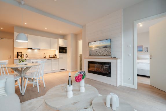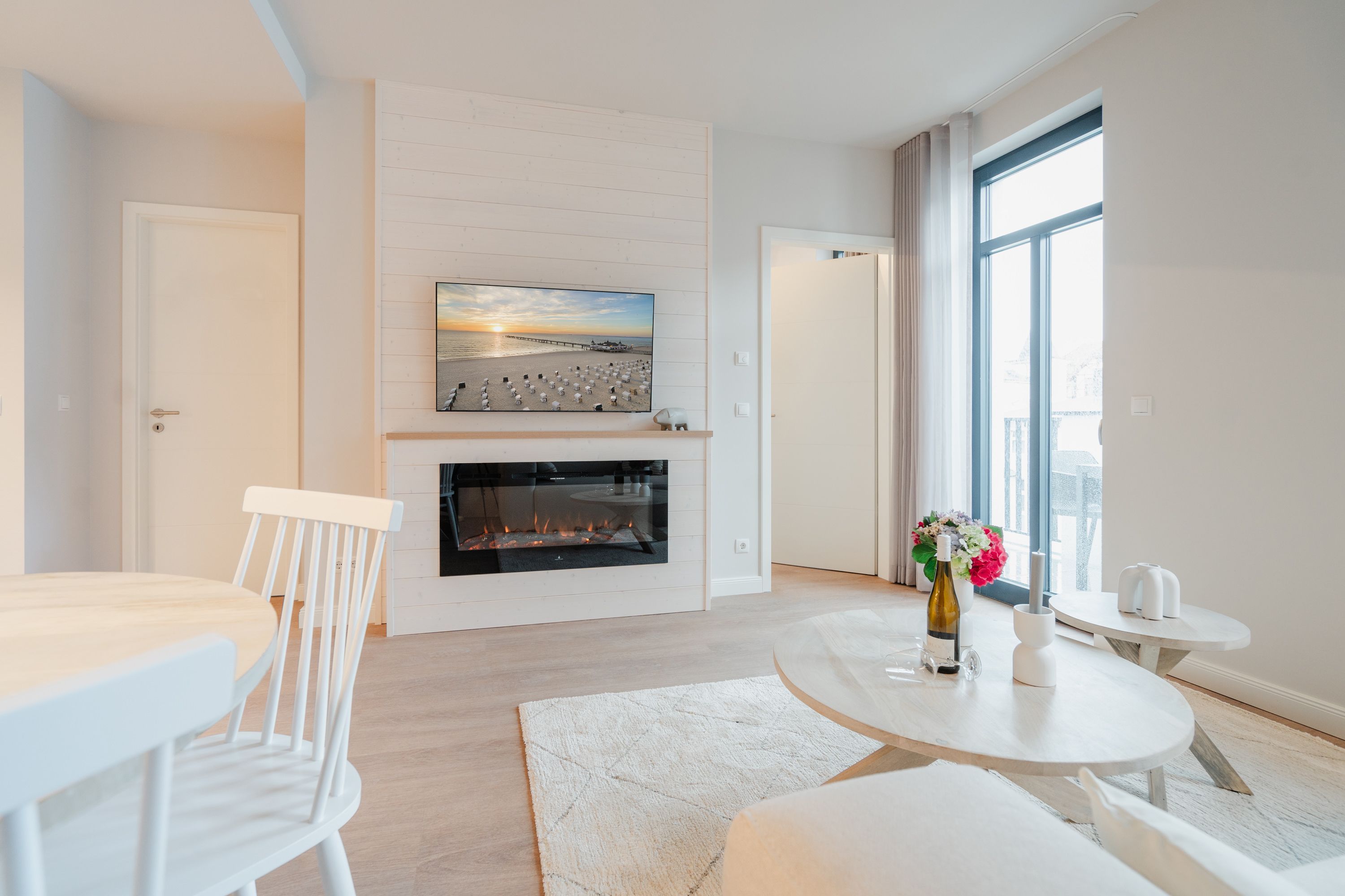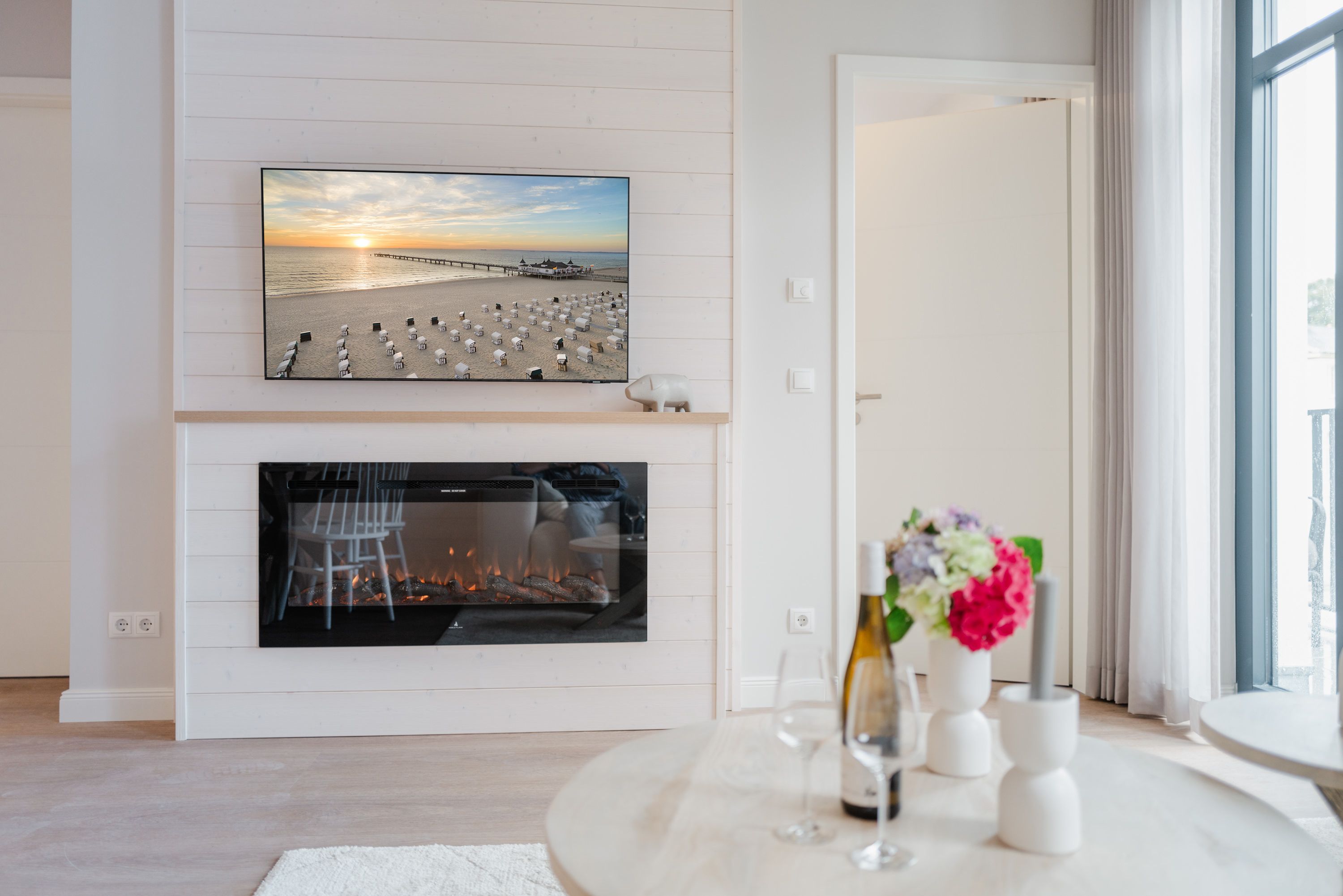 Modernes Wohndesign empfängt Sie auf den 49 Quadratmetern dieses wunderschönen 2-Raum-Appartements im zweiten Obergeschoss. Sie wünschen sich nichts sehnlicher, als einmal für ein paar Tage den Alltag hinter sich zu lassen und den Kopf bei einer frischen Meeresbrise auszuschalten? Für 2 Personen ist dieses Appartement ein kleines Urlaubsparadies. Das gesamte Wohnkonzept ist perfekt auf Ihre Bedürfnisse abgestimmt. Harmonie und Wohlfühlen stehen an oberster Stelle. Hochwertige Möbel, helle Naturtöne und mit viel Liebe ausgesuchte Accessoires – hier ist alles exklusiv auf Wohlgefühl ausgerichtet. Denn wir wollen, dass Sie sich rundum gut aufgehoben fühlen. Der offene Wohn- und Essbereich lädt zum Verweilen ein und ist mit einer voll ausgestatteten Küchenzeile mit hochwertigen Siemens-Elektrogeräten ausgestattet, darunter ein Backofen, eine Spülmaschine und ein 3-Zonen-Induktionsherd. Am schönen Esstisch können Sie genießen, reden, spielen oder einfach zusammensitzen. Gleiches gilt für das gemütliche Sofa, das dazu einlädt, sich zurückzulehnen und einen spannenden Film auf dem 50-Zoll-Flachbildfernseher zu schauen. Der Elektro-Kamin schafft auch an lauen Sommerabenden eine urige Atmosphäre, denn er gibt keine Wärme ab, dafür aber umso mehr Gemütlichkeit. Sowohl vom Wohnzimmer als auch vom Schlafzimmer aus haben Sie einen Zugang auf den Nord-West-Balkon mit seitlichem Blick zur Ostsee. Genießen Sie in den bequemen Gartenmöbeln entspannte Stunden mit Meeresrauschen. Ein komfortables Boxspringdoppelbett (1,80m x 2,00m) sorgt im Schlafzimmer für erholsame Schlummerstunden. Auch hier befindet sich ein 43-Zoll-Flachbildfernseher. Ein Kleiderschrank und eine Kommode bieten ausreichend Stauraum. Im Tageslichtbad spendet eine Dusche Erfrischung von den Urlaubsaktivitäten. Außerdem ist das Bad mit einem WC und einen Waschtisch ausgestattet. Ihr Auto können Sie auf dem zum Appartement gehörenden PKW-Stellplatz in der Tiefgarage abstellen. Und jetzt? Wartet Ihr Urlaubsdomizil nur noch auf Ihre vorfreudige Ankunft.