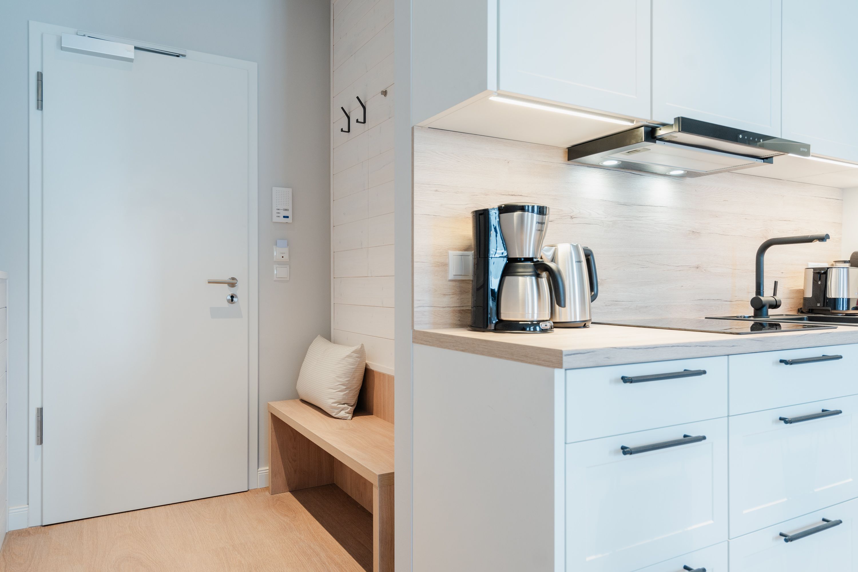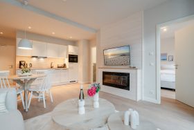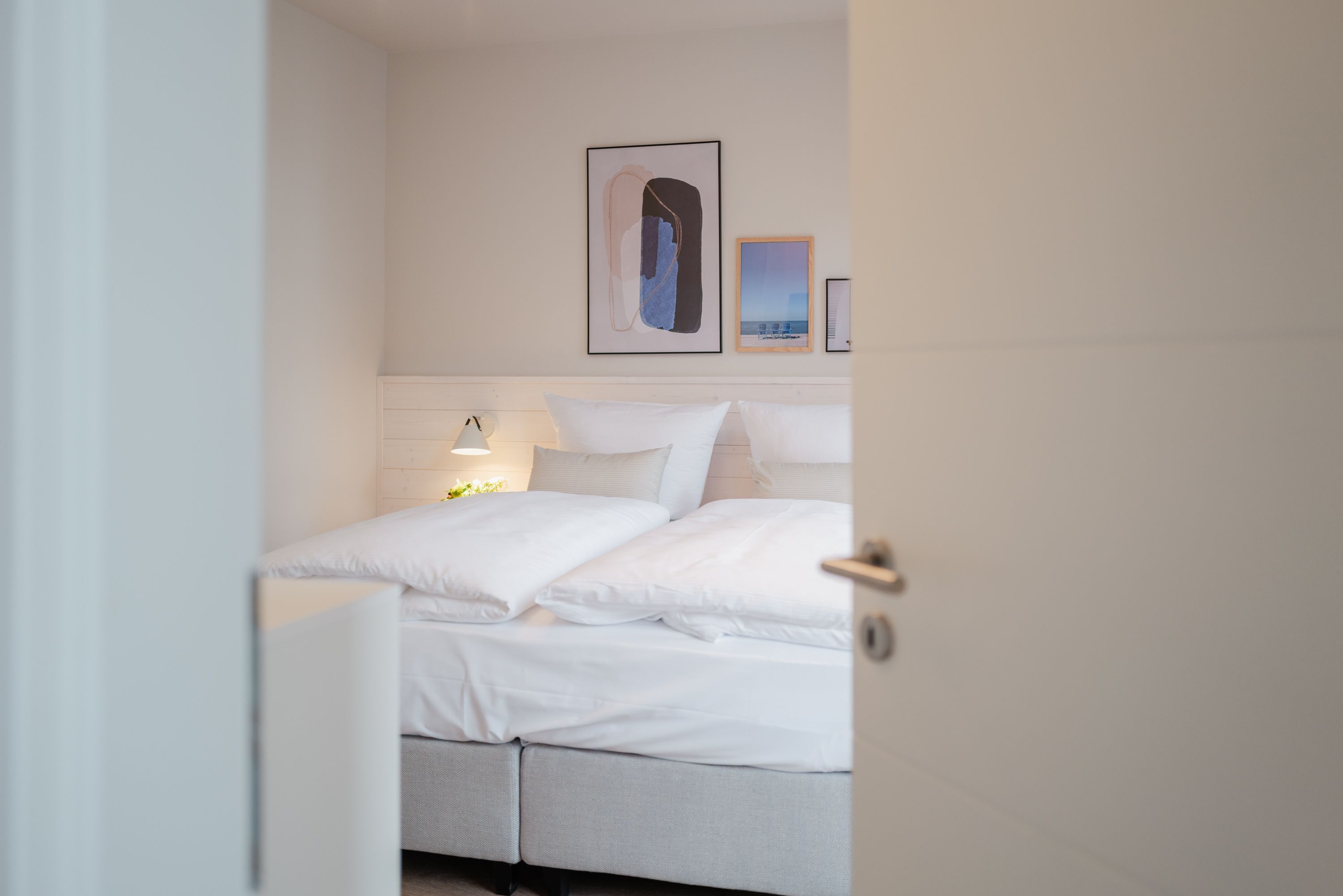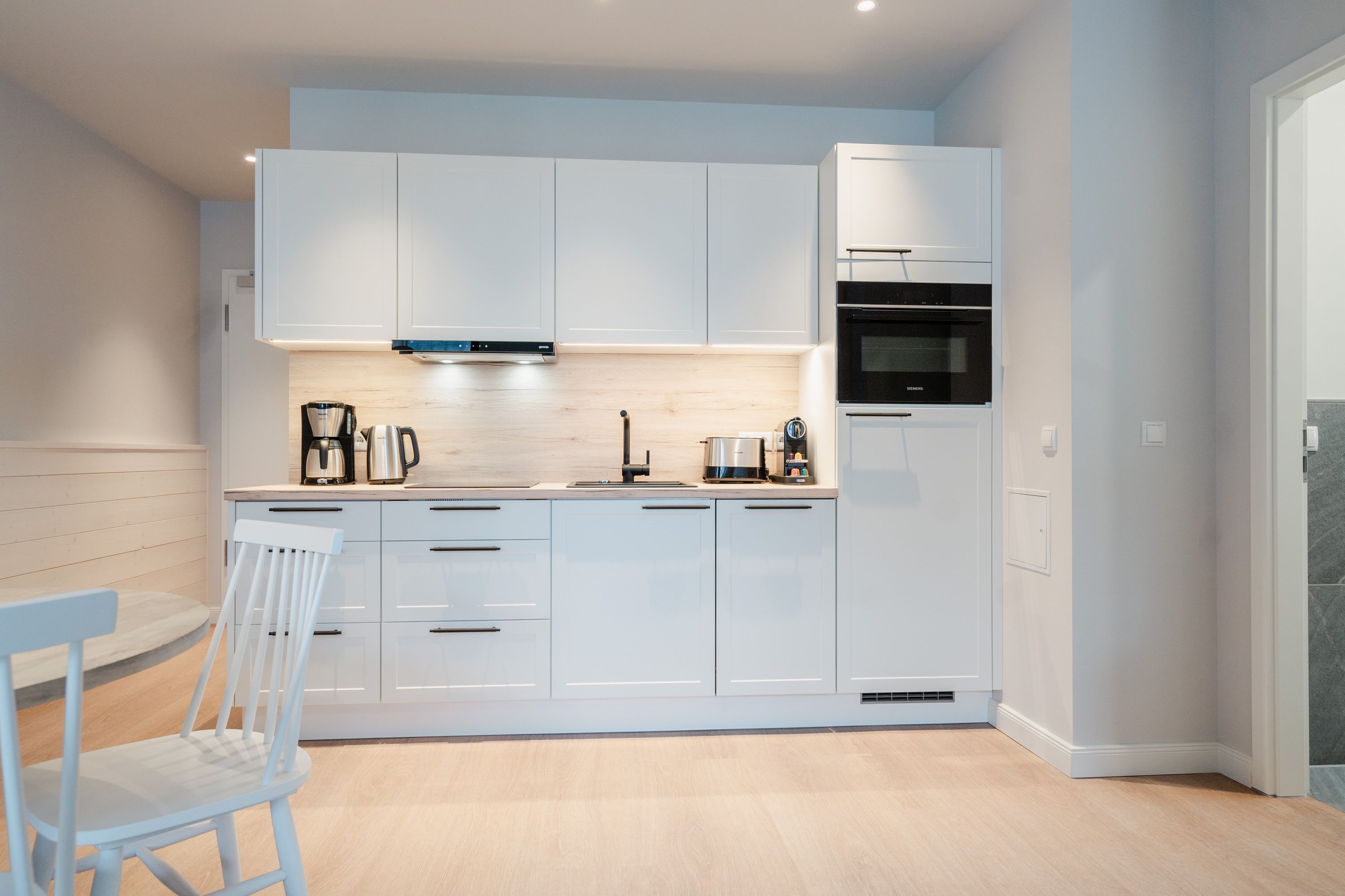 Modernes Wohndesign empfängt Sie auf den 49 Quadratmetern dieses wunderschönen 2-Raum-Appartements im zweiten Obergeschoss. Sie wünschen sich nichts sehnlicher, als einmal für ein paar Tage den Alltag hinter sich zu lassen und den Kopf bei einer frischen Meeresbrise auszuschalten? Für 2 Personen ist dieses Appartement ein kleines Urlaubsparadies. Das gesamte Wohnkonzept ist perfekt auf Ihre Bedürfnisse abgestimmt. Harmonie und Wohlfühlen stehen an oberster Stelle. Hochwertige Möbel, helle Naturtöne und mit viel Liebe ausgesuchte Accessoires – hier ist alles exklusiv auf Wohlgefühl ausgerichtet. Denn wir wollen, dass Sie sich rundum gut aufgehoben fühlen. Der offene Wohn- und Essbereich lädt zum Verweilen ein und ist mit einer voll ausgestatteten Küchenzeile mit hochwertigen Siemens-Elektrogeräten ausgestattet, darunter ein Backofen, eine Spülmaschine und ein 3-Zonen-Induktionsherd. Am schönen Esstisch können Sie genießen, reden, spielen oder einfach zusammensitzen. Gleiches gilt für das gemütliche Sofa, das dazu einlädt, sich zurückzulehnen und einen spannenden Film auf dem 50-Zoll-Flachbildfernseher zu schauen. Der Elektro-Kamin schafft auch an lauen Sommerabenden eine urige Atmosphäre, denn er gibt keine Wärme ab, dafür aber umso mehr Gemütlichkeit. Sowohl vom Wohnzimmer als auch vom Schlafzimmer aus haben Sie einen Zugang auf den Nord-West-Balkon mit seitlichem Blick zur Ostsee. Genießen Sie in den bequemen Gartenmöbeln entspannte Stunden mit Meeresrauschen. Ein komfortables Boxspringdoppelbett (1,80m x 2,00m) sorgt im Schlafzimmer für erholsame Schlummerstunden. Auch hier befindet sich ein 43-Zoll-Flachbildfernseher. Ein Kleiderschrank und eine Kommode bieten ausreichend Stauraum. Im Tageslichtbad spendet eine Dusche Erfrischung von den Urlaubsaktivitäten. Außerdem ist das Bad mit einem WC und einen Waschtisch ausgestattet. Ihr Auto können Sie auf dem zum Appartement gehörenden PKW-Stellplatz in der Tiefgarage abstellen. Und jetzt? Wartet Ihr Urlaubsdomizil nur noch auf Ihre vorfreudige Ankunft.