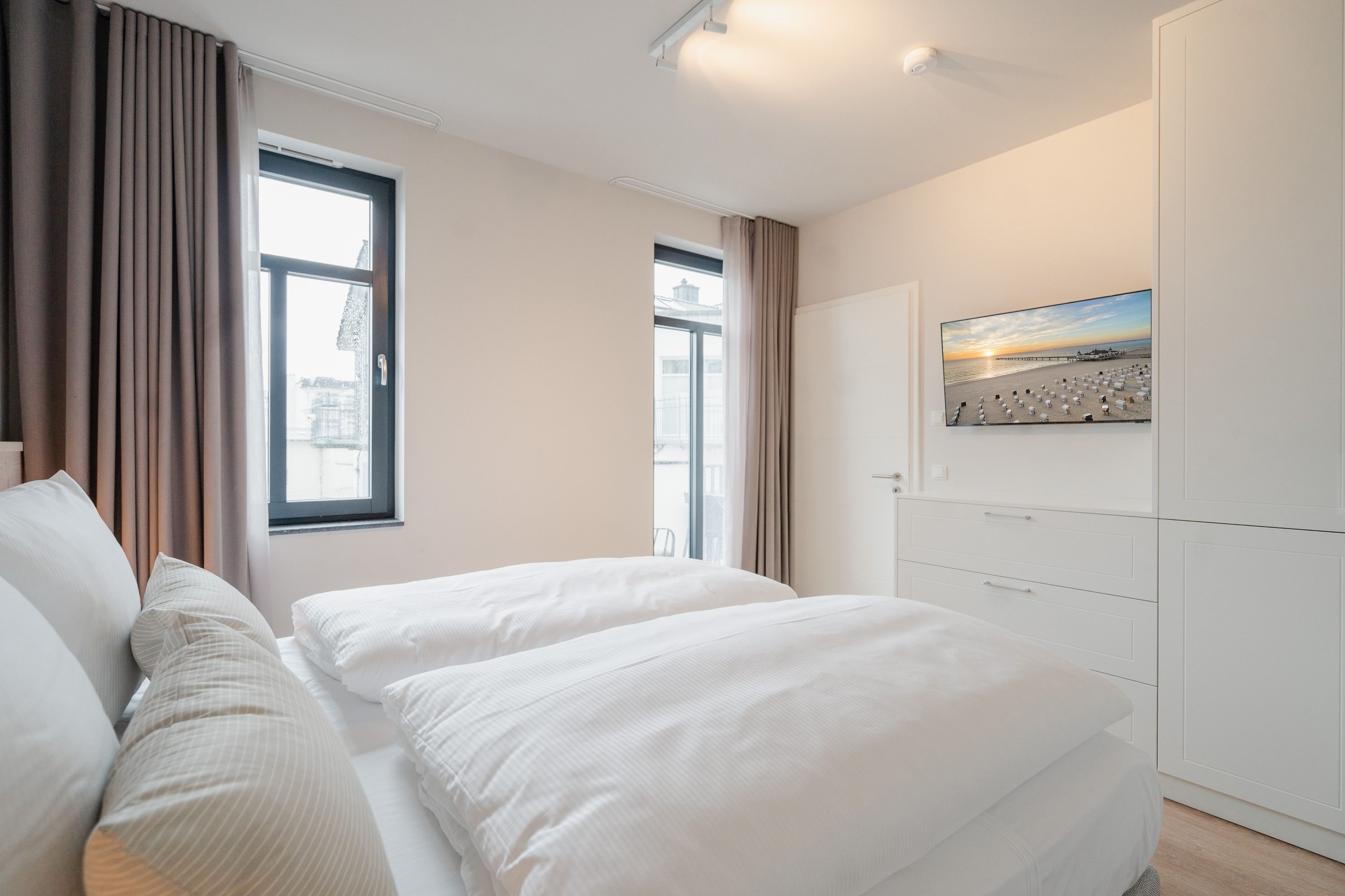 Modernes Wohndesign empfängt Sie auf den 49 Quadratmetern dieses wunderschönen 2-Raum-Appartements im zweiten Obergeschoss. Sie wünschen sich nichts sehnlicher, als einmal für ein paar Tage den Alltag hinter sich zu lassen und den Kopf bei einer frischen Meeresbrise auszuschalten? Für 2 Personen ist dieses Appartement ein kleines Urlaubsparadies. Das gesamte Wohnkonzept ist perfekt auf Ihre Bedürfnisse abgestimmt. Harmonie und Wohlfühlen stehen an oberster Stelle. Hochwertige Möbel, helle Naturtöne und mit viel Liebe ausgesuchte Accessoires hier ist alles exklusiv auf Wohlgefühl ausgerichtet. Denn wir wollen, dass Sie sich rundum gut aufgehoben fühlen. Der offene Wohn- und Essbereich lädt zum Verweilen ein und ist mit einer voll ausgestatteten Küchenzeile mit hochwertigen Siemens-Elektrogeräten ausgestattet, darunter ein Backofen, eine Spülmaschine und ein 3-Zonen-Induktionsherd. Am schönen Esstisch können Sie genießen, reden, spielen oder einfach zusammensitzen. Gleiches gilt für das gemütliche Sofa, das dazu einlädt, sich zurückzulehnen und einen spannenden Film auf dem 50-Zoll-Flachbildfernseher zu schauen. Der Elektro-Kamin schafft auch an lauen Sommerabenden eine urige Atmosphäre, denn er gibt keine Wärme ab, dafür aber umso mehr Gemütlichkeit. Sowohl vom Wohnzimmer als auch vom Schlafzimmer aus haben Sie einen Zugang auf den Nord-West-Balkon mit seitlichem Blick zur Ostsee. Genießen Sie in den bequemen Gartenmöbeln entspannte Stunden mit Meeresrauschen. Ein komfortables Boxspringdoppelbett (1,80m x 2,00m) sorgt im Schlafzimmer für erholsame Schlummerstunden. Auch hier befindet sich ein 43-Zoll-Flachbildfernseher. Ein Kleiderschrank und eine Kommode bieten ausreichend Stauraum. Im Tageslichtbad spendet eine Dusche Erfrischung von den Urlaubsaktivitäten. Außerdem ist das Bad mit einem WC und einen Waschtisch ausgestattet. Ihr Auto können Sie auf dem zum Appartement gehörenden PKW-Stellplatz in der Tiefgarage abstellen. Und jetzt? Wartet Ihr Urlaubsdomizil nur noch auf Ihre vorfreudige Ankunft.