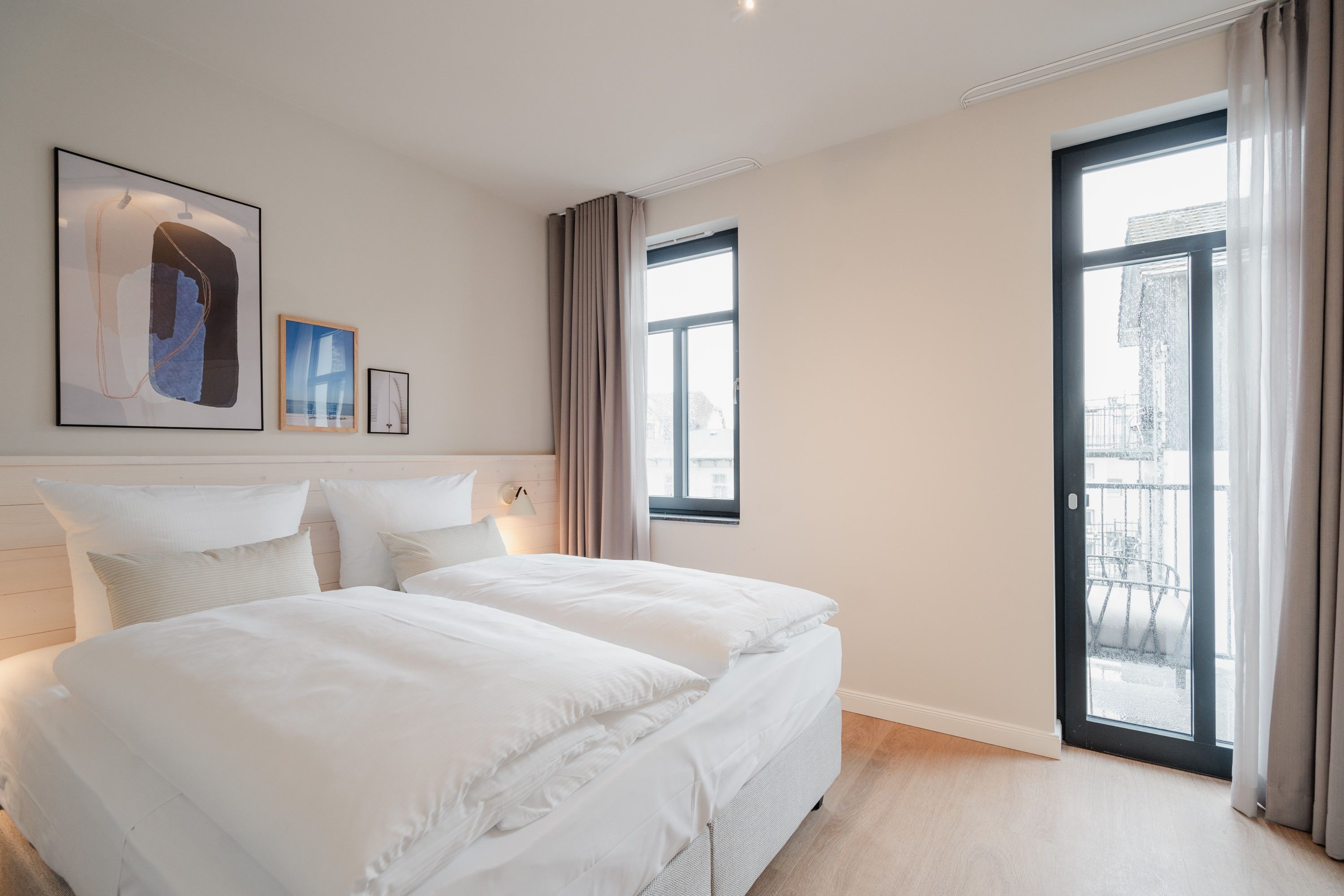 Die 2024 fertig gestellte Strandterrasse liegt direkt an der belebten Strandpromenade und bietet einen einzigartigen Ausblick auf die Grand Dame der historischen Seebrücken sowie die historische Konzertmuschel, einem beliebten Treffpunkt für Kunst und Kultur. Dahinter liegt die Ostsee – ein Panorama, das zu den schönsten in den Kaiserbädern gehört. Es ist wie das Abtauchen in eine andere Zeit. In eine Zeit, in der man mit Stock, Sonnenschirm und Hut fürs „Sehen und gesehen werden“ über die Promenade schlenderte; aber auch in eine Zeit, in der – damals wie heute – Zeit einmal für eine kurze Weile keine Rolle spielt. Weil man angekommen ist im Loslassen, Entspannen und Genießen. Es ist dieser besondere Geruch nach Meeresluft und Freiheit, der in Erinnerung bleibt. Dazu die Bilder, die man mitnimmt. Von langen Strandspaziergängen, vom Lachen in fröhlich schäumenden Ostseewellen, von der Zeit in einem wunderschönen Urlaubsdomizil. Denn genau das ist die Strandterrasse mit ihren 56 modernen und exklusiven Ferienappartements direkt gegenüber der Ahlbecker Seebrücke. Die Ein-, Zwei- oder Dreizimmerwohnungen – zwischen 40 und 70 Quadratmeter groß – sind von einer Innenarchitektin gemeinsam mit unserem Erfahrungsschatz an Gästewünschen mit viel Liebe zum Detail und ganz individuell konzipiert worden. Entspannung und Wohlfühlen stehen an erster Stelle. Alles ist aufeinander abgestimmt und sorgt für eine gemütliche Atmosphäre. Wählen Sie zwischen einem Domizil in einem hellen, sandfarbenen Designkonzept oder einem Appartement mit anthrazitfarbenen Farbakzenten. Alle Appartements verfügen gleichermaßen über eine stilvolle und komfortable Einrichtung, die passgenau angefertigt worden ist, sowie über moderne Küchen und Bäder. Jedem Schlafzimmer ist ein eigenes Bad mit Dusche zugeordnet (außer App. B4.5). Die Appartements besitzen fast alle einen Balkon – viele schauen sogar zur Ostsee hinaus. Die meisten Feriendomizile haben einen Elektrokamin und Infrarotsaunen. Im Erdgeschoss befindet sich ein separater Gemeinschaftsraum für Fahrräder. Außerdem besteht die Möglichkeit, im Gemeinschaftswaschraum 2 Waschmaschinen & Trockner zu nutzen. Ergänzt wird das Angebot durch eine Gemeinschaftssauna, die täglich von 11:00 bis 22:00 Uhr nutzbar ist. In der Tiefgarage (Einfahrtshöhe 2,03 Meter) steht für jede Wohnung 1 Pkw-Stellplatz zur Verfügung. Ist alles zur Zufriedenheit untergebracht? Dann kann der Urlaub ja beginnen. Und beim Blick vom Balkon über die Ostsee treffen sich zum Sonnenaufgang das Heute und das Damals. Gelassenheit legt sich beim Gang hinunter an den Strand auf die Seele. Jetzt darf die Zeit stehenbleiben.