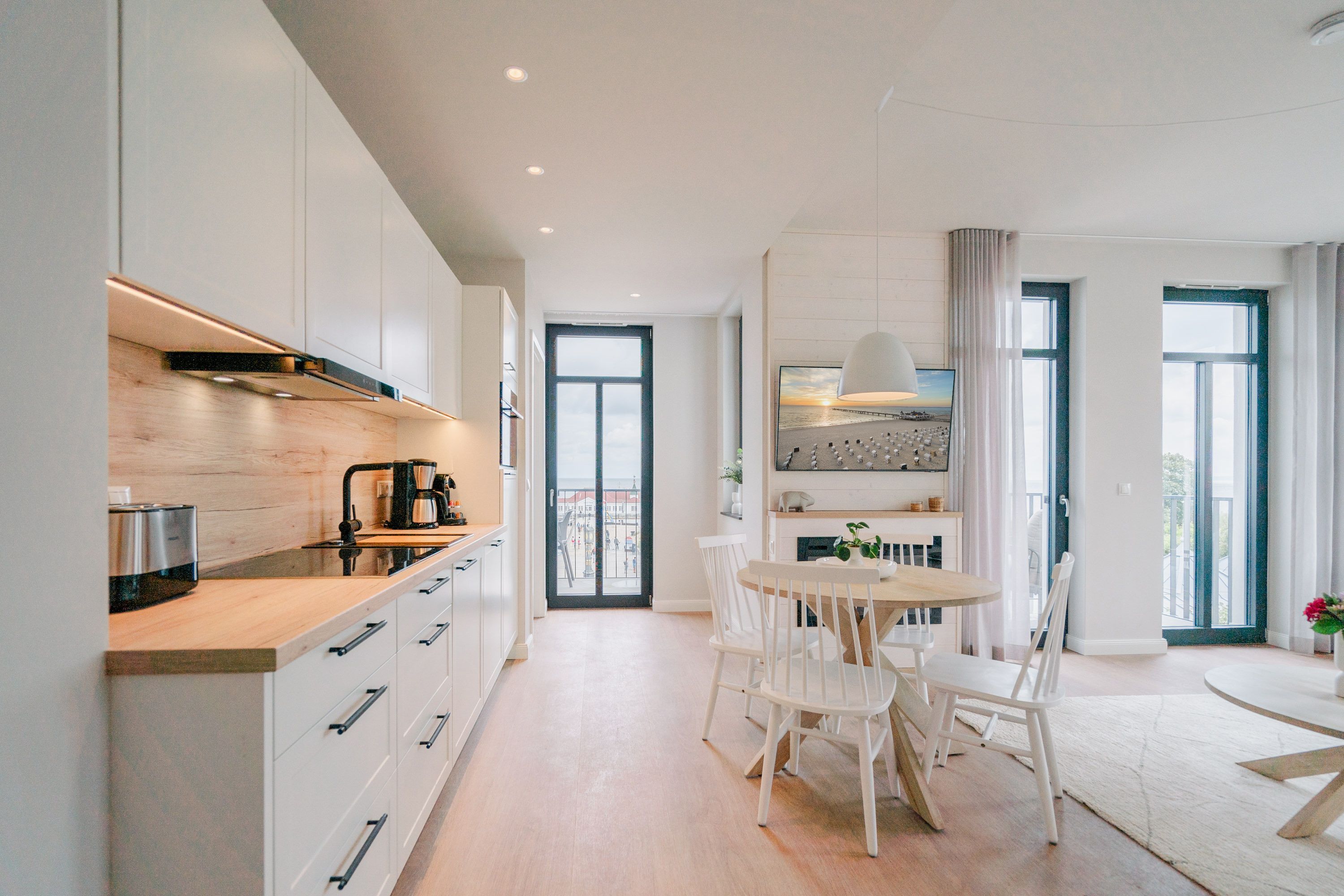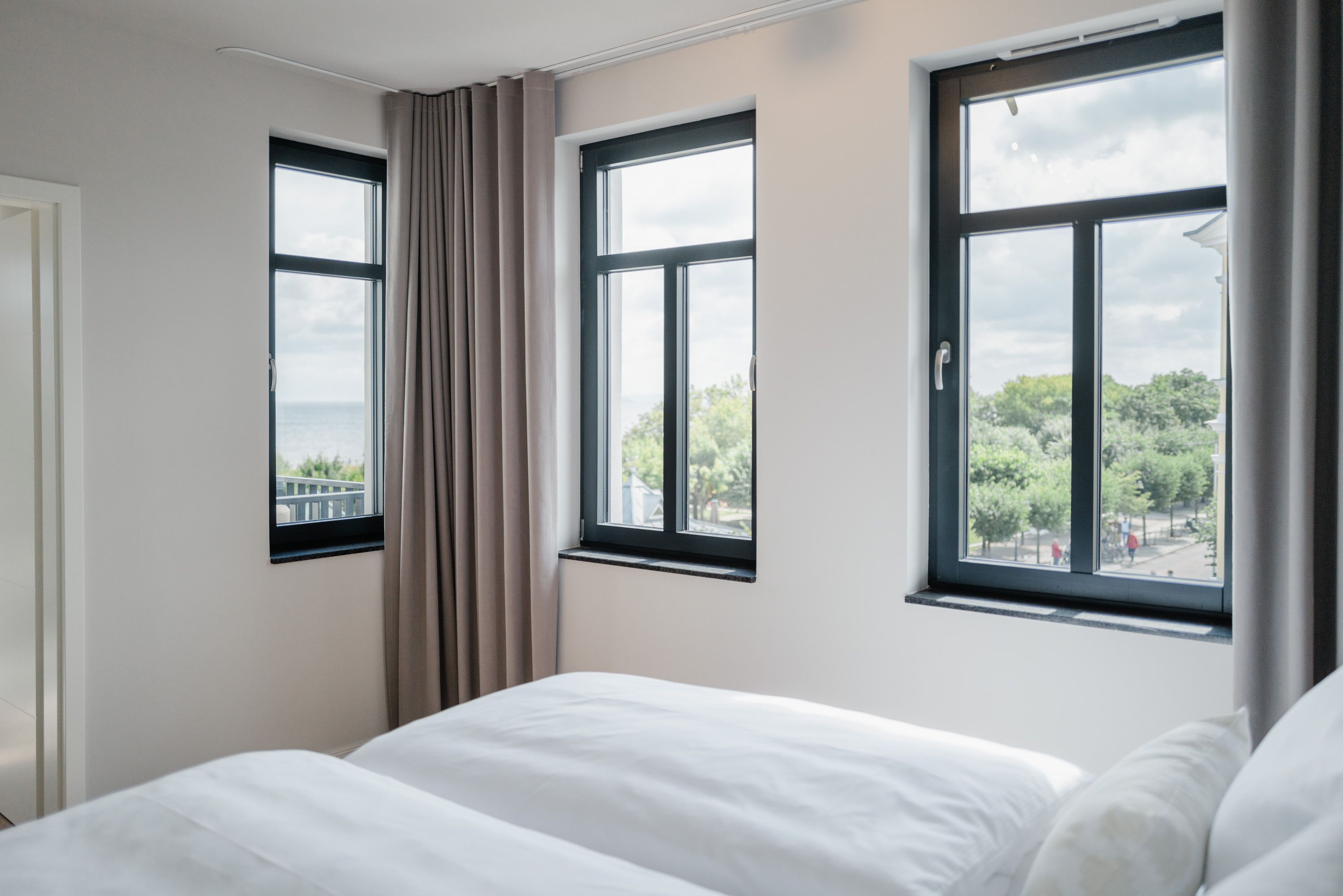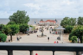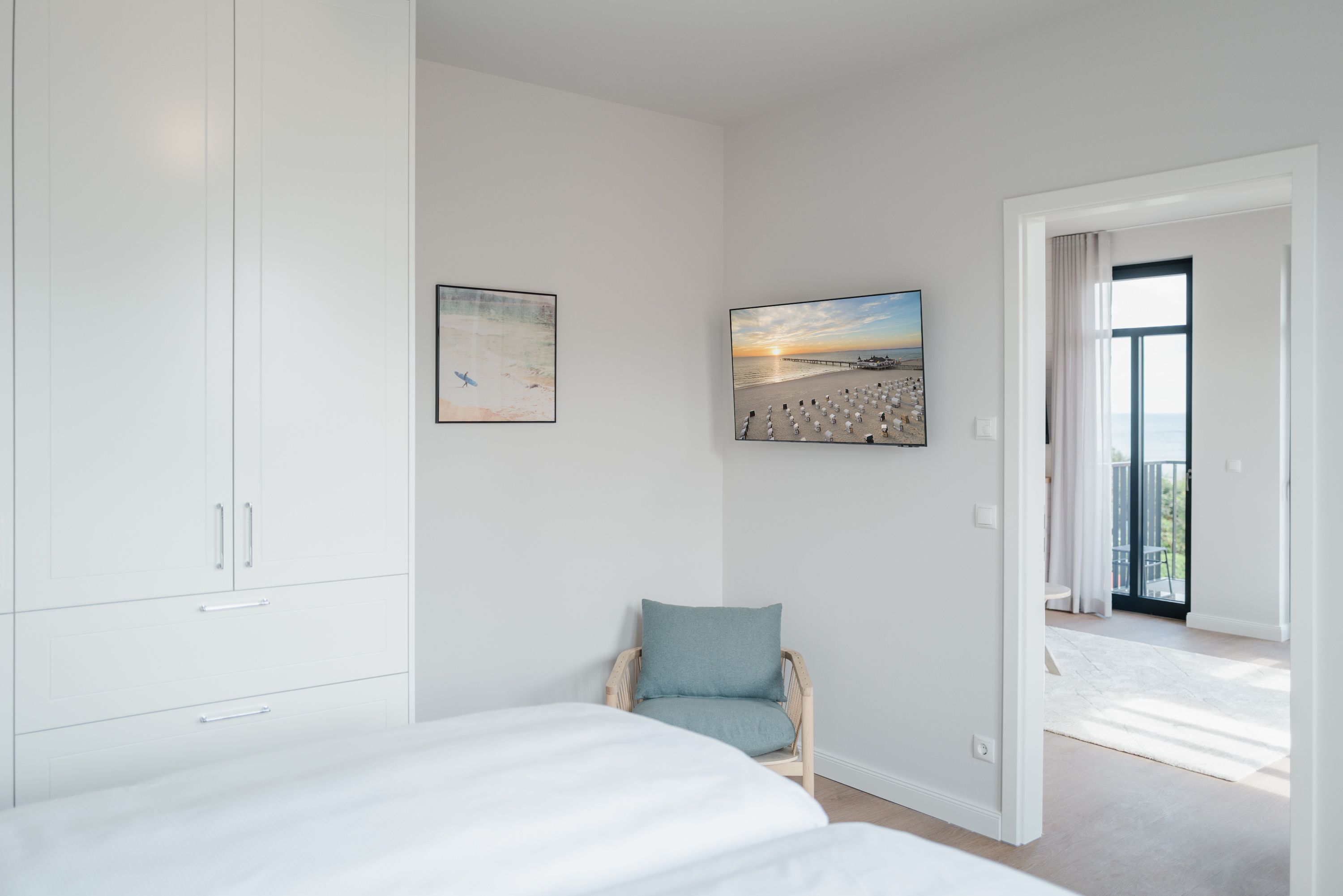 Was für eine Aussicht! Das wird sicher Ihr erster Satz sein, wenn Sie dieses exquisite 3-Raum-Appartement A2.4 im zweiten Obergeschoss betreten. Denn aus dem 77 Quadratmeter großen Feriendomizil für bis zu vier Personen haben Sie einen atemberaubenden Panoramablick auf die Seebrücke und die Ostsee. Atmen Sie die frische Seeluft tief in sich ein. Denn sie ist nicht nur gesund, sondern pustet stressgeplagte Köpfe wunderbar frei. Von gleich drei Balkonen aus können Sie auf das Meer hinaussehen und auch aus dem Wohnzimmer haben Sie die Ostsee immer im Blick. Licht und hell empfängt Sie der großzügige und offene Wohn-Essbereich. Angenehme und wohl temperierten Farbakzente und ein exklusives Designkonzept strahlen eine harmonisierende und entspannende Atmosphäre aus. Auf der bequemen und komfortablen Couch werden Ihre Mußestunden zu wahren Energiespendern. Ein Elektro-Kamin (ohne Wärmeabgabe) schafft sogar an heißen Sommertagen eine wundervolle Stimmung und sorgt an kuscheligen Abenden für Romantik. Unterhaltung bietet der 50-Zoll-Flachbildfernseher. Doch wer braucht den schon, wenn man aus jedem Fenster die Ostsee bestaunen kann. Die drei Balkone mit Nord-Ost- und Süd-Ost-Ausrichtung ermöglichen es Ihnen, das Meer zu jeder Tageszeit zu genießen. Ganz gleich, ob beim Frühstück oder einfach nur beim Sitzen und aufs Meer schauen. Für das Zubereiten der Mahlzeiten steht Ihnen eine mit hochwertigen Siemensgeräten ausgestattete Küchenzeile zur Verfügung. Dazu gehören ein Backofen mit Mikrowelle, eine Geschirrspülmaschine, ein 4-Zonen-Induktionsherd, zwei verschiedene Kaffeemaschinen und einem Kühlschrank mit Gefrierfach. Am Esstisch können Sie viele Genuss- und Gemeinschaftsmomente mit Meerblick genießen. Das Appartement hat zwei Schlafzimmer mit jeweils einem komfortablen Boxspringdoppelbett (1,80m x 2,00m), einem Kleiderschrank sowie einem zusätzlichen 43-Zoll-Flachbildfernseher. Von einem Schlafzimmer aus können Sie sogar auf den großen Hauptbalkon hinaustreten. Doch auch aus dem anderen Schlafzimmer können Sie schon beim Aufwachen aufs Wasser schauen. Jeder Schlafbereich verfügt über ein eigenes Bad mit Dusche, WC und Waschtisch. Zu der Wohnung gehört ein PKW-Stellplatz in der Tiefgarage. Lassen Sie sich von dieser exklusiven Ferienwohnung verzaubern und erleben Sie entspannte Tage direkt an der Ostsee.