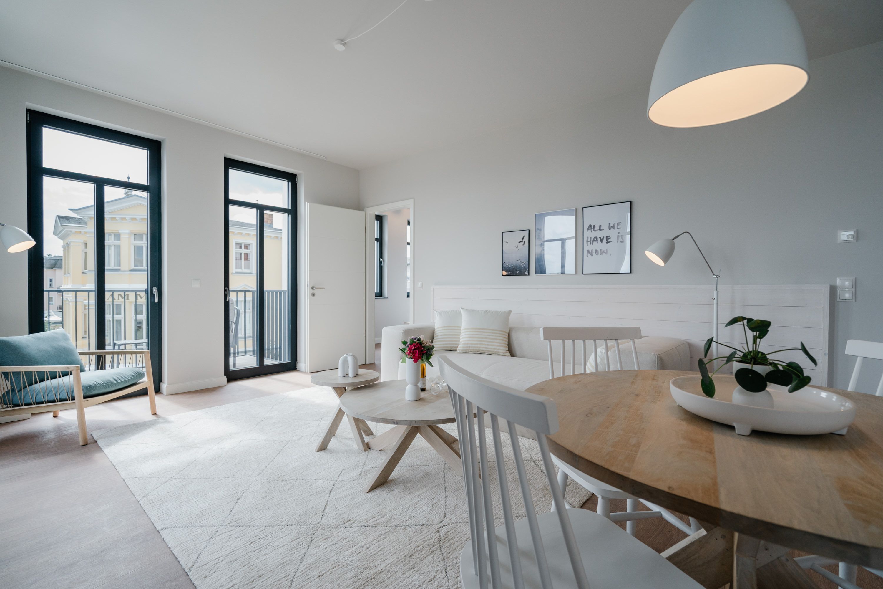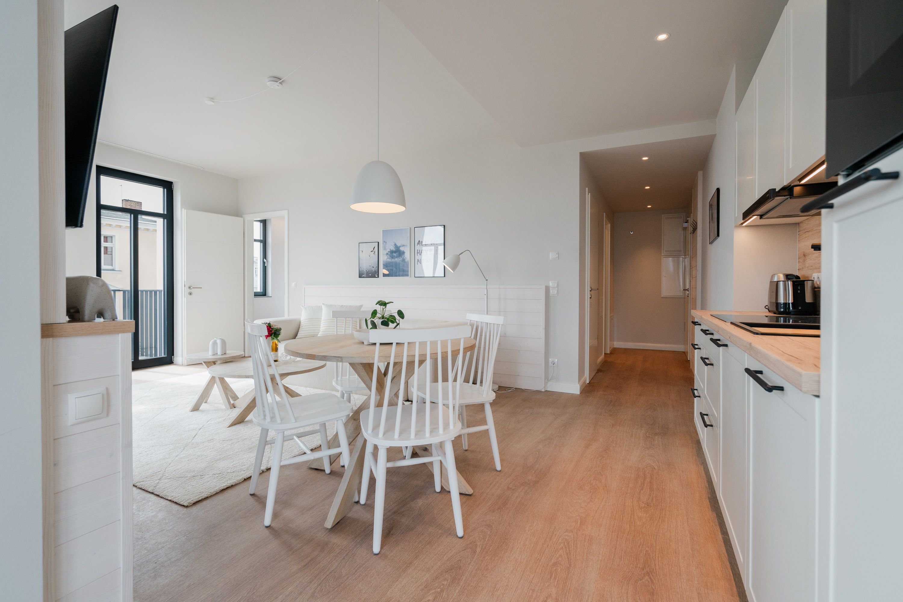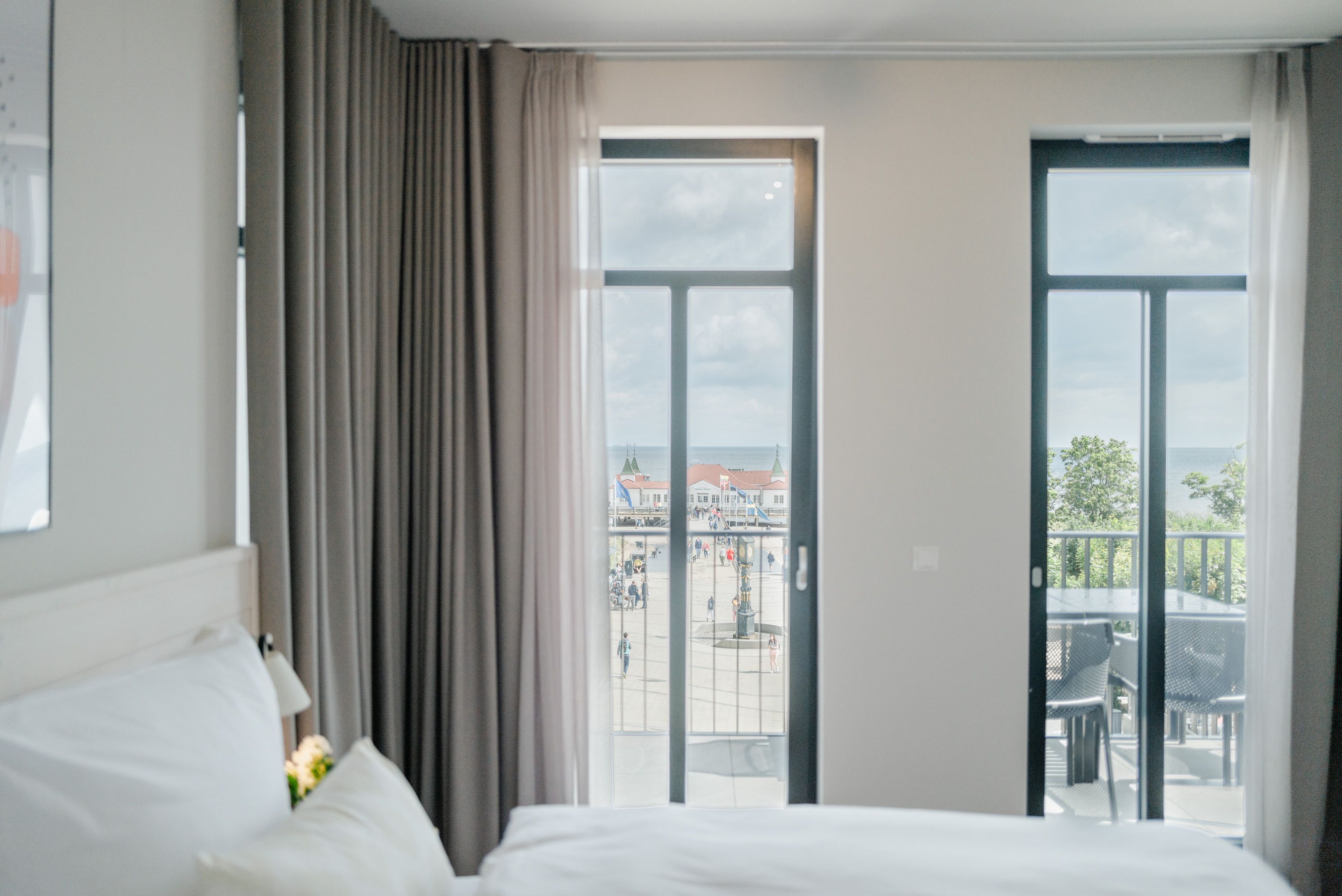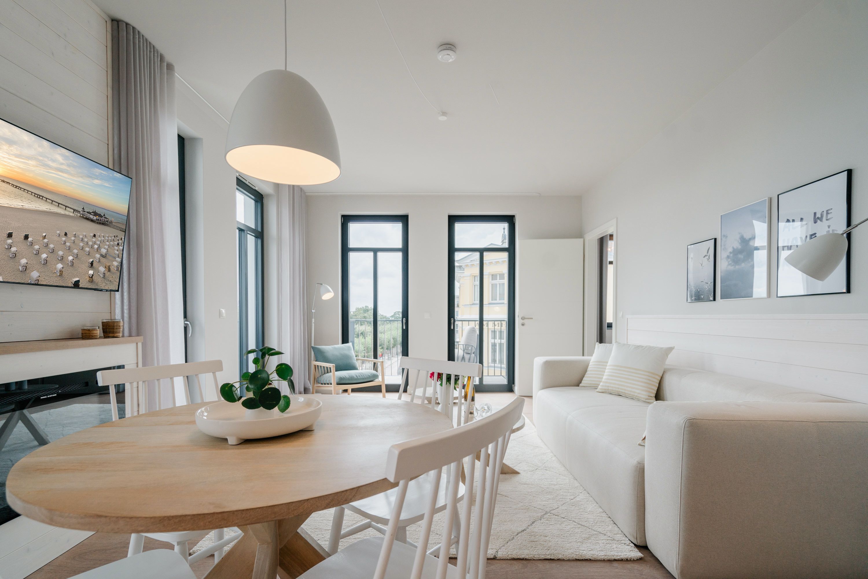 Was für eine Aussicht! Das wird sicher Ihr erster Satz sein, wenn Sie dieses exquisite 3-Raum-Appartement A2.4 im zweiten Obergeschoss betreten. Denn aus dem 77 Quadratmeter großen Feriendomizil für bis zu vier Personen haben Sie einen atemberaubenden Panoramablick auf die Seebrücke und die Ostsee. Atmen Sie die frische Seeluft tief in sich ein. Denn sie ist nicht nur gesund, sondern pustet stressgeplagte Köpfe wunderbar frei. Von gleich drei Balkonen aus können Sie auf das Meer hinaussehen und auch aus dem Wohnzimmer haben Sie die Ostsee immer im Blick. Licht und hell empfängt Sie der großzügige und offene Wohn-Essbereich. Angenehme und wohl temperierten Farbakzente und ein exklusives Designkonzept strahlen eine harmonisierende und entspannende Atmosphäre aus. Auf der bequemen und komfortablen Couch werden Ihre Mußestunden zu wahren Energiespendern. Ein Elektro-Kamin (ohne Wärmeabgabe) schafft sogar an heißen Sommertagen eine wundervolle Stimmung und sorgt an kuscheligen Abenden für Romantik. Unterhaltung bietet der 50-Zoll-Flachbildfernseher. Doch wer braucht den schon, wenn man aus jedem Fenster die Ostsee bestaunen kann. Die drei Balkone mit Nord-Ost- und Süd-Ost-Ausrichtung ermöglichen es Ihnen, das Meer zu jeder Tageszeit zu genießen. Ganz gleich, ob beim Frühstück oder einfach nur beim Sitzen und aufs Meer schauen. Für das Zubereiten der Mahlzeiten steht Ihnen eine mit hochwertigen Siemensgeräten ausgestattete Küchenzeile zur Verfügung. Dazu gehören ein Backofen mit Mikrowelle, eine Geschirrspülmaschine, ein 4-Zonen-Induktionsherd, zwei verschiedene Kaffeemaschinen und einem Kühlschrank mit Gefrierfach. Am Esstisch können Sie viele Genuss- und Gemeinschaftsmomente mit Meerblick genießen. Das Appartement hat zwei Schlafzimmer mit jeweils einem komfortablen Boxspringdoppelbett (1,80m x 2,00m), einem Kleiderschrank sowie einem zusätzlichen 43-Zoll-Flachbildfernseher. Von einem Schlafzimmer aus können Sie sogar auf den großen Hauptbalkon hinaustreten. Doch auch aus dem anderen Schlafzimmer können Sie schon beim Aufwachen aufs Wasser schauen. Jeder Schlafbereich verfügt über ein eigenes Bad mit Dusche, WC und Waschtisch. Zu der Wohnung gehört ein PKW-Stellplatz in der Tiefgarage. Lassen Sie sich von dieser exklusiven Ferienwohnung verzaubern und erleben Sie entspannte Tage direkt an der Ostsee.