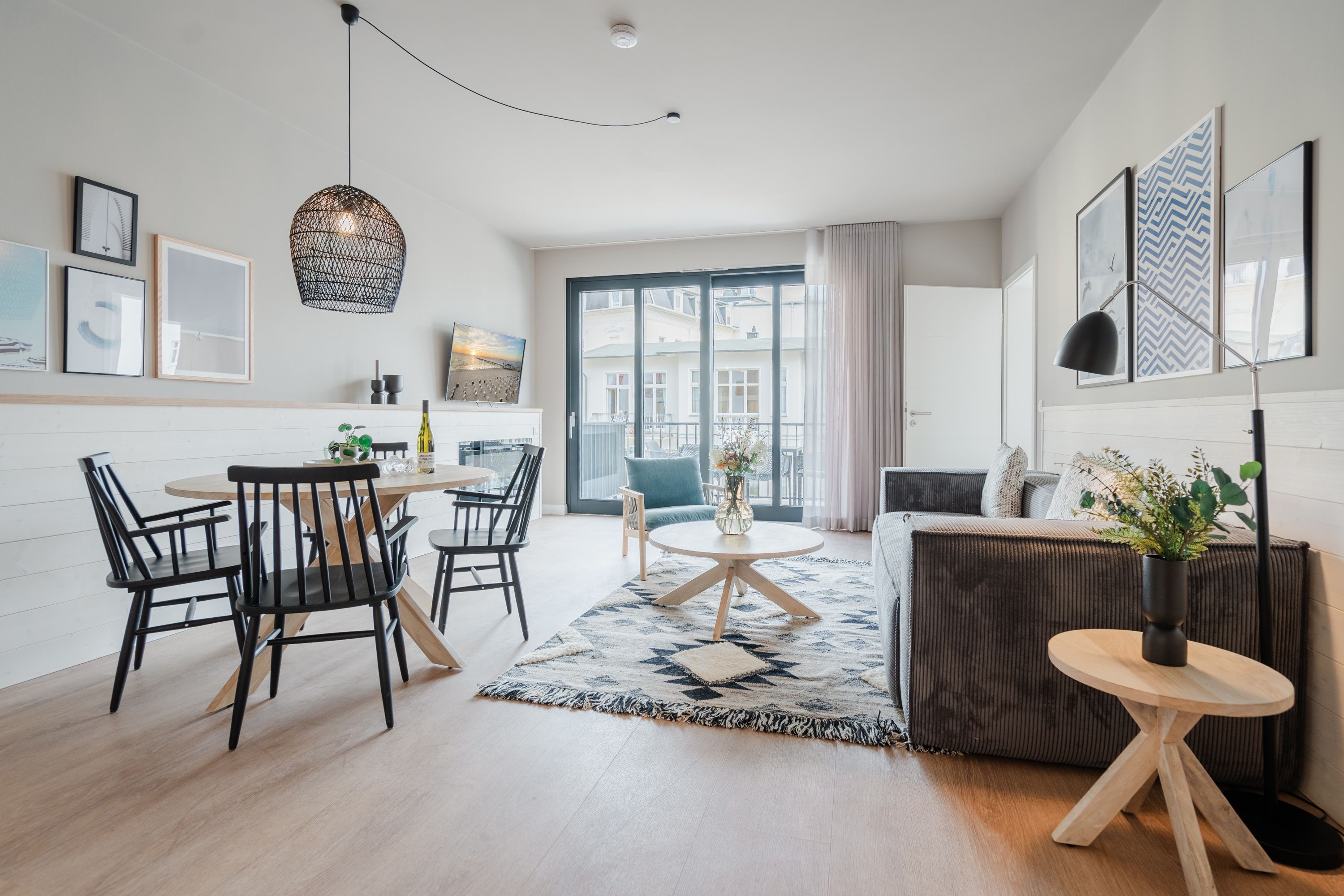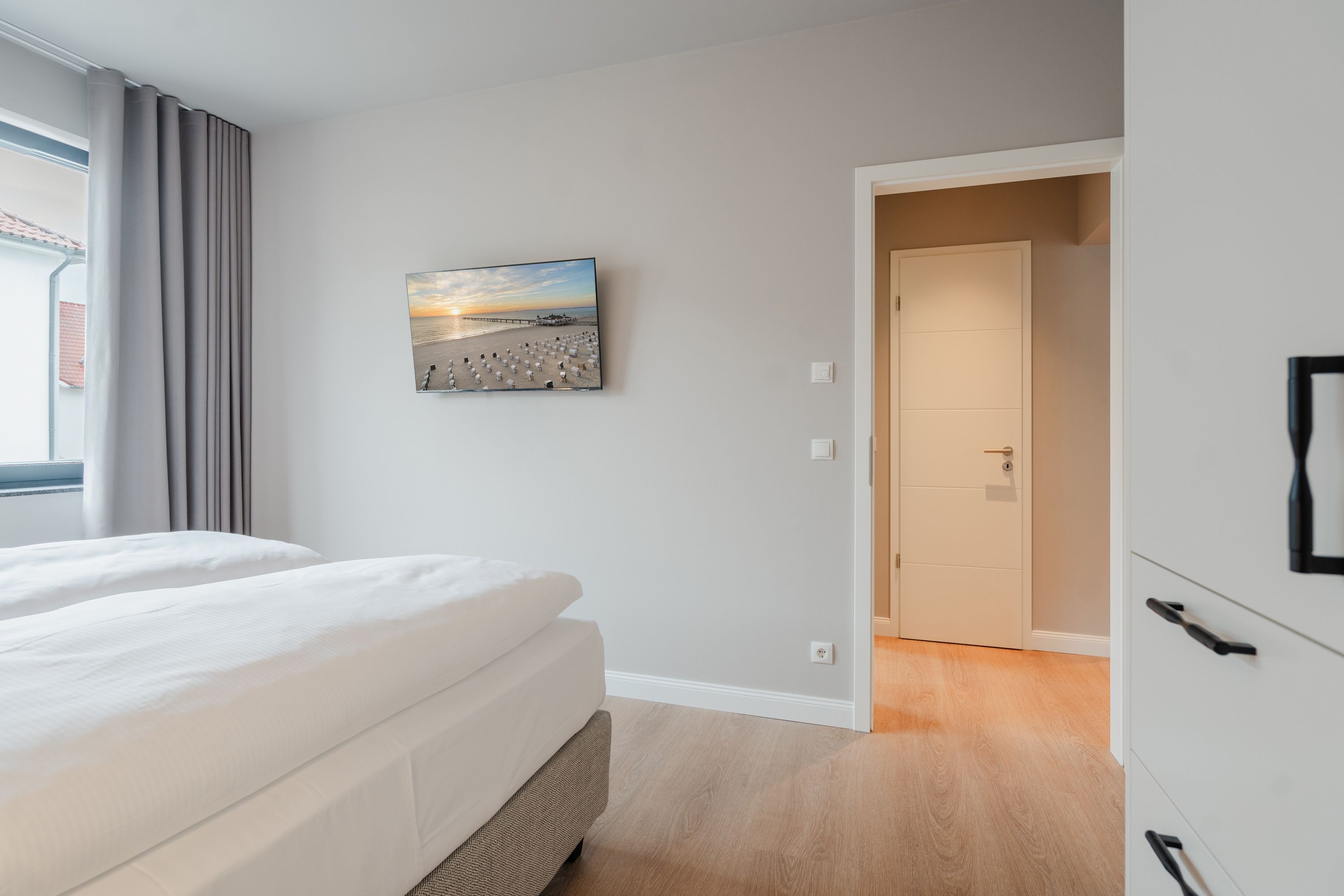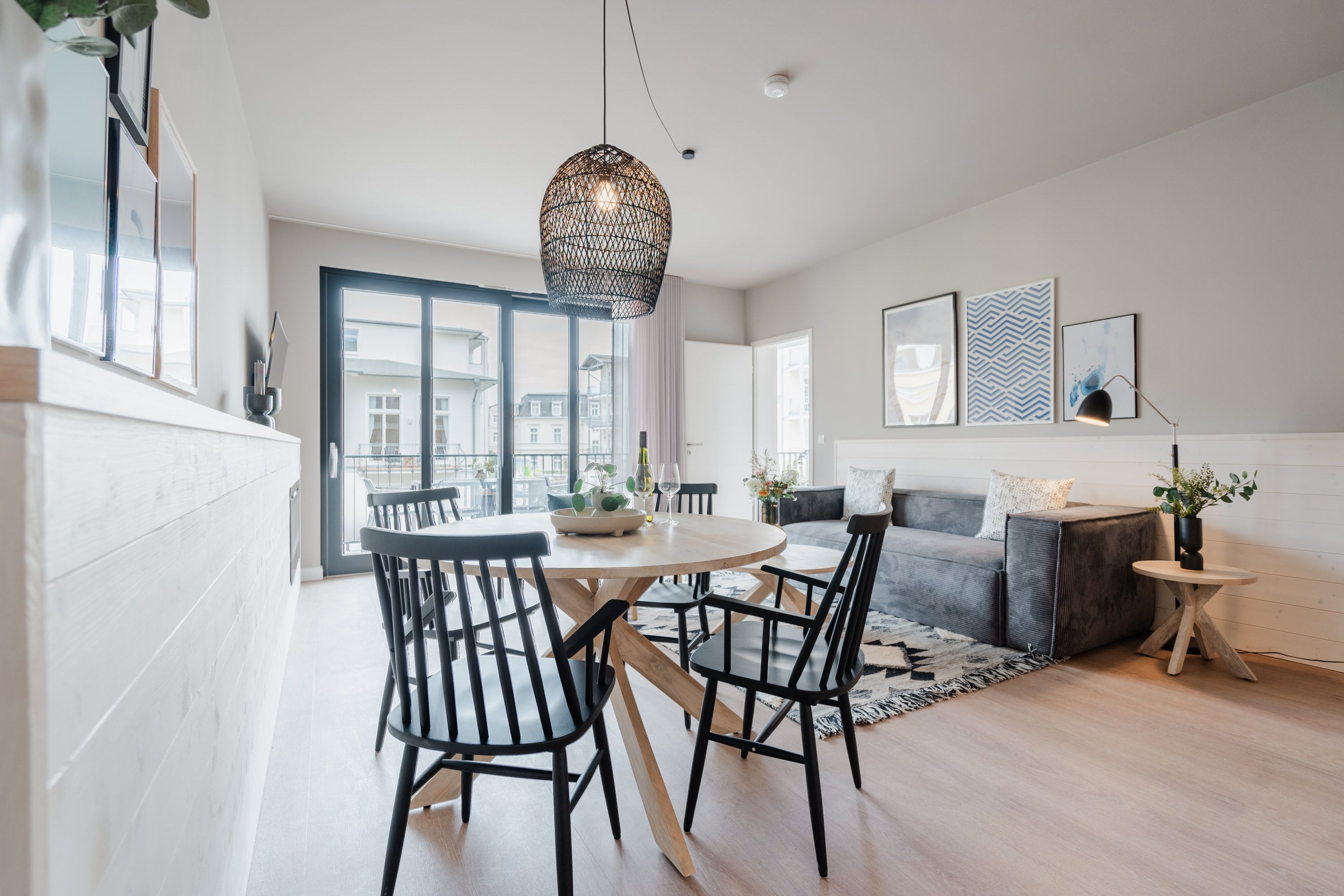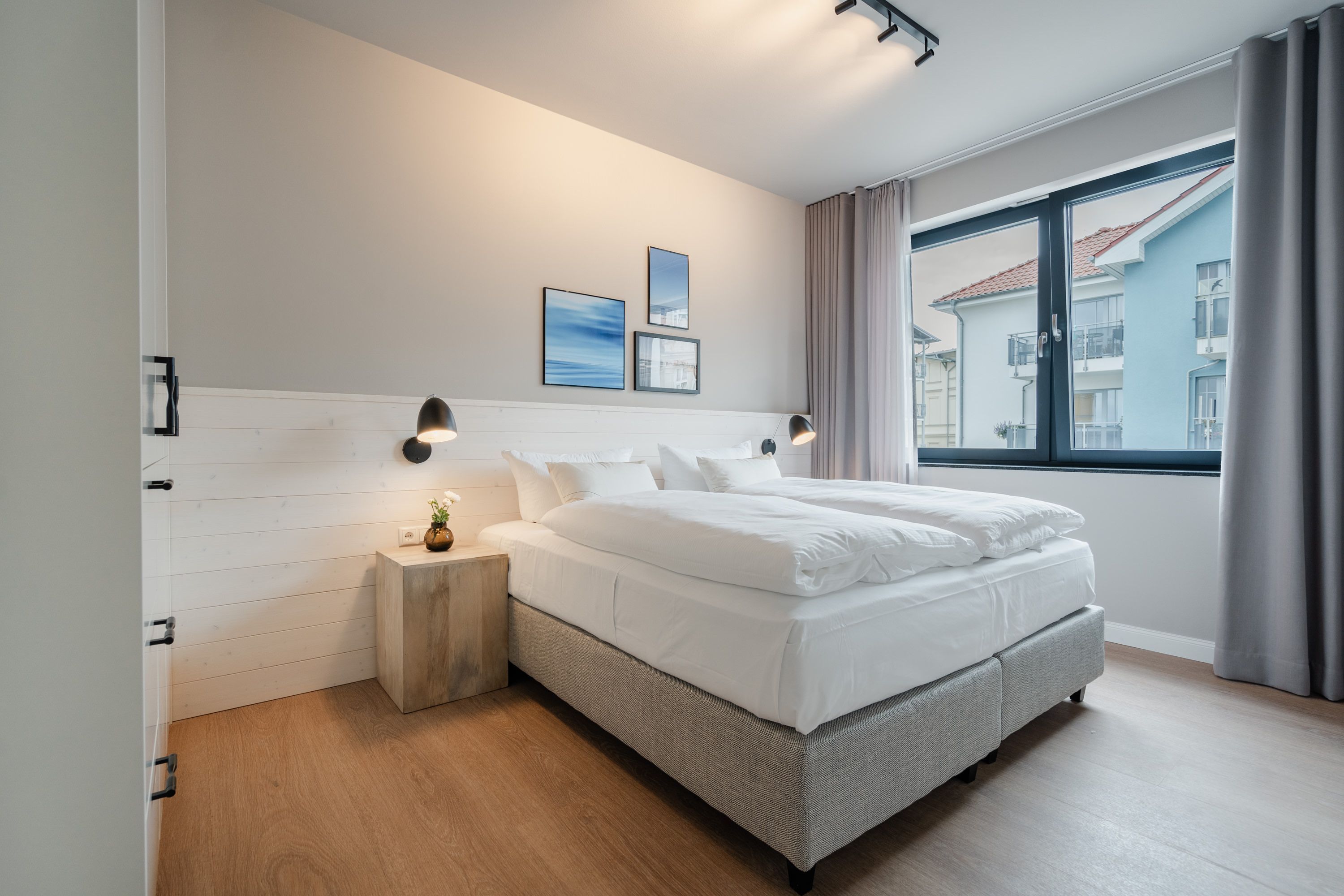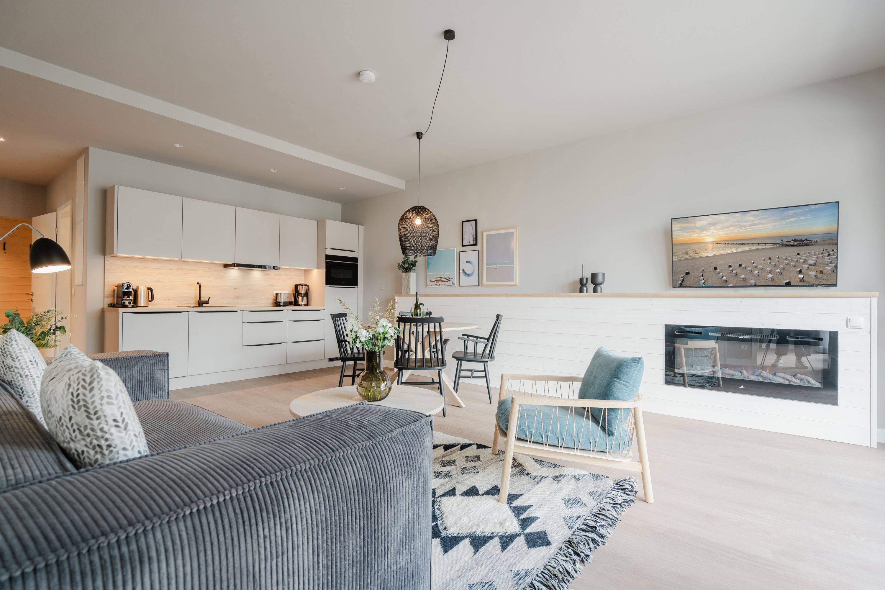 Das 3-Raum-Appartement B 1.4 in der 1. Etage von Haus B wird Ihre Glückshormone zum Übersprudeln bringen. Es bietet auf 88 Quadratmetern bis zu 4 Personen und 1 Kleinkind im Kinderreisebett jede Menge Platz zum Entspannen, Abschalten und Urlauben. Ein großzügiges Wohn-Esszimmer ist eine wundervolle Relax Area, in der Sie Ihre gemeinsame Zeit vollauf genießen können. Lassen Sie sich aufs gemütliche Sofa oder den stylischen Sessel fallen oder genießen Sie die gemeinsamen Stunden am großen Esstisch. Zum ausgiebigen Kochen lädt die vollausgestattete Küche ein, die zum Wohnzimmer hin offen ist. Die hochwertigen Elektrogeräte wie der Backofen, der 4-Platten-Induktionsherd und die Nespresso-Kapselmaschine sind auf dem neuesten Stand. Für spannende Kinoabende sorgt ein großer Flat-TV (50 Zoll). Und für Romantikfans gibt es einen hyggeligen Elektrokamin (ohne Wärmeabgabe), der sogar im Sommer für eine stimmungsvolle Atmosphäre sorgt. Ein Highlight der Wohnung ist der große Balkon in Richtung Osten mit Gartenmöbeln und einer Sonnenliege. Schauen Sie von hier aus auf die Ostsee und atmen Sie die gesunden Aerosole der salzigen Meeresluft tief in sich ein. Da Meeresluft zudem bekanntlich müde macht, werden Sie in den beiden Schlafzimmern, die zu diesem Appartement gehören, ganz sicher sehr gut schlafen. Jedes ist mit einem komfortablen Boxspringdoppelbett (1,80m x 2,00m), einem Kleiderschrank und einem Flat-TV (43 Zoll) eingerichtet. Eines der Schlafzimmer bietet zudem Zugang zum Balkon. Damit sich beim Duschen niemand ins Gehege kommt, besitzt Ihr Domizil zwei moderne Duschbäder mit Waschtisch und WC. In einem der Bäder befindet sich eine kleine Infrarotsauna zum privaten Wellnessvergnügen. Ein PKW-Stellplatz in der Tiefgarage sorgt für bequemes Parken, damit Sie Ihre Auszeit rundum unbeschwert genießen können.