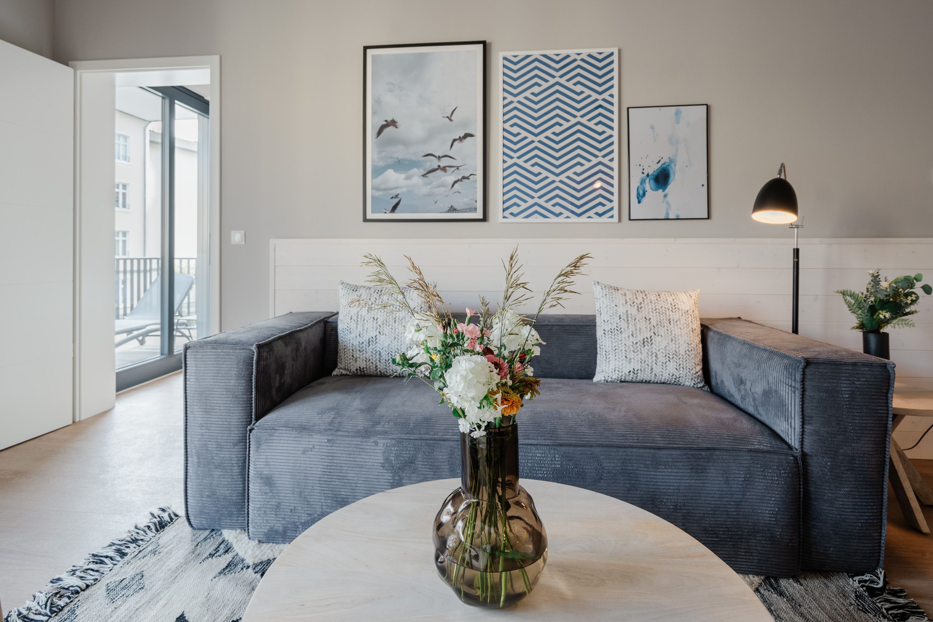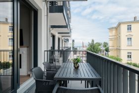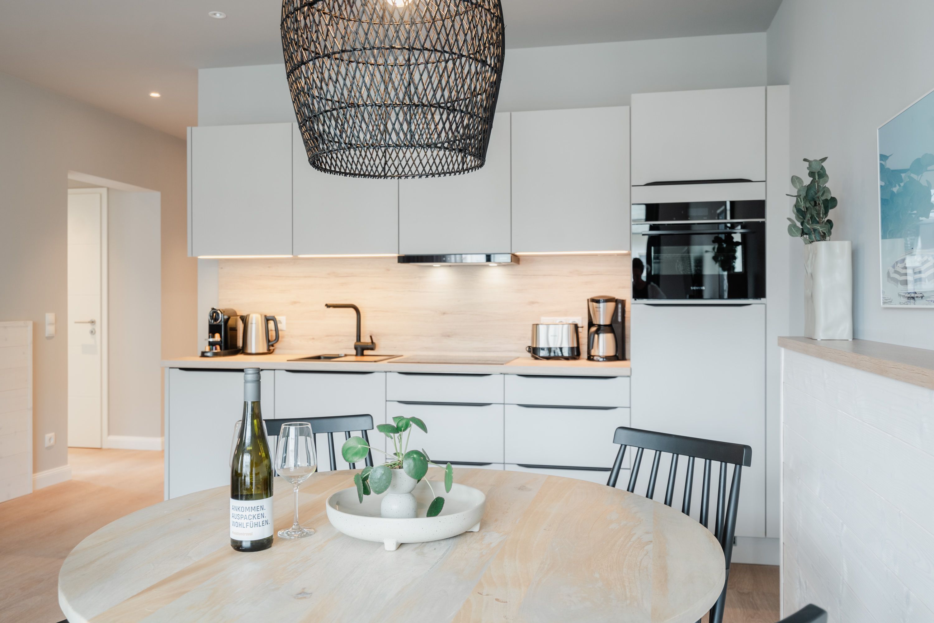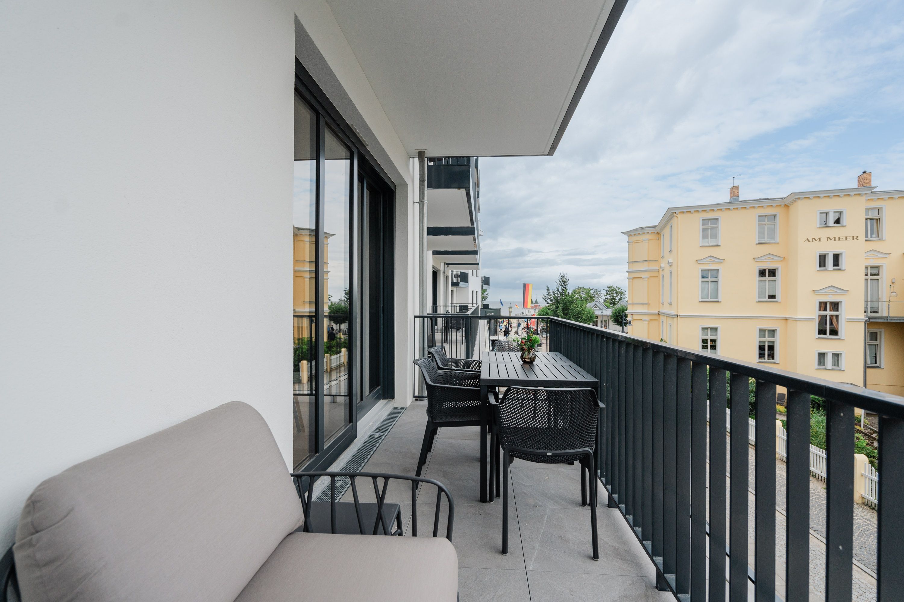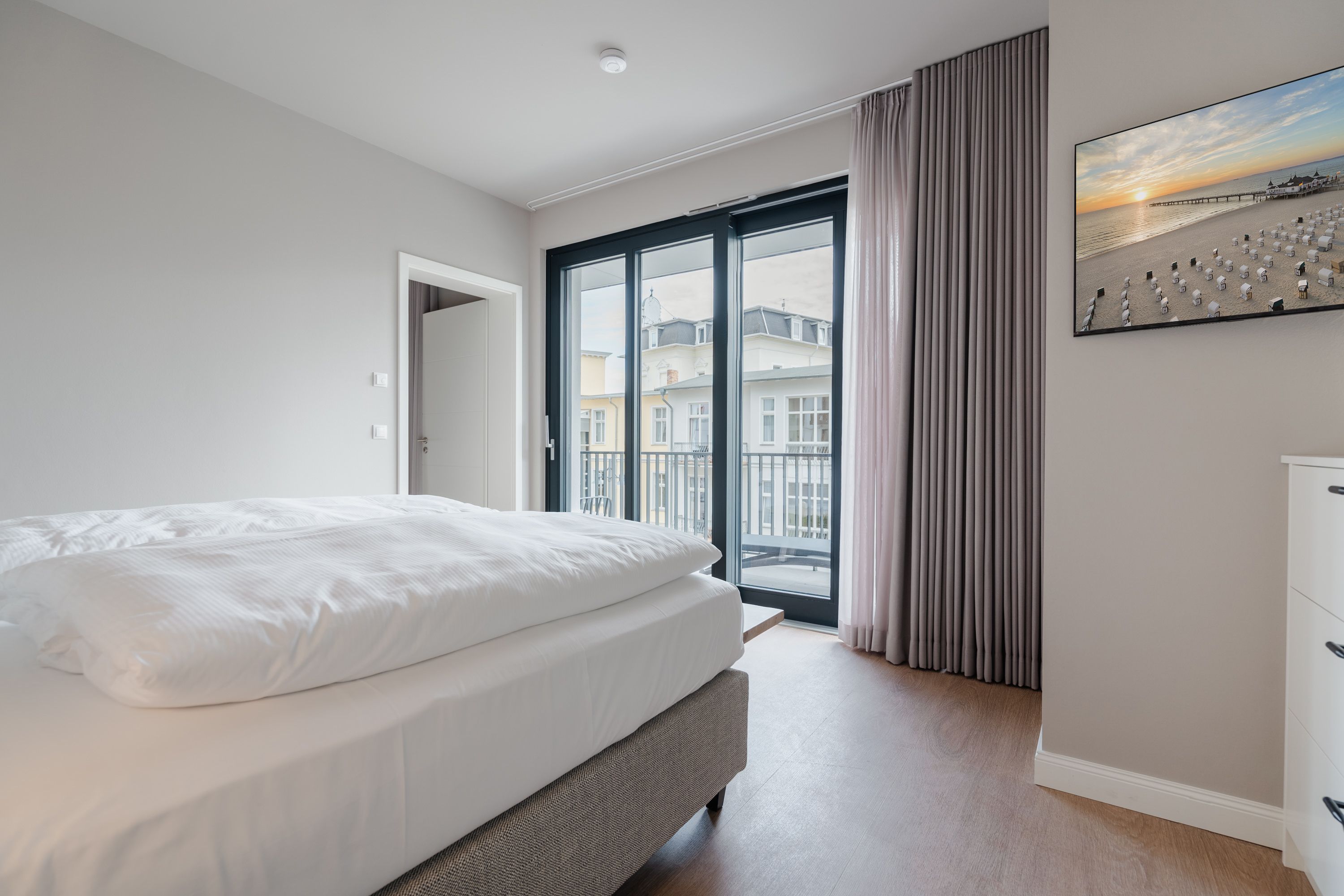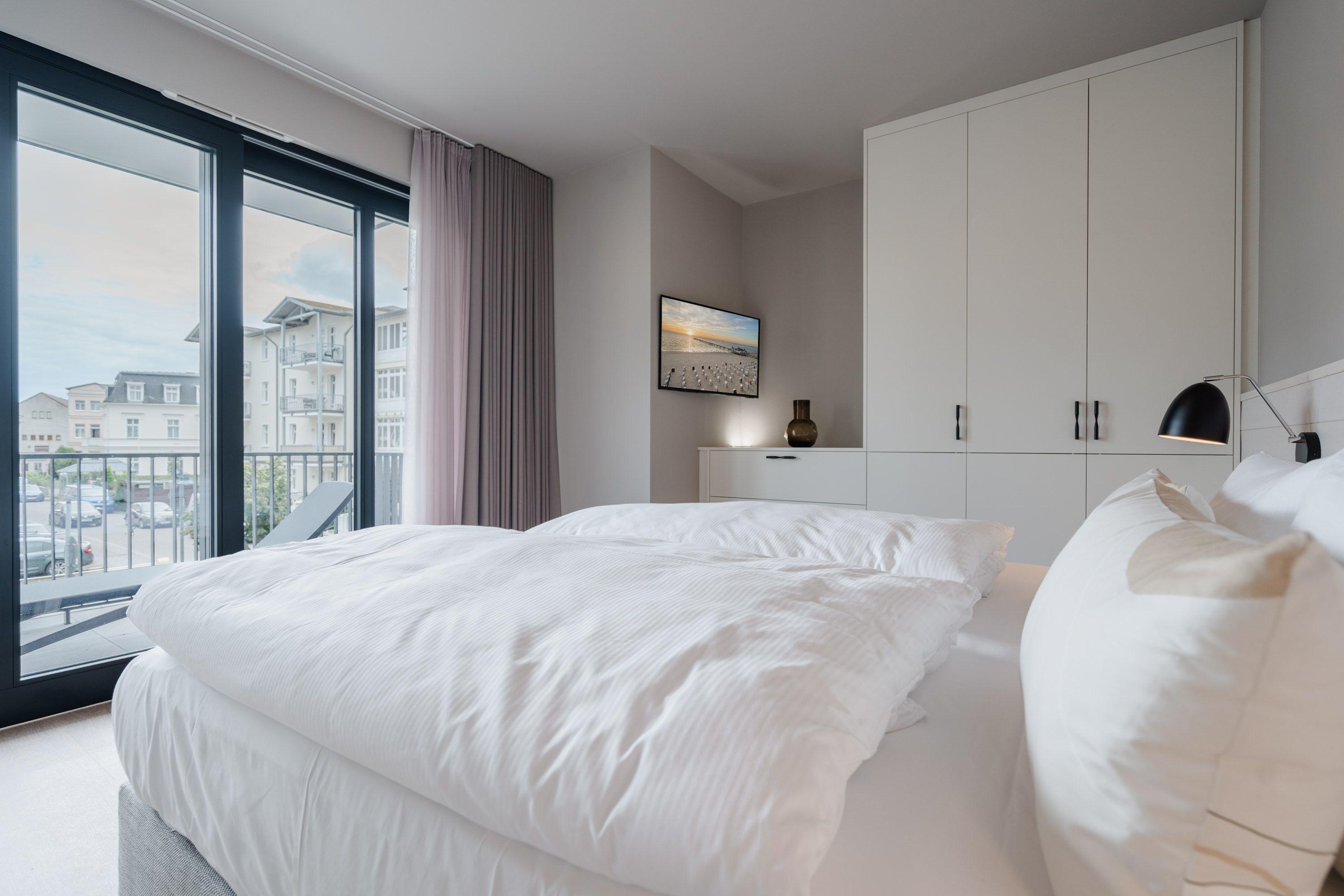 Das 3-Raum-Appartement B 1.4 in der 1. Etage von Haus B wird Ihre Glückshormone zum Übersprudeln bringen. Es bietet auf 88 Quadratmetern bis zu 4 Personen und 1 Kleinkind im Kinderreisebett jede Menge Platz zum Entspannen, Abschalten und Urlauben. Ein großzügiges Wohn-Esszimmer ist eine wundervolle Relax Area, in der Sie Ihre gemeinsame Zeit vollauf genießen können. Lassen Sie sich aufs gemütliche Sofa oder den stylischen Sessel fallen oder genießen Sie die gemeinsamen Stunden am großen Esstisch. Zum ausgiebigen Kochen lädt die vollausgestattete Küche ein, die zum Wohnzimmer hin offen ist. Die hochwertigen Elektrogeräte wie der Backofen, der 4-Platten-Induktionsherd und die Nespresso-Kapselmaschine sind auf dem neuesten Stand. Für spannende Kinoabende sorgt ein großer Flat-TV (50 Zoll). Und für Romantikfans gibt es einen hyggeligen Elektrokamin (ohne Wärmeabgabe), der sogar im Sommer für eine stimmungsvolle Atmosphäre sorgt. Ein Highlight der Wohnung ist der große Balkon in Richtung Osten mit Gartenmöbeln und einer Sonnenliege. Schauen Sie von hier aus auf die Ostsee und atmen Sie die gesunden Aerosole der salzigen Meeresluft tief in sich ein. Da Meeresluft zudem bekanntlich müde macht, werden Sie in den beiden Schlafzimmern, die zu diesem Appartement gehören, ganz sicher sehr gut schlafen. Jedes ist mit einem komfortablen Boxspringdoppelbett (1,80m x 2,00m), einem Kleiderschrank und einem Flat-TV (43 Zoll) eingerichtet. Eines der Schlafzimmer bietet zudem Zugang zum Balkon. Damit sich beim Duschen niemand ins Gehege kommt, besitzt Ihr Domizil zwei moderne Duschbäder mit Waschtisch und WC. In einem der Bäder befindet sich eine kleine Infrarotsauna zum privaten Wellnessvergnügen. Ein PKW-Stellplatz in der Tiefgarage sorgt für bequemes Parken, damit Sie Ihre Auszeit rundum unbeschwert genießen können.