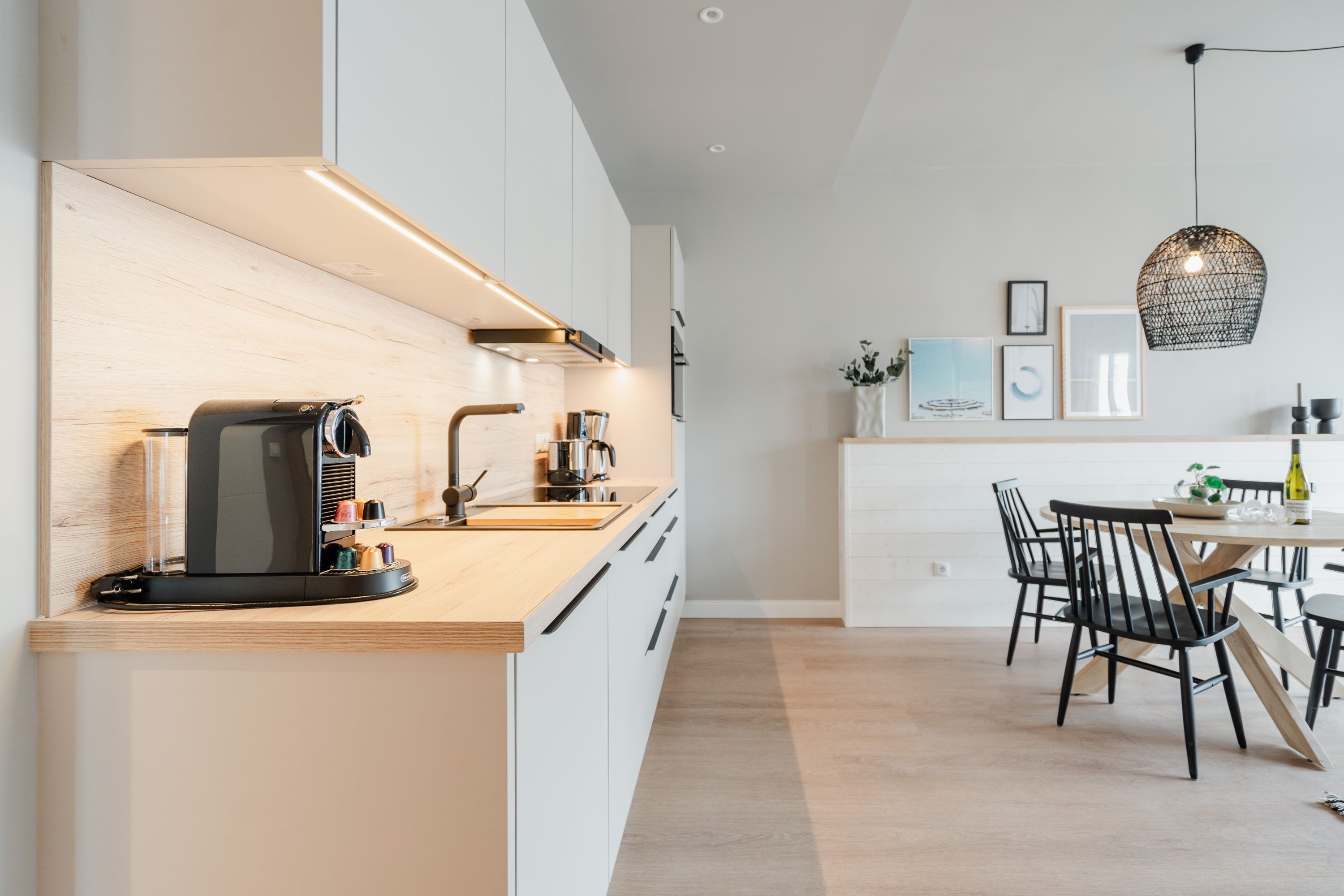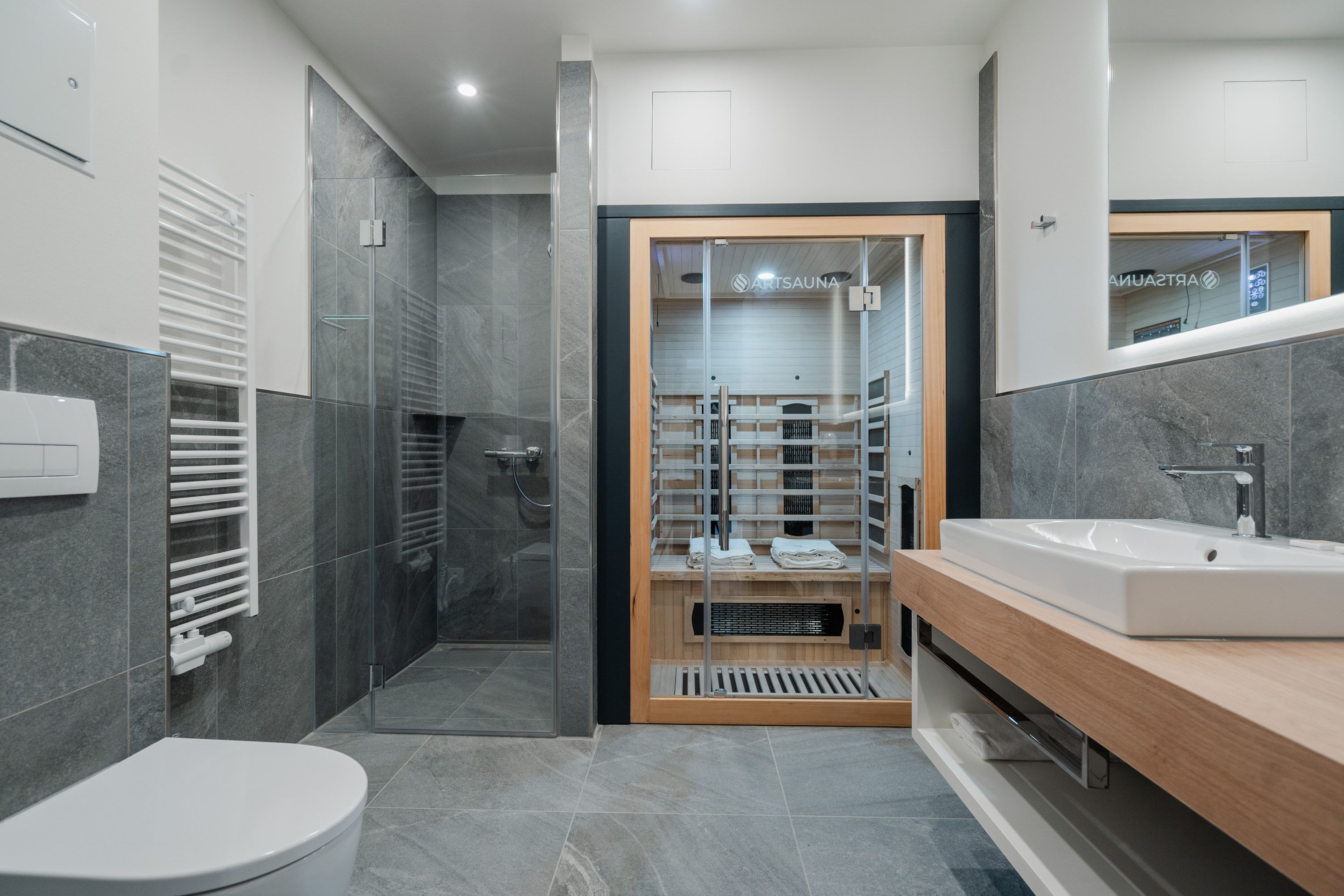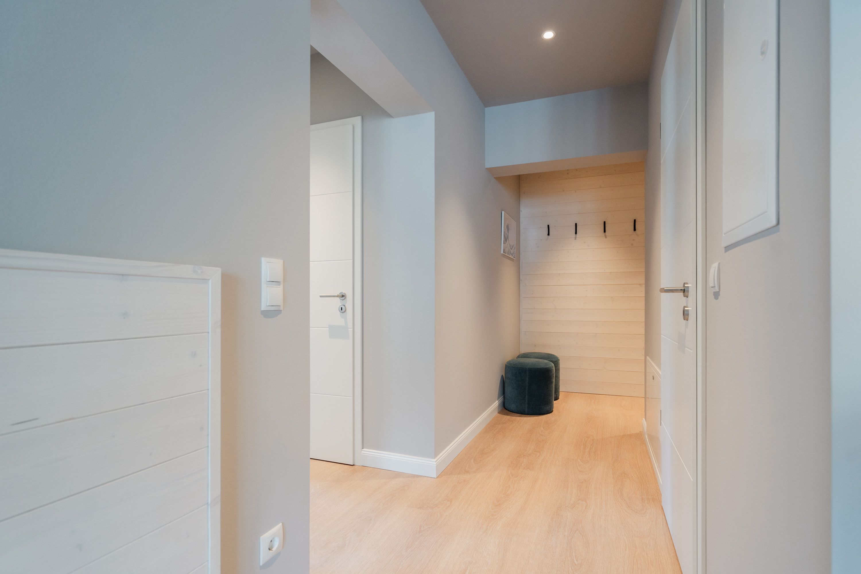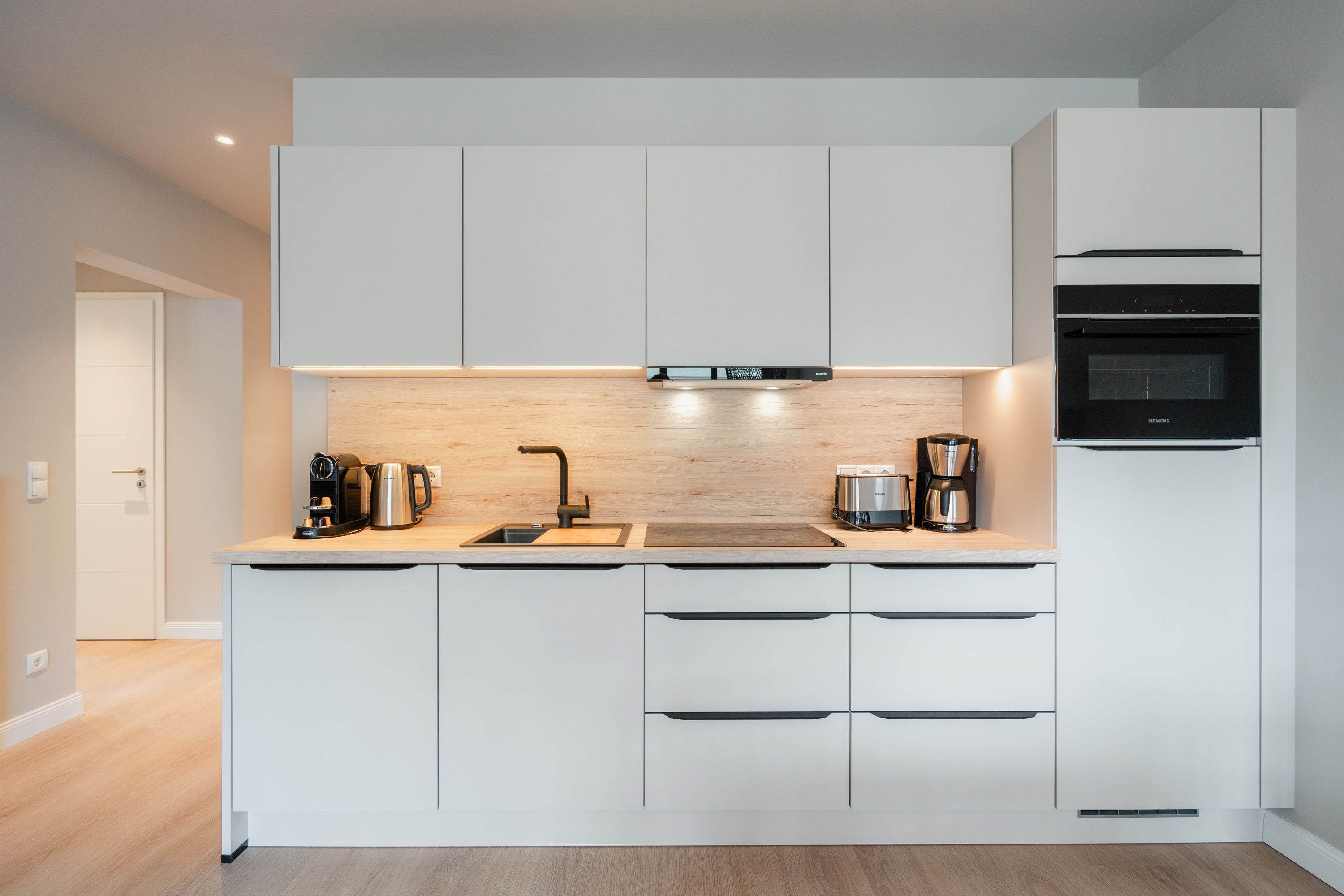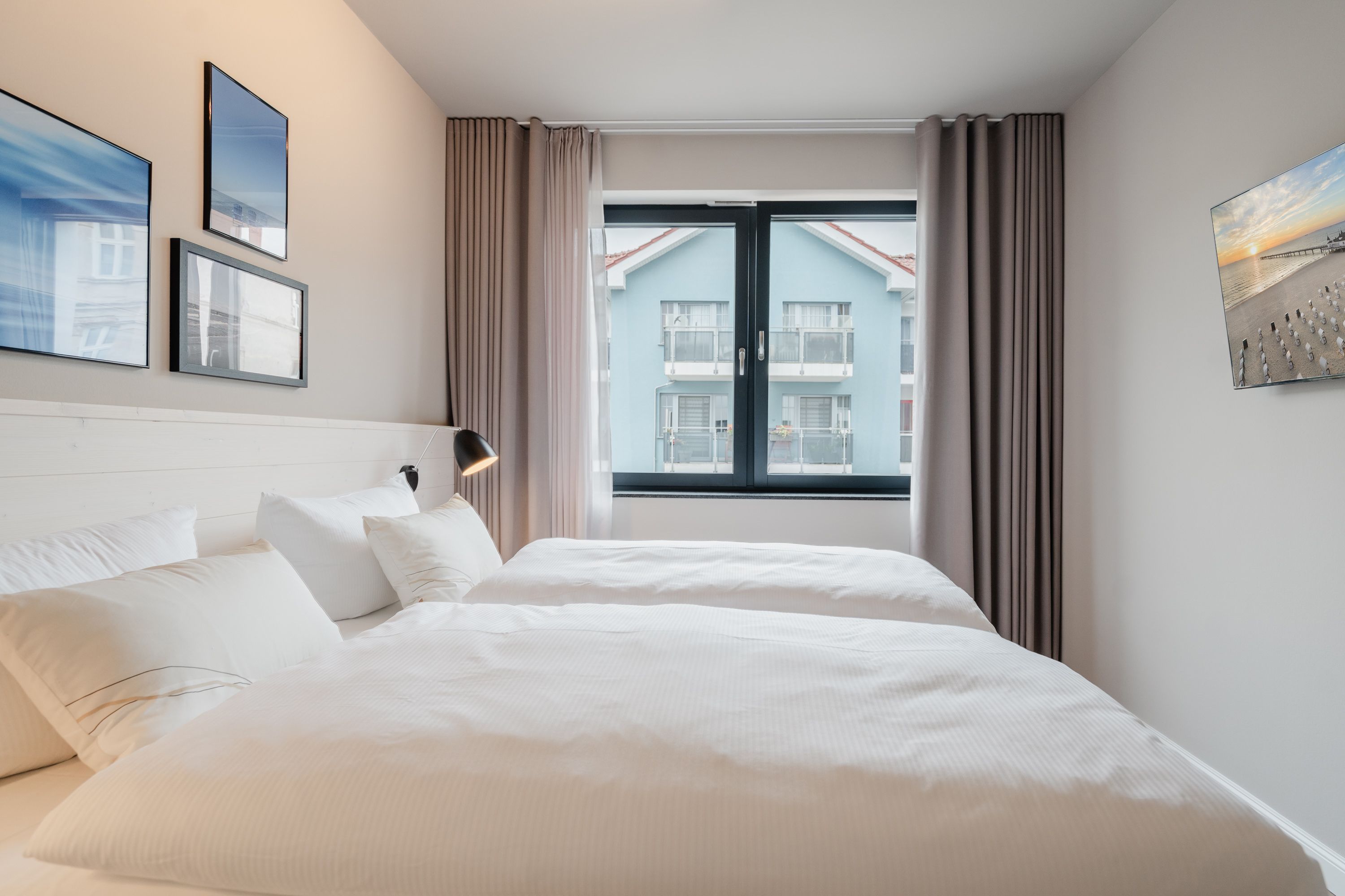 Das 3-Raum-Appartement B 1.4 in der 1. Etage von Haus B wird Ihre Glückshormone zum Übersprudeln bringen. Es bietet auf 88 Quadratmetern bis zu 4 Personen und 1 Kleinkind im Kinderreisebett jede Menge Platz zum Entspannen, Abschalten und Urlauben. Ein großzügiges Wohn-Esszimmer ist eine wundervolle Relax Area, in der Sie Ihre gemeinsame Zeit vollauf genießen können. Lassen Sie sich aufs gemütliche Sofa oder den stylischen Sessel fallen oder genießen Sie die gemeinsamen Stunden am großen Esstisch. Zum ausgiebigen Kochen lädt die vollausgestattete Küche ein, die zum Wohnzimmer hin offen ist. Die hochwertigen Elektrogeräte wie der Backofen, der 4-Platten-Induktionsherd und die Nespresso-Kapselmaschine sind auf dem neuesten Stand. Für spannende Kinoabende sorgt ein großer Flat-TV (50 Zoll). Und für Romantikfans gibt es einen hyggeligen Elektrokamin (ohne Wärmeabgabe), der sogar im Sommer für eine stimmungsvolle Atmosphäre sorgt. Ein Highlight der Wohnung ist der große Balkon in Richtung Osten mit Gartenmöbeln und einer Sonnenliege. Schauen Sie von hier aus auf die Ostsee und atmen Sie die gesunden Aerosole der salzigen Meeresluft tief in sich ein. Da Meeresluft zudem bekanntlich müde macht, werden Sie in den beiden Schlafzimmern, die zu diesem Appartement gehören, ganz sicher sehr gut schlafen. Jedes ist mit einem komfortablen Boxspringdoppelbett (1,80m x 2,00m), einem Kleiderschrank und einem Flat-TV (43 Zoll) eingerichtet. Eines der Schlafzimmer bietet zudem Zugang zum Balkon. Damit sich beim Duschen niemand ins Gehege kommt, besitzt Ihr Domizil zwei moderne Duschbäder mit Waschtisch und WC. In einem der Bäder befindet sich eine kleine Infrarotsauna zum privaten Wellnessvergnügen. Ein PKW-Stellplatz in der Tiefgarage sorgt für bequemes Parken, damit Sie Ihre Auszeit rundum unbeschwert genießen können.