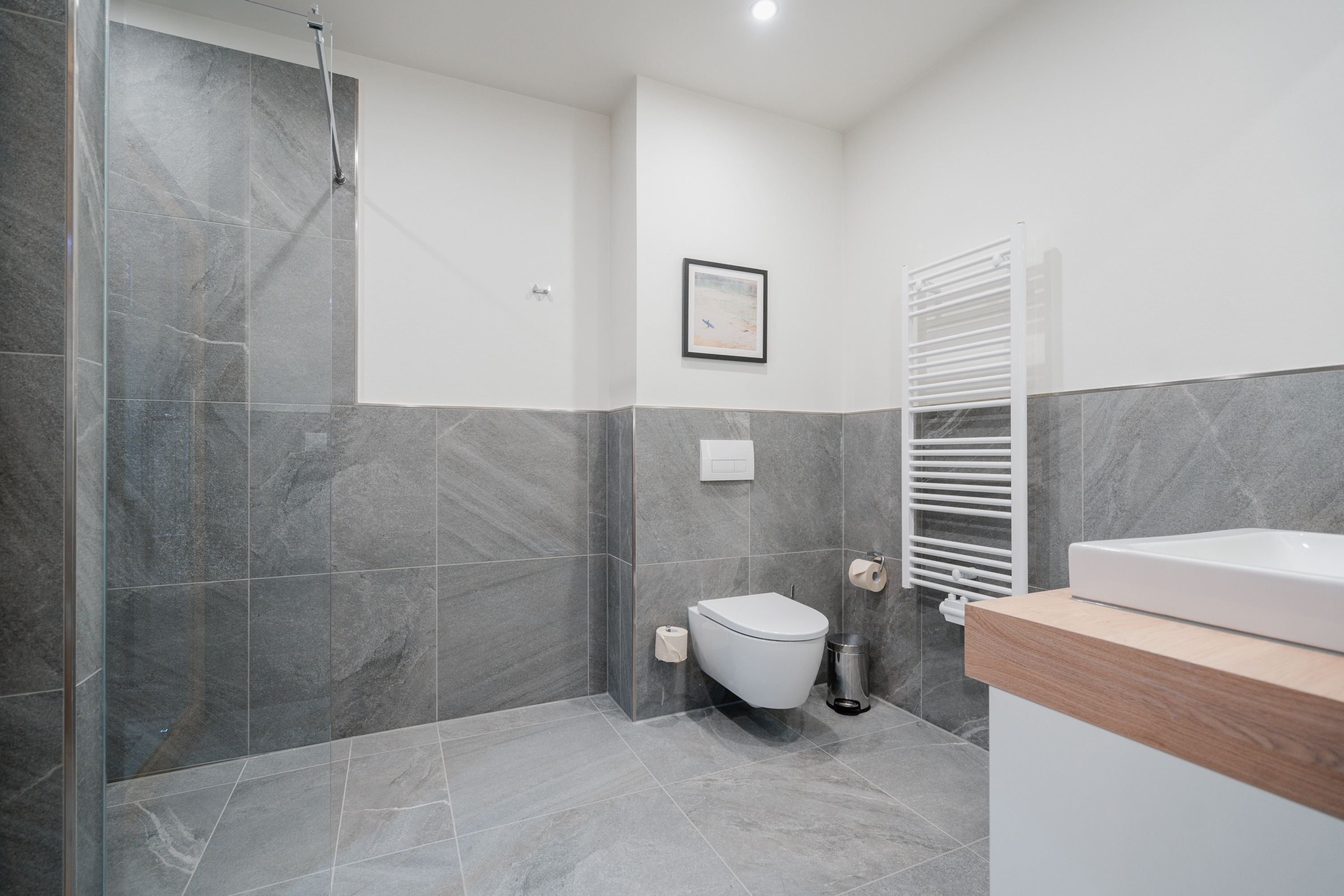 Die 2024 fertig gestellte Strandterrasse liegt direkt an der belebten Strandpromenade und bietet einen einzigartigen Ausblick auf die Grand Dame der historischen Seebrücken sowie die historische Konzertmuschel, einem beliebten Treffpunkt für Kunst und Kultur. Dahinter liegt die Ostsee ein Panorama, das zu den schönsten in den Kaiserbädern gehört. Es ist wie das Abtauchen in eine andere Zeit. In eine Zeit, in der man mit Stock, Sonnenschirm und Hut fürs Sehen und gesehen werden über die Promenade schlenderte; aber auch in eine Zeit, in der damals wie heute Zeit einmal für eine kurze Weile keine Rolle spielt. Weil man angekommen ist im Loslassen, Entspannen und Genießen. Es ist dieser besondere Geruch nach Meeresluft und Freiheit, der in Erinnerung bleibt. Dazu die Bilder, die man mitnimmt. Von langen Strandspaziergängen, vom Lachen in fröhlich schäumenden Ostseewellen, von der Zeit in einem wunderschönen Urlaubsdomizil. Denn genau das ist die Strandterrasse mit ihren 56 modernen und exklusiven Ferienappartements direkt gegenüber der Ahlbecker Seebrücke. Die Ein-, Zwei- oder Dreizimmerwohnungen zwischen 40 und 70 Quadratmeter groß sind von einer Innenarchitektin gemeinsam mit unserem Erfahrungsschatz an Gästewünschen mit viel Liebe zum Detail und ganz individuell konzipiert worden. Entspannung und Wohlfühlen stehen an erster Stelle. Alles ist aufeinander abgestimmt und sorgt für eine gemütliche Atmosphäre. Wählen Sie zwischen einem Domizil in einem hellen, sandfarbenen Designkonzept oder einem Appartement mit anthrazitfarbenen Farbakzenten. Alle Appartements verfügen gleichermaßen über eine stilvolle und komfortable Einrichtung, die passgenau angefertigt worden ist, sowie über moderne Küchen und Bäder. Jedem Schlafzimmer ist ein eigenes Bad mit Dusche zugeordnet (außer App. B4.5). Die Appartements besitzen fast alle einen Balkon viele schauen sogar zur Ostsee hinaus. Die meisten Feriendomizile haben einen Elektrokamin und Infrarotsaunen. Im Erdgeschoss befindet sich ein separater Gemeinschaftsraum für Fahrräder. Außerdem besteht die Möglichkeit, im Gemeinschaftswaschraum 2 Waschmaschinen & Trockner zu nutzen. Ergänzt wird das Angebot durch eine Gemeinschaftssauna, die täglich von 11:00 bis 22:00 Uhr nutzbar ist. In der Tiefgarage (Einfahrtshöhe 2,03 Meter) steht für jede Wohnung 1 Pkw-Stellplatz zur Verfügung. Ist alles zur Zufriedenheit untergebracht? Dann kann der Urlaub ja beginnen. Und beim Blick vom Balkon über die Ostsee treffen sich zum Sonnenaufgang das Heute und das Damals. Gelassenheit legt sich beim Gang hinunter an den Strand auf die Seele. Jetzt darf die Zeit stehenbleiben.