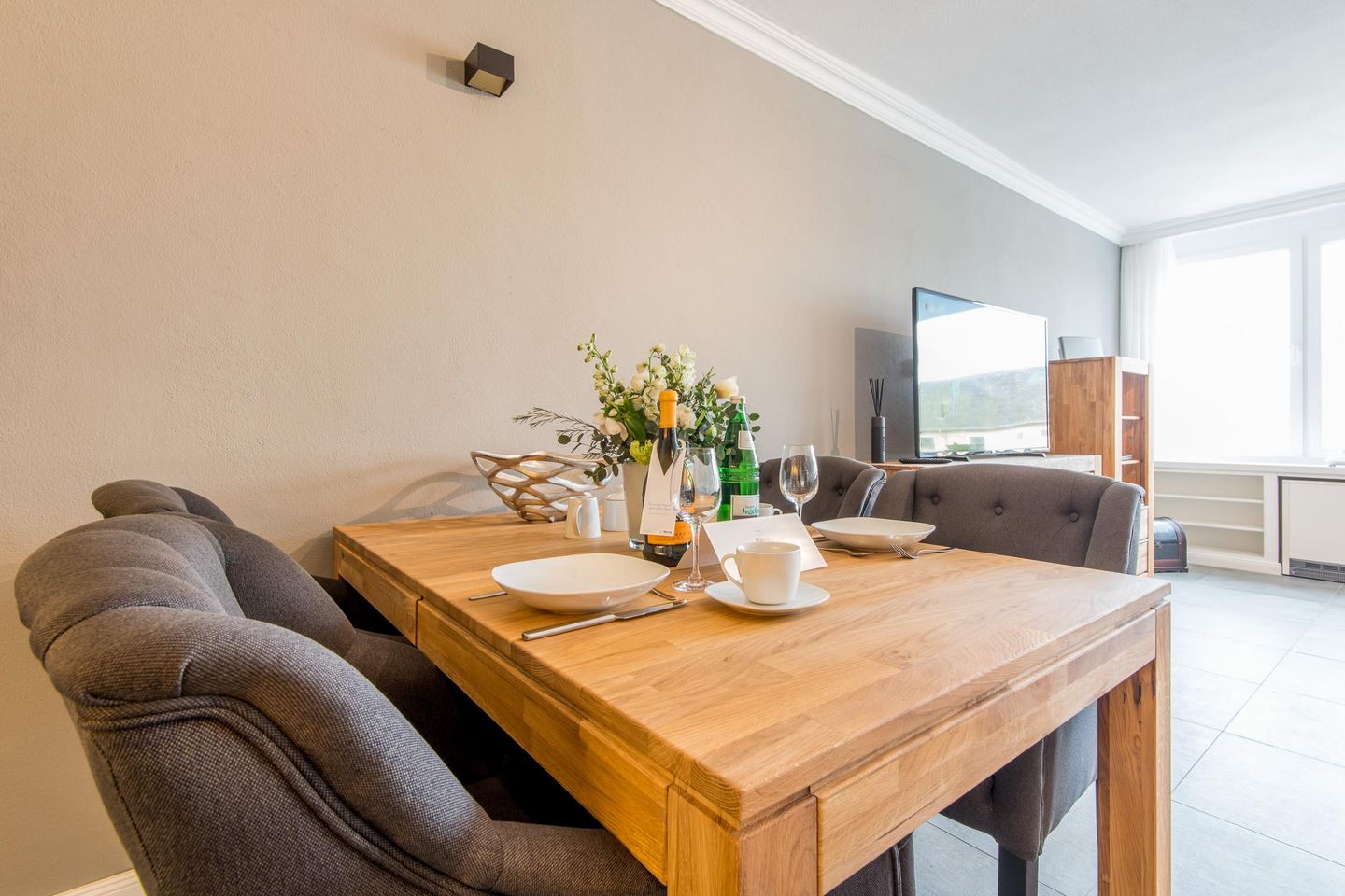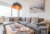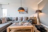 Der offene Wohnbereich lädt mit einem großen Ecksofa, das auch als Schlafgelegenheit genutzt werden kann, und einem TV zu gemütlichen Abenden ein. Ein Esstisch bietet Platz für 4 Personen und sorgt für eine angenehme Atmosphäre bei gemeinsamen Mahlzeiten. Die hellen Farben und modernen Designelemente schaffen eine harmonische Wohlfühlatmosphäre. Vom Wohnbereich aus haben Sie direkten Zugang zum Balkon, der ideal für entspannte Stunden an der frischen Luft ist.