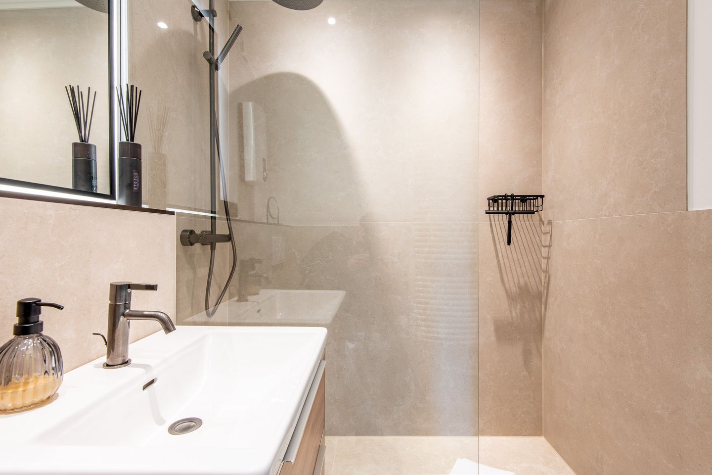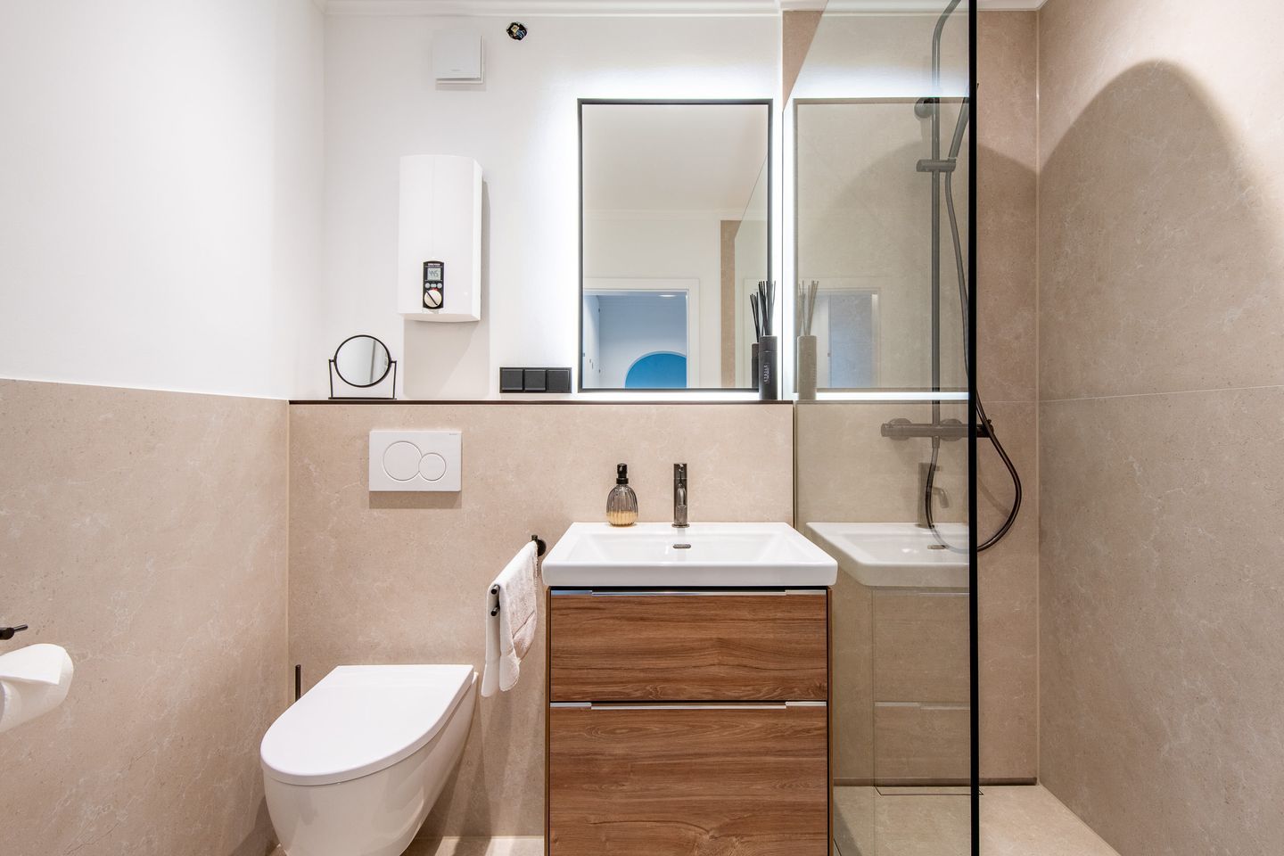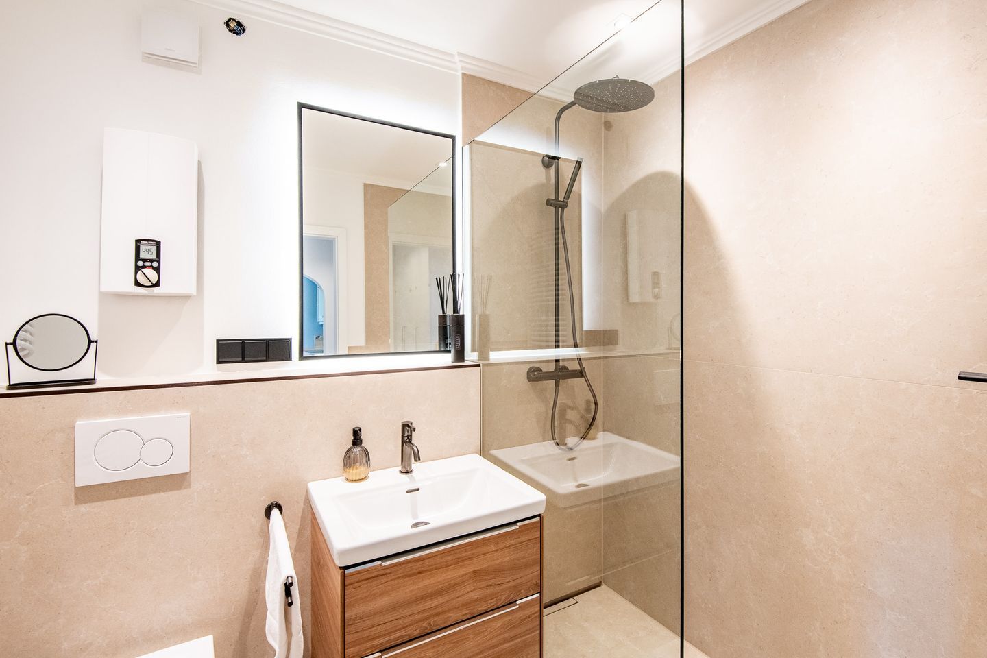 Das moderne Badezimmer verfügt über eine Dusche, ein WC, einen Handtuchwärmer und einen Föhn. Die hochwertige Ausstattung sorgt für einen angenehmen Start in den Tag.