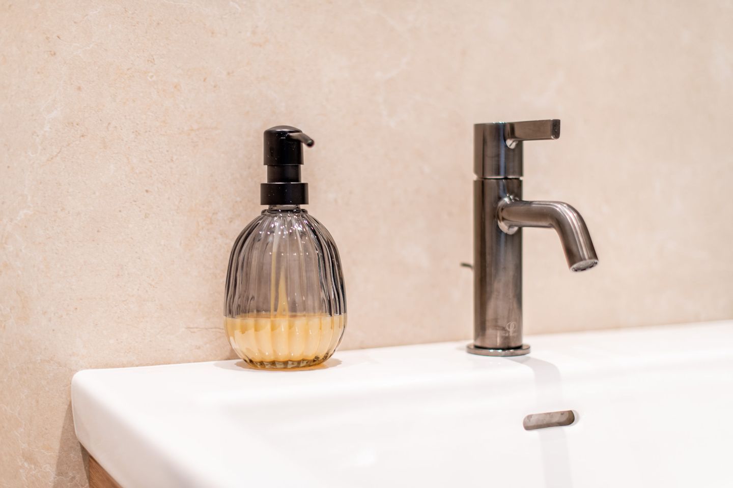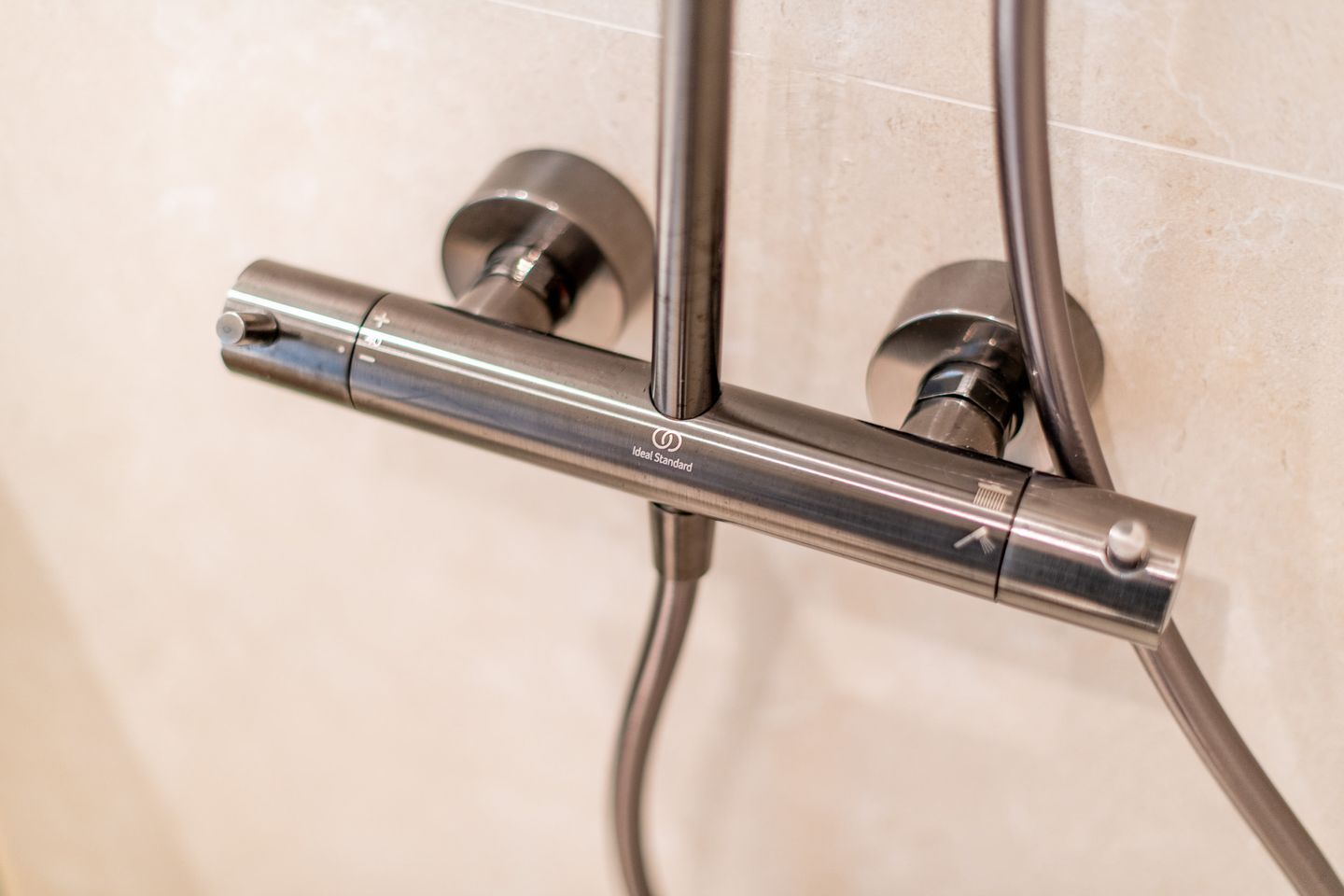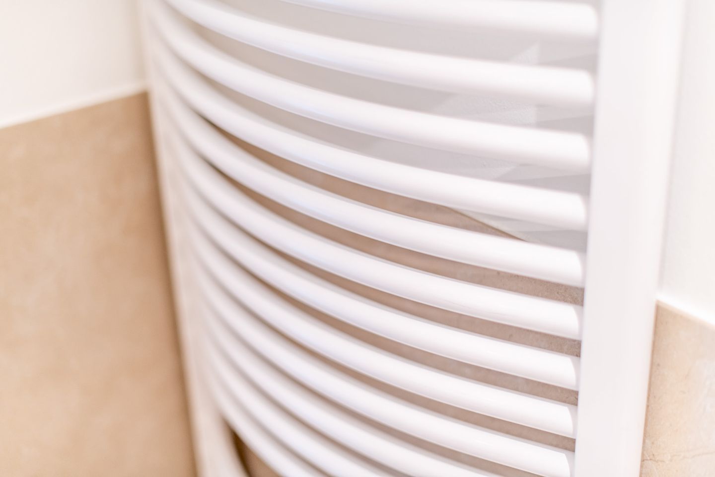 Das moderne Badezimmer verfügt über eine Dusche, ein WC, einen Handtuchwärmer und einen Föhn. Die hochwertige Ausstattung sorgt für einen angenehmen Start in den Tag.