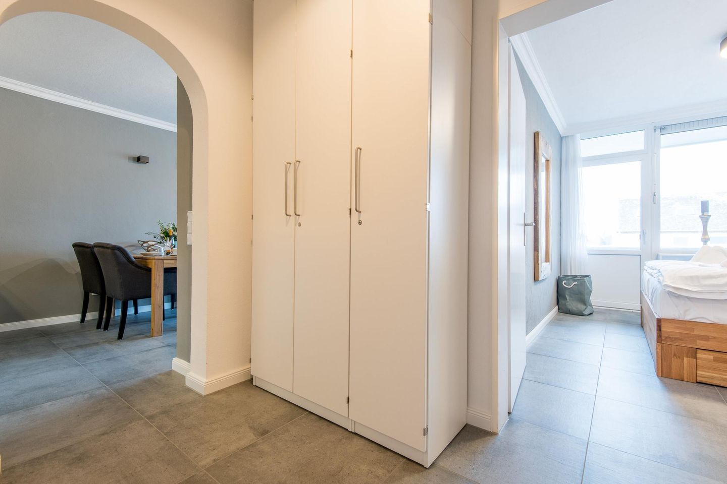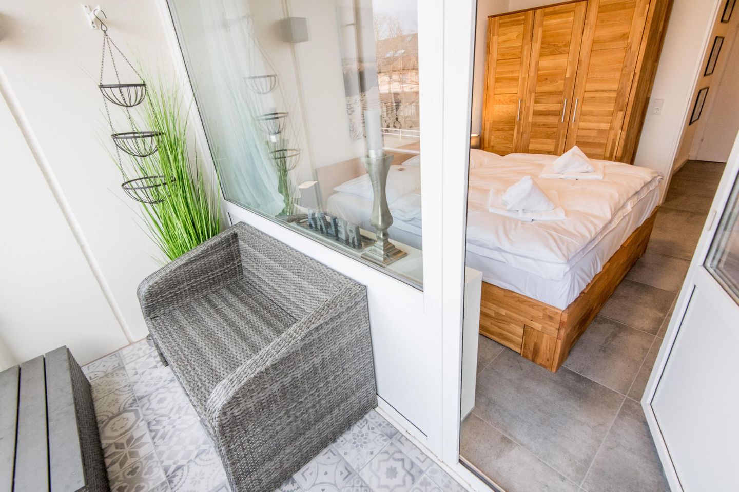 Das Schlafzimmer bietet Ihnen ein komfortables Doppelbett (180x200 cm) und einen großen Kleiderschrank für ausreichend Stauraum. Auch vom Schlafzimmer aus haben Sie direkten Zugang zum Balkon, auf dem Sie die Morgensonne genießen können.