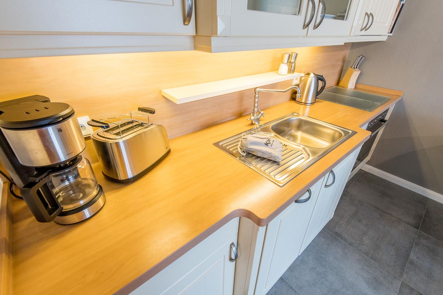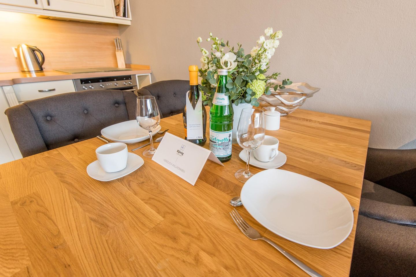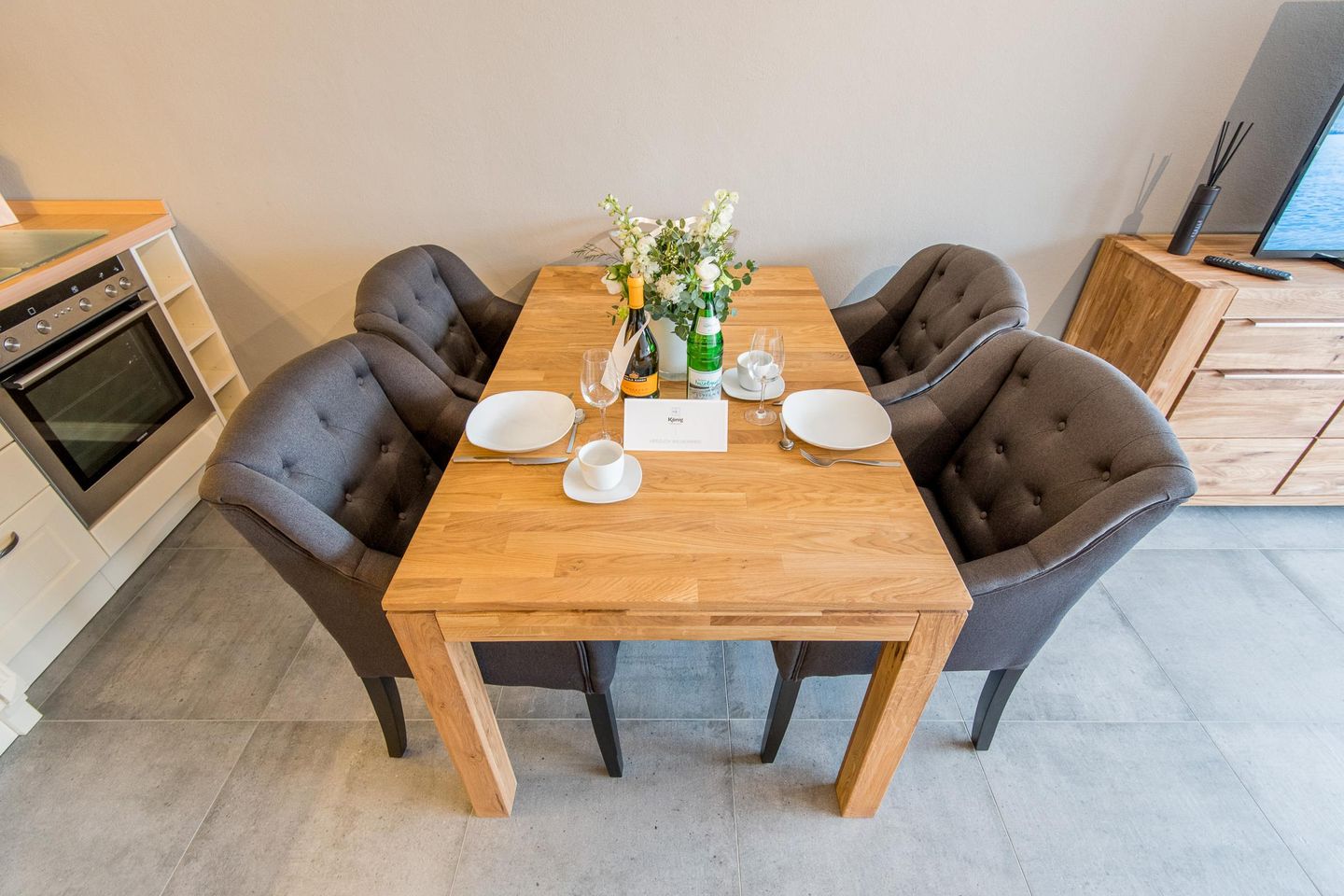 Die offene Küche ist mit modernem Komfort und einer umfangreichen Ausstattung versehen. Hier finden Sie alles, was Sie benötigen, um Ihre Lieblingsgerichte zuzubereiten und den Tag kulinarisch zu genießen.