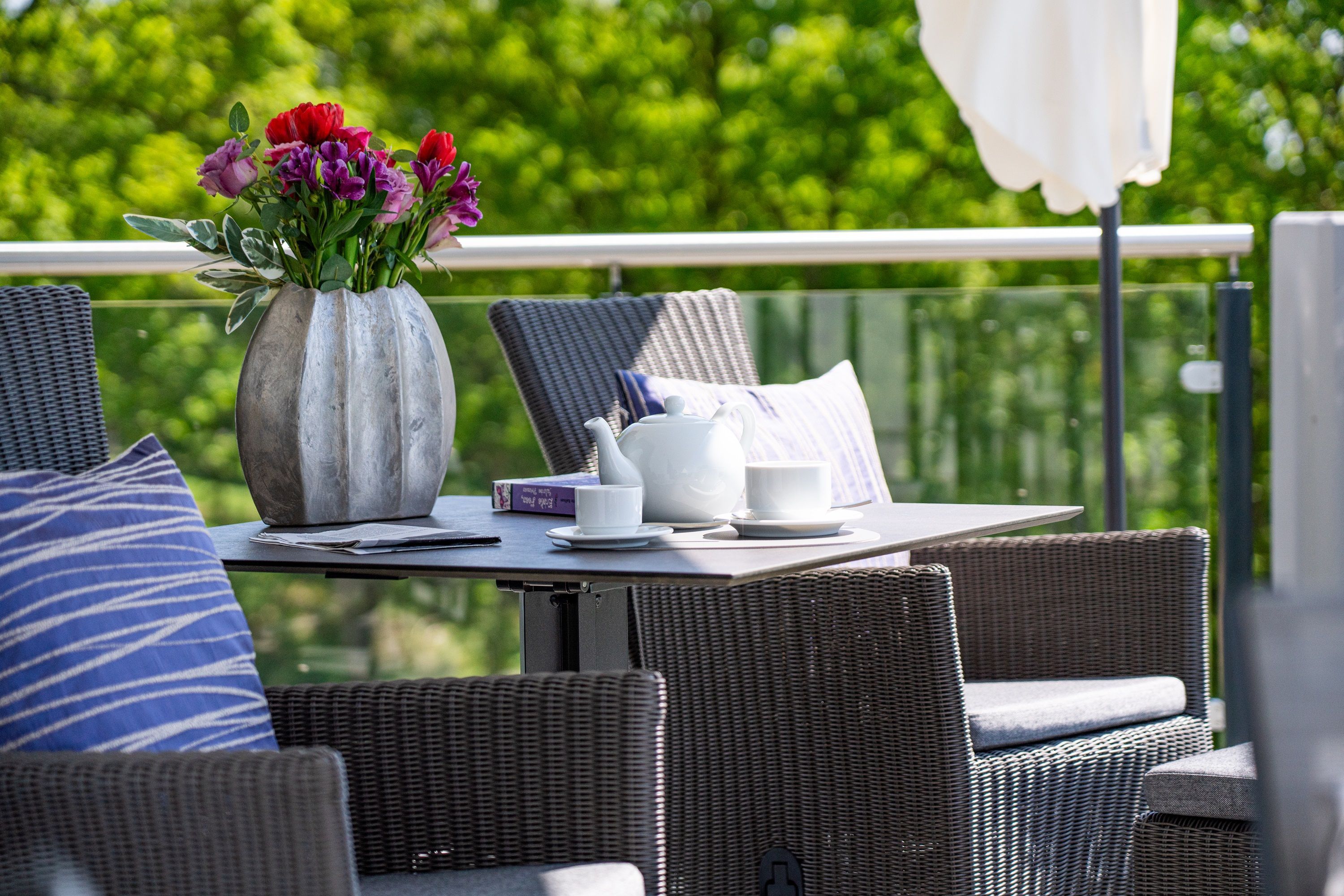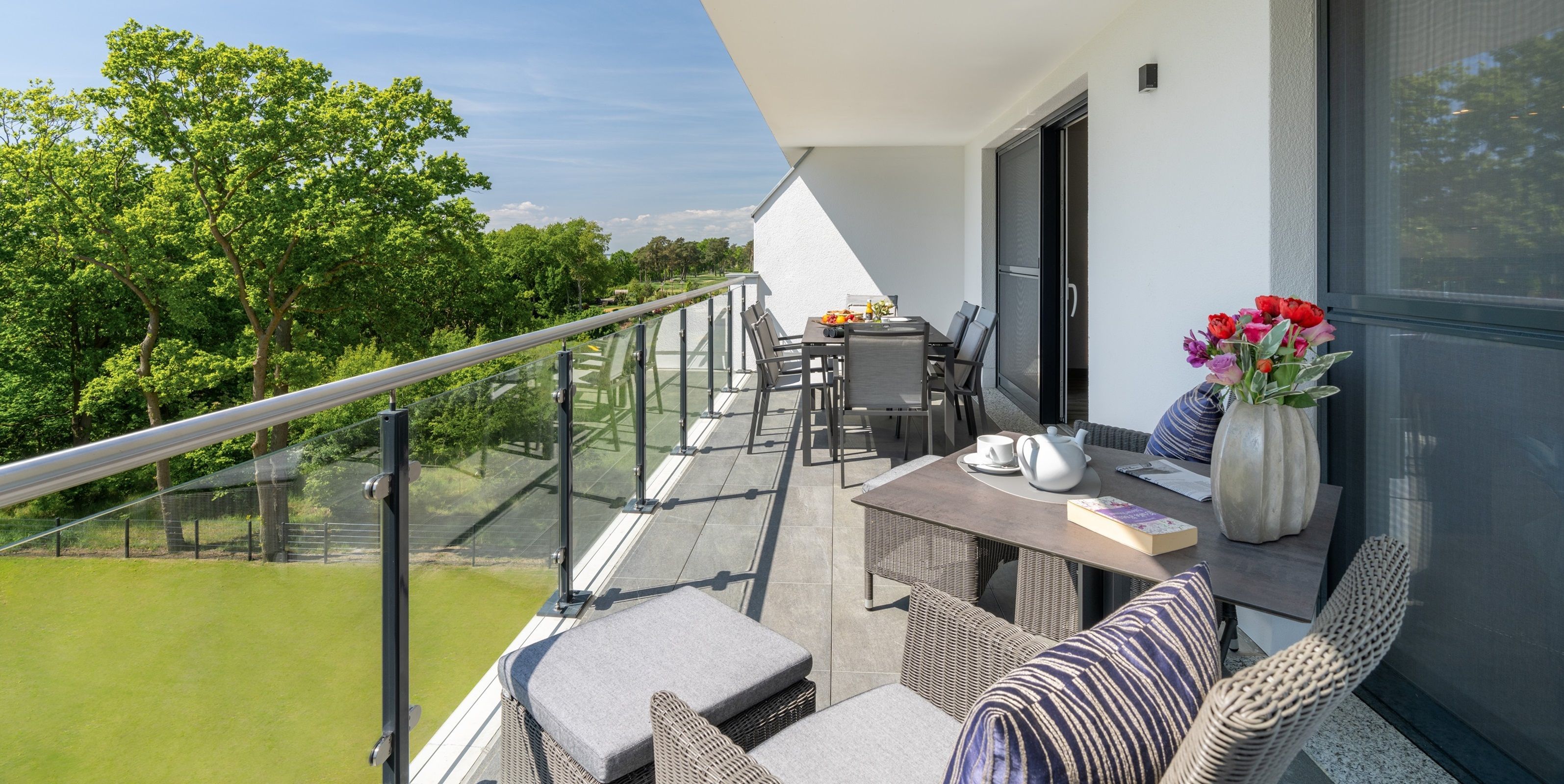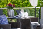 Der 18 m² große, überdachte Sonnenbalkon bietet reichlich Platz für Entspannung und Geselligkeit. Ein großer Esstisch mit sechs Stühlen lädt zu gemeinsamen Mahlzeiten ein, während die gemütliche Sitzgruppe mit Bistrotisch und zwei verstellbaren Relaxsesseln samt Fußhockern perfekte Plätze für entspannte Stunden bieten.