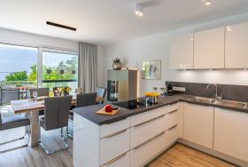 Informationen für Gäste mit Mobilitätseinschränkung: Der Zugang vom Carportstellplatz bis zum Hauseingang ist barrierefrei gestaltet. Direkt vor dem Haus befindet sich eine Kurzzeitparkfläche, die für Be- und Entladevorgänge genutzt werden kann. Die Distanz von der Carportanlage bis zur Hauseingangstür beträgt etwa 30 Meter. Die Breite der Haustür beträgt 100 cm und weist eine Schwelle von etwa 1,5 cm Höhe auf. Der Aufzug im Treppenhaus bedient alle Etagen des Hauses, einschließlich des Freizeit- und Saunabereichs im Untergeschoss. Die Türbreite des Aufzugs beträgt 90 cm, die Tiefe liegt bei 130 cm. Die schwellenlose Wohnungstür weist eine Breite von 90 cm auf. Die Breiten der schwellenlosen Zimmertüren liegen bei 80 cm (Ausnahme: Türbreite von der Abstellkammer beträgt 70 cm). Der schwellenlose Duscheingang im en suite Badezimmer weist eine Breite von 90 cm auf, die Tiefe liegt bei 200 cm. Auf Wunsch kann ein Duschhocker kostenfrei zur Verfügung gestellt werden. Die Waschtische sind nicht unterfahrbar und Haltegriffe sind nicht in den Badezimmern vorhanden. Der Duscheingang im zweiten Badezimmer weist eine Breite von 95 cm auf und die Tiefe beträgt 130 cm. Die Betten weisen eine Höhe von 65 cm auf und sind unterfahrbar (max. 10 cm). Die Balkonschiebetür lässt sich auf eine Breite von 130 cm öffnen, die Höhe der Schwelle beträgt 1,5 cm. Die Sauna im Untergeschoss ist schwellenlos erreichbar. Die Schwelle am Saunaeingang beträgt 10 cm, die Breite der Saunatür beträgt 60 cm. Die Breite der Tür zum Ruheraum beträgt 90 cm und weist eine Schwelle von etwa 2 cm auf.