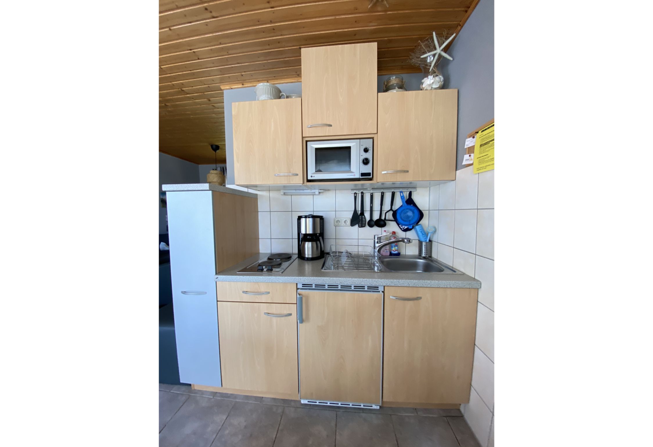 - Gut ausgestattete Küche: Kühlschrank, Herd (2 Platten), Mikrowelle, Wasserkocher, Toaster, Kaffeemaschine