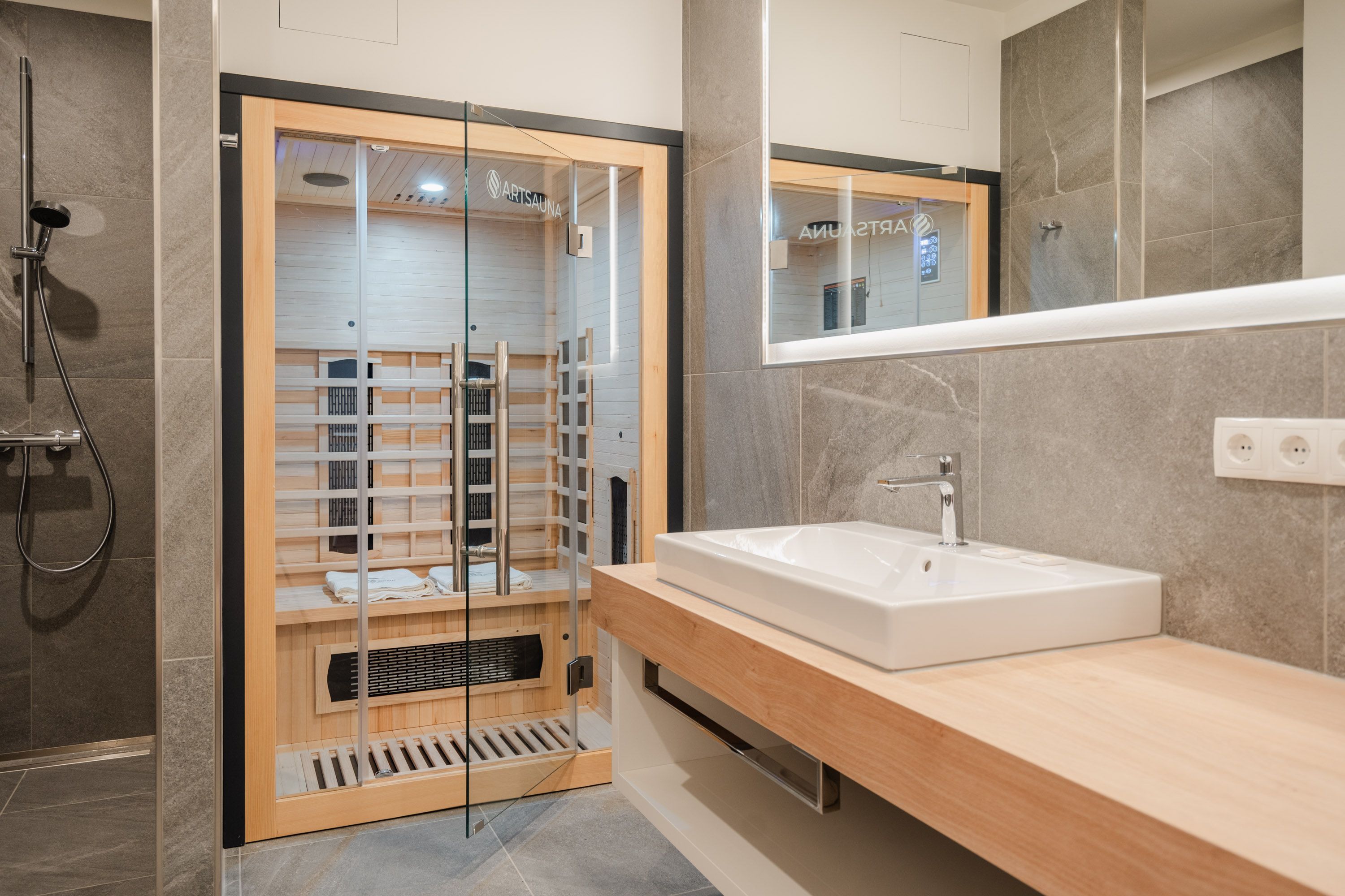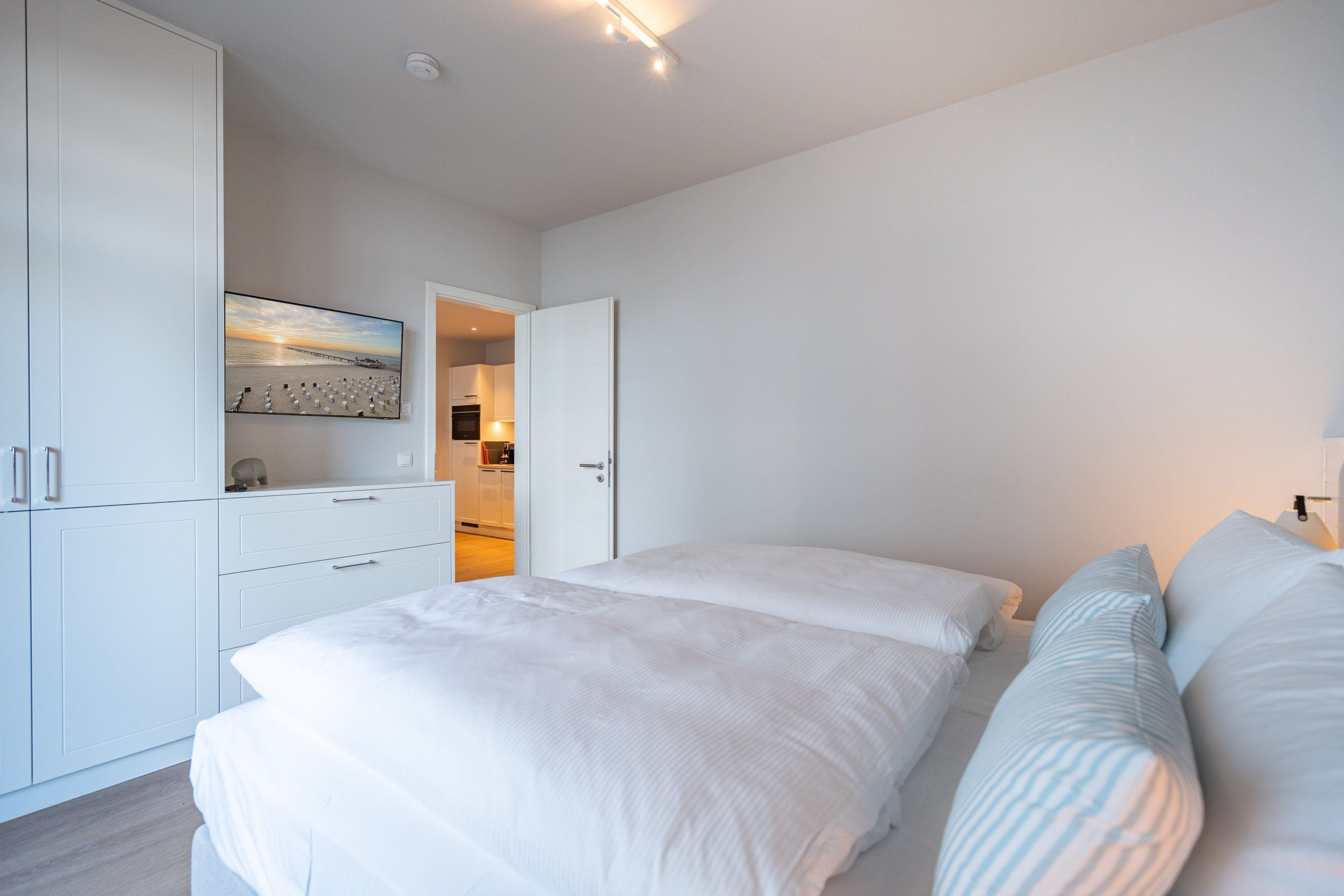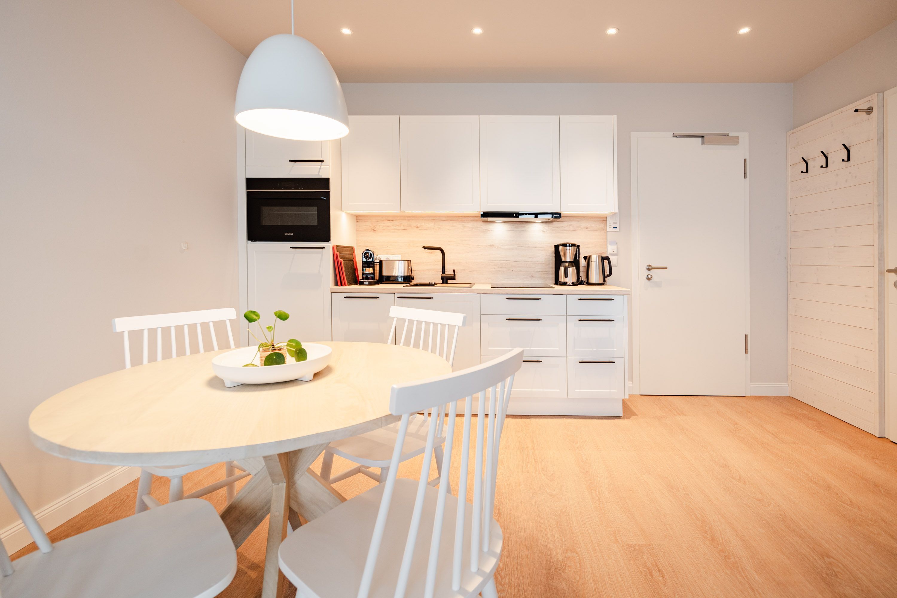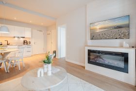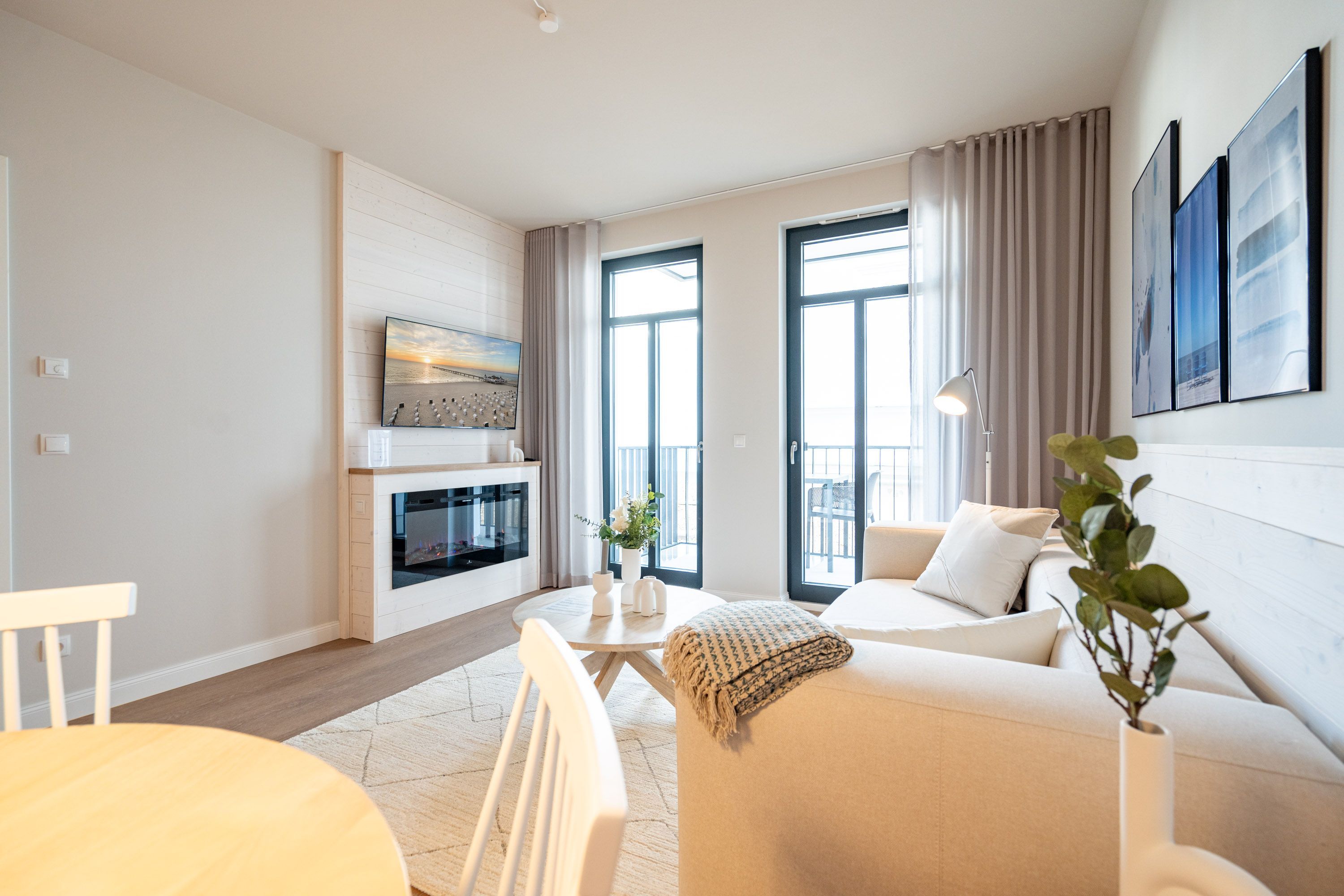 Das gemütliche 2-Raum-Appartement A1.2 im ersten Obergeschoss wartet nur darauf, seine beiden Gäste mit seiner harmonischen und ausgleichenden Atmosphäre in entspannte Urlaubsstimmung zu versetzen. Auf 46 Quadratmetern ist hier alles so aufeinander abgestimmt, dass es Ihnen an nichts fehlen wird, was Sie für unvergessliche Glücksmomente benötigen. Eine stilvolle und hochwertige Einrichtung heißt Sie schon beim Eintreten in das Wohn-Esszimmer herzlich willkommen. Lichtdurchflutet ist es eine echte Wohlfühloase mit einem gemütlichen Sofa, einem 50-Zoll-Flachbildfernseher und einem Elektrokamin (ohne Wärmeabgabe). Hier fällt das Relaxen und Ausspannen leicht. Eine vollausgestattete Küchenzeile lädt dazu ein, sich für die kulinarischen Gaumenfreuden selbst zu betätigen. Der schöne Esstisch eignet sich ideal zum anschließenden Genießen und Zusammensitzen. In dem großen Boxspringdoppelbett (1,80m x 2,00m) im Schlafzimmer werden die Nächte ein Traum. Im Schlafzimmer befindet sich ein weiterer, 43-Zoll-Flachbildfernseher sowie ein geräumiger Kleiderschrank und eine Kommode. Das Appartement besitzt sogar zwei Balkone, auf denen Sie die frische Ostseeluft tief in sich aufnehmen können und seitlich auch Blick auf die Ahlbecker Seebrücke haben. Gönnen Sie Ihren Augen von den Balkonmöbeln oder der Sonnenliege aus ein bisschen Weitsicht. Sie werden es sofort spüren, wie erholsam sich das auf ihre Seele auswirkt. Zugang zu den beiden Nordbalkonen haben Sie jeweils vom Wohnzimmer und vom Schlafzimmer. Das innenliegende Bad verfügt über eine Dusche, ein WC, einen Waschtisch und eine Infrarotsauna. Hier können Sie bei wohliger Wärme vollkommen abschalten und runterkommen. Zum Appartement gehört ein PKW-Stellplatz in der Tiefgarage, die Sie bequem über den Fahrstuhl erreichen können. Lassen Sie sich also fallen in das Rund-um-Sorglos-Gefühl und genießen Sie die Annehmlichkeiten dieser charmanten Ferienwohnung.