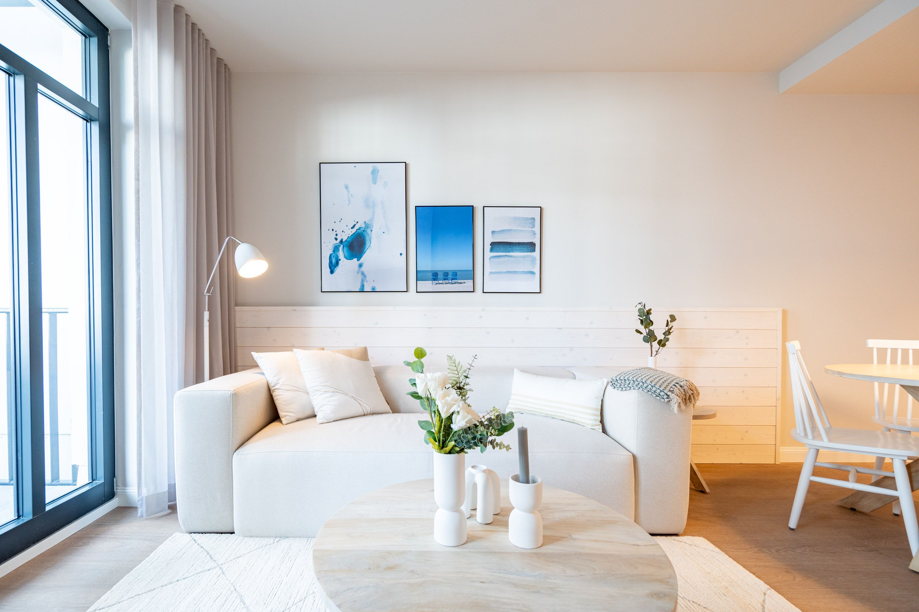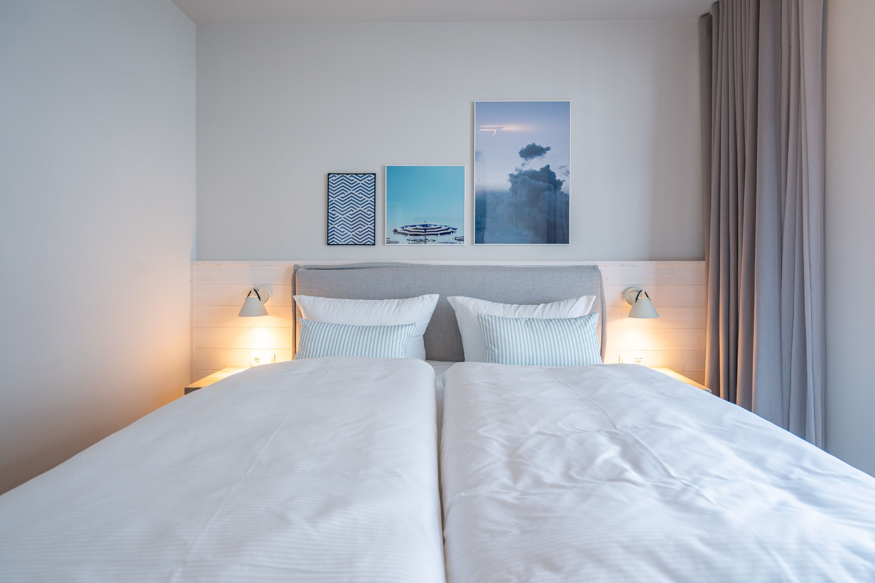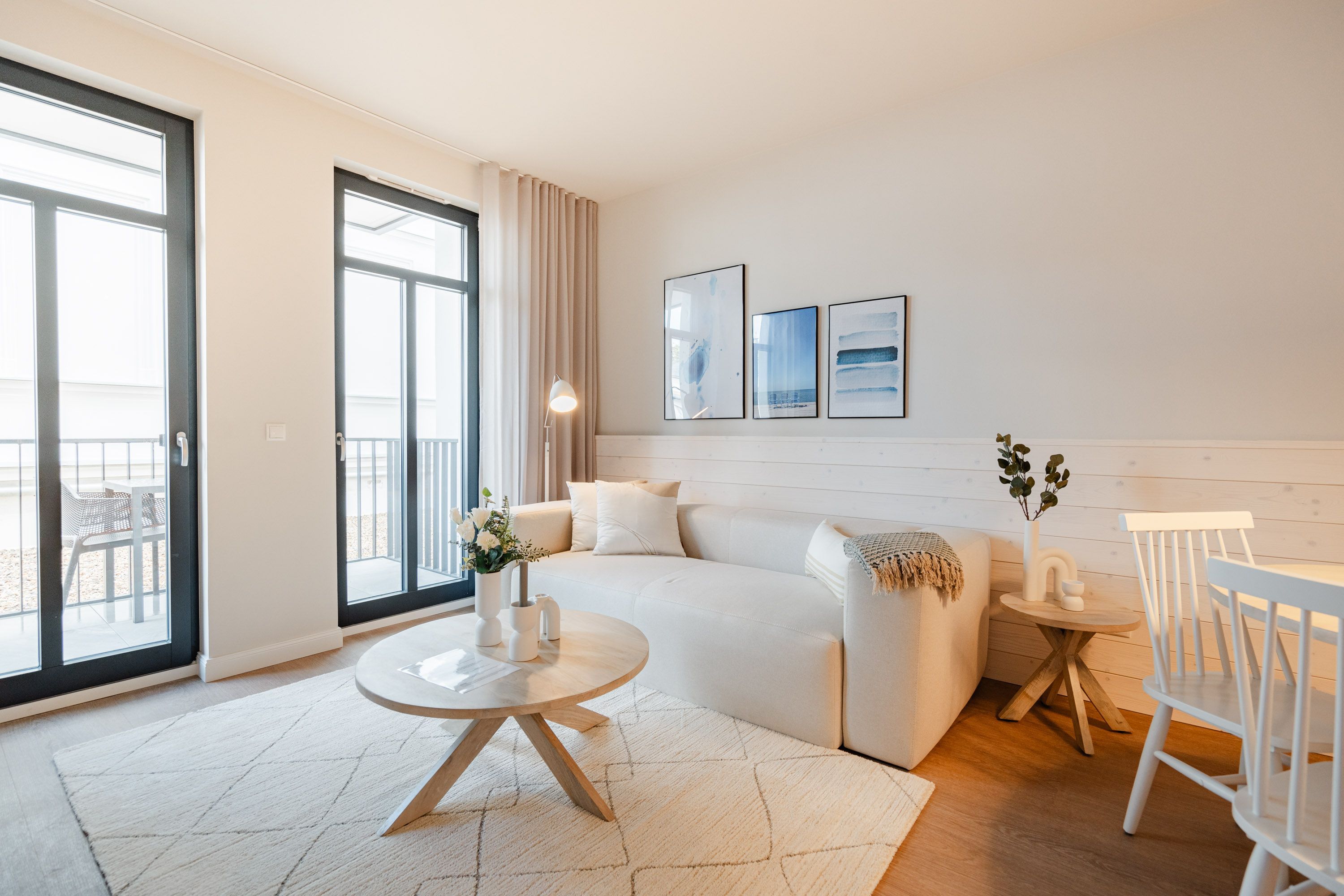 Die 2024 fertig gestellte Strandterrasse liegt direkt an der belebten Strandpromenade und bietet einen einzigartigen Ausblick auf die Grand Dame der historischen Seebrücken sowie die historische Konzertmuschel, einem beliebten Treffpunkt für Kunst und Kultur. Dahinter liegt die Ostsee ein Panorama, das zu den schönsten in den Kaiserbädern gehört. Es ist wie das Abtauchen in eine andere Zeit. In eine Zeit, in der man mit Stock, Sonnenschirm und Hut fürs Sehen und gesehen werden über die Promenade schlenderte; aber auch in eine Zeit, in der damals wie heute Zeit einmal für eine kurze Weile keine Rolle spielt. Weil man angekommen ist im Loslassen, Entspannen und Genießen. Es ist dieser besondere Geruch nach Meeresluft und Freiheit, der in Erinnerung bleibt. Dazu die Bilder, die man mitnimmt. Von langen Strandspaziergängen, vom Lachen in fröhlich schäumenden Ostseewellen, von der Zeit in einem wunderschönen Urlaubsdomizil. Denn genau das ist die Strandterrasse mit ihren 56 modernen und exklusiven Ferienappartements direkt gegenüber der Ahlbecker Seebrücke. Die Ein-, Zwei- oder Dreizimmerwohnungen zwischen 40 und 70 Quadratmeter groß sind von einer Innenarchitektin gemeinsam mit unserem Erfahrungsschatz an Gästewünschen mit viel Liebe zum Detail und ganz individuell konzipiert worden. Entspannung und Wohlfühlen stehen an erster Stelle. Alles ist aufeinander abgestimmt und sorgt für eine gemütliche Atmosphäre. Wählen Sie zwischen einem Domizil in einem hellen, sandfarbenen Designkonzept oder einem Appartement mit anthrazitfarbenen Farbakzenten. Alle Appartements verfügen gleichermaßen über eine stilvolle und komfortable Einrichtung, die passgenau angefertigt worden ist, sowie über moderne Küchen und Bäder. Jedem Schlafzimmer ist ein eigenes Bad mit Dusche zugeordnet (außer App. B4.5). Die Appartements besitzen fast alle einen Balkon viele schauen sogar zur Ostsee hinaus. Die meisten Feriendomizile haben einen Elektrokamin und Infrarotsaunen. Im Erdgeschoss befindet sich ein separater Gemeinschaftsraum für Fahrräder. Außerdem besteht die Möglichkeit, im Gemeinschaftswaschraum 2 Waschmaschinen & Trockner zu nutzen. Ergänzt wird das Angebot durch eine Gemeinschaftssauna, die täglich von 11:00 bis 22:00 Uhr nutzbar ist. In der Tiefgarage (Einfahrtshöhe 2,03 Meter) steht für jede Wohnung 1 Pkw-Stellplatz zur Verfügung. Ist alles zur Zufriedenheit untergebracht? Dann kann der Urlaub ja beginnen. Und beim Blick vom Balkon über die Ostsee treffen sich zum Sonnenaufgang das Heute und das Damals. Gelassenheit legt sich beim Gang hinunter an den Strand auf die Seele. Jetzt darf die Zeit stehenbleiben.