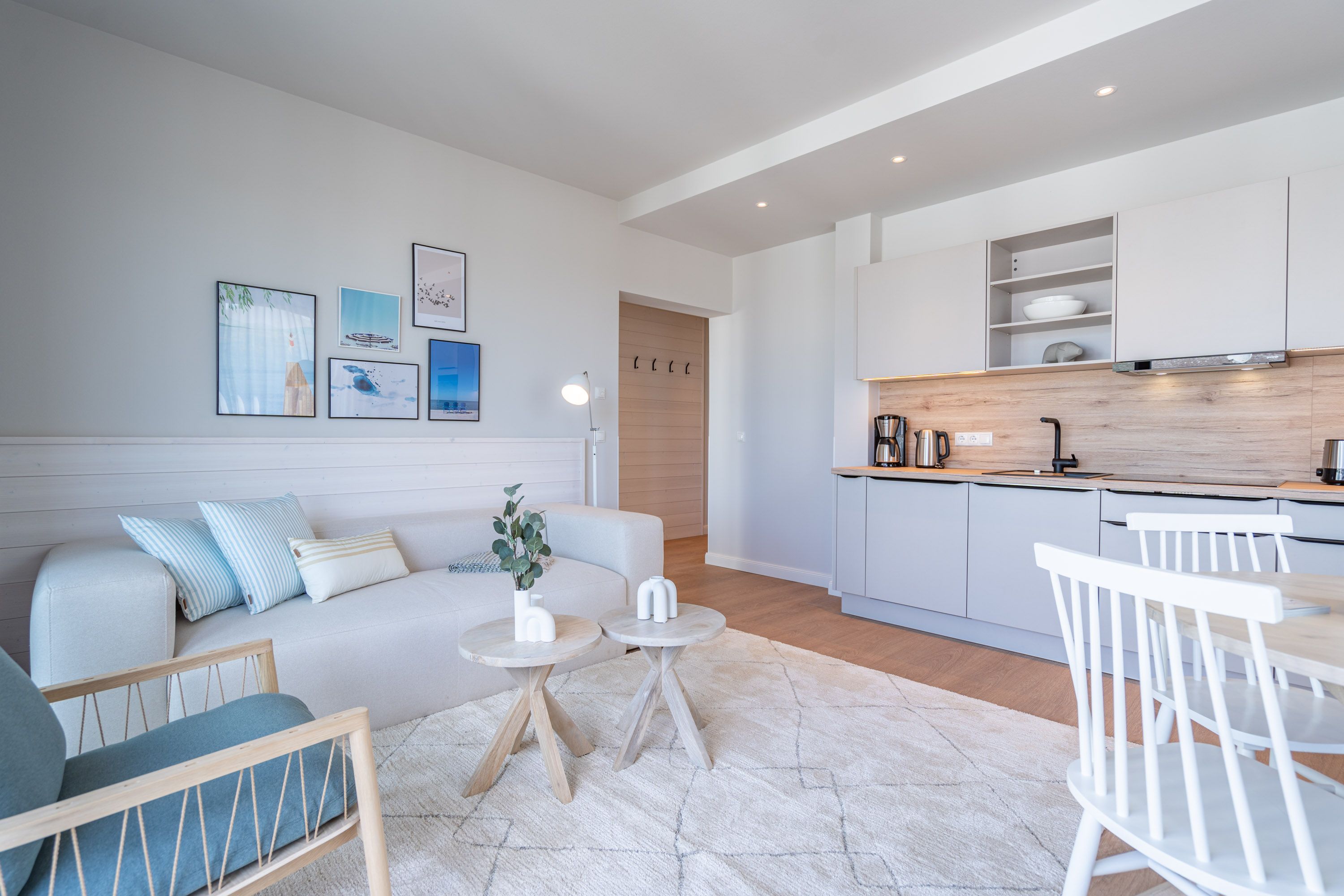 Ein helles und freundliches Urlaubsparadies empfängt Sie im 3-Raum-Appartement B 2.8 (Haus B) in der 2. Etage der Strandterrasse. Freuen Sie sich auf viel Gemütlichkeit und Komfort, denn die Wohnung ist ein absolutes Wohlfühlreich für bis zu 4 Personen. Viel Licht und wunderschöne Designmöbel verschönern Ihren Aufenthalt in den 62 Quadratmetern ungemein. Schon beim Eintreten bekommen Sie ein entspanntes Urlaubsgefühl. Der offene Wohn- und Essbereich bietet eine moderne Küchenzeile mit vielen Annehmlichkeiten wie einem Backofen, einem 4-Platten-Induktionsherd und einer Nespresso-Kapselmaschine. Hier macht das Kochen und das Zubereiten von Frühstück, Mittag oder Abendessen richtig Spaß. Essen können Sie am großen Esstisch mit 4 Stühlen. Viel Vergnügen beim Entspannen auf dem Sofa oder dem Sessel. Für Unterhaltung sorgt ein großer Flat-TV (50 Zoll). Wer es gern romantisch mag, kann sich mit dem Elektrokamin (ohne Wärmeabgabe) eine kuschelige Atmosphäre zaubern. Das Appartement verfügt über einen Nord-Ost-Balkon. Treten Sie aus dem Wohnzimmer hinaus und schnuppern Sie frische Ostseeluft. Und hinten schimmert es Blau: Denn zwischen der Strandterrasse und der Villa Seedüwel können Sie vom Balkon aus sogar aufs Meer schauen. Die Wohnung besitzt zwei Schlafzimmer. Beide sind mit einem komfortablen Boxspringdoppelbett (je 1,80m x 2,00m), einem Kleiderschrank und einem Flat-TV (43 Zoll) aufs Trefflichste eingerichtet. Viel Platz also für Privatsphäre und entspannte Nächte. Zwei moderne Bäder mit Dusche, Waschtisch und WC sind Ihre ganz persönlichen Wellnesszonen. Zum Appartement gehört in der Tiefgarage auch ein PKW-Stellplatz. Bei so viel Aussicht auf erholsame Tage kann Ihre Meerauszeit nur wunderschön werden.