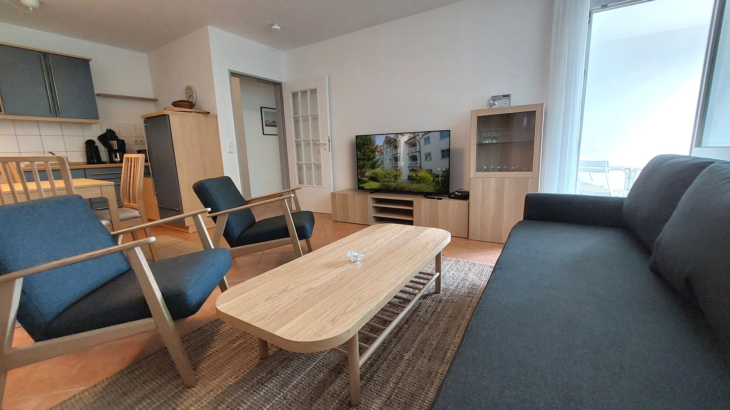 Auch vom Wohnbereich gelangen Sie auf den möblierten Balkon mit wunderbarem Blick ins Grüne.