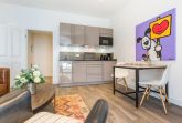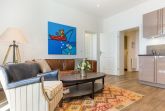 Das gemütliche Wohnzimmer lädt mit einem stilvollen Sofa, Sessel und TV zum Entspannen ein. Der direkte Zugang zum West-Balkon ermöglicht es Ihnen, die Abendsonne zu genießen und die frische Meeresluft zu erleben. Die offene Küche ist perfekt integriert und bietet modernen Komfort mit allen notwendigen Annehmlichkeiten. Ein Esstisch mit drei Stühlen lädt zu gemeinsamen Mahlzeiten ein.