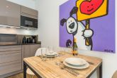 Die 2-Zimmer-Ferienwohnung 'Ed' bietet auf ca. 41 m² Wohnfläche im 1. Obergeschoss (mit Fahrstuhl) eine stilvolle und komfortable Unterkunft für bis zu 2 Personen. Sie befindet sich in einem kunstvollen, modern umgebauten Komplex in zentraler Lage an der Kurpromenade von Westerland, nur 150 Meter vom Strand entfernt. Jede der Wohnungen wurde von der Kunstgalerie Mensing individuell gestaltet, und das Interieur mit Mobiliar aus Frankreich, Belgien und England schafft eine exklusive Retro-Wohlfühlatmosphäre.