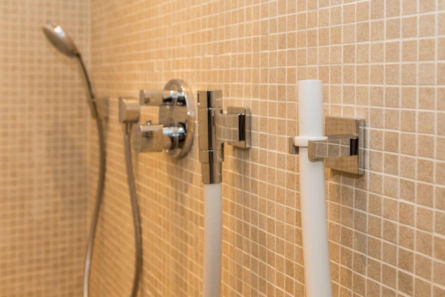 Das moderne Badezimmer ist mit einer Badewanne, WC, Fön und Handtuchwärmer ausgestattet.