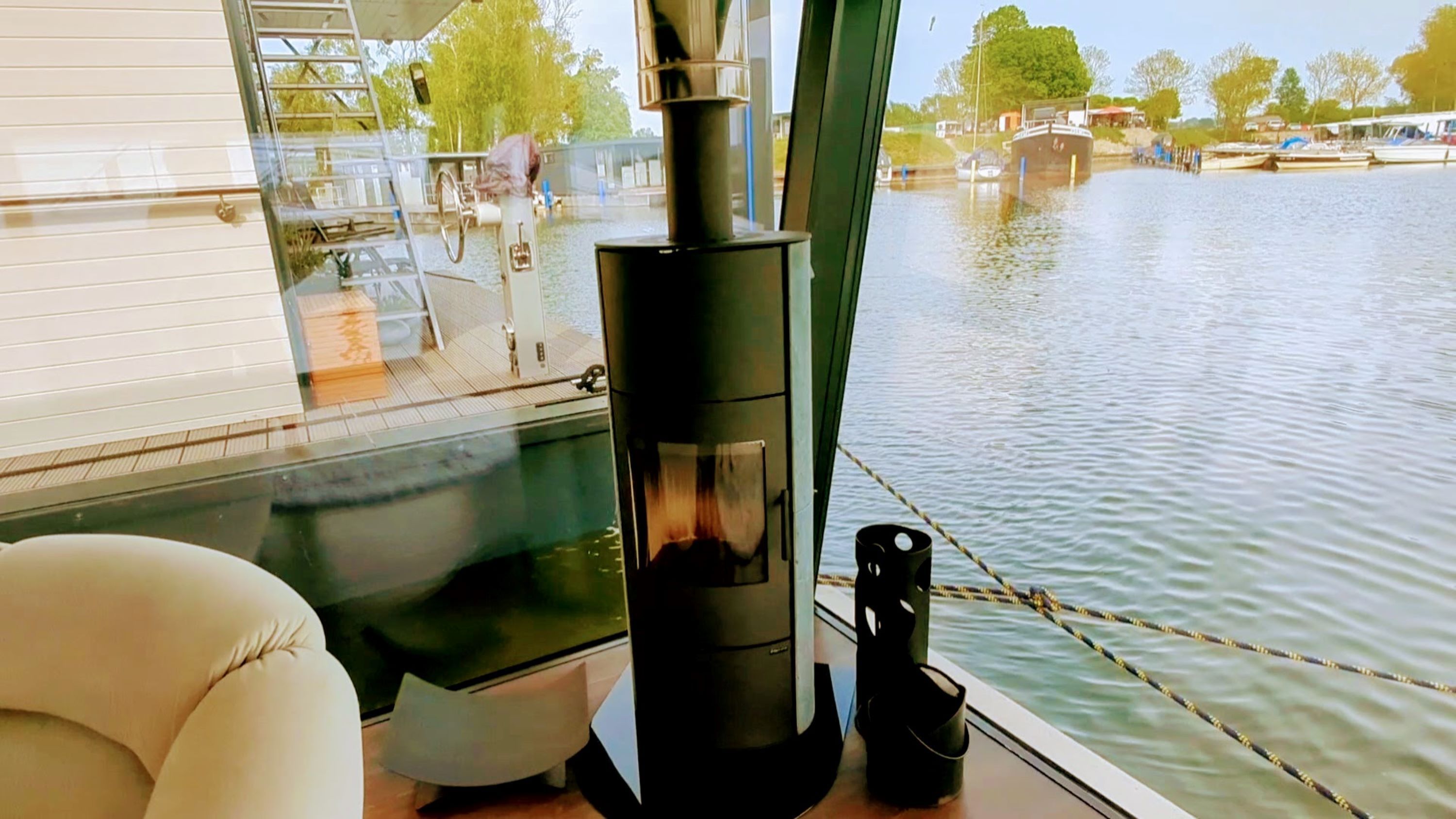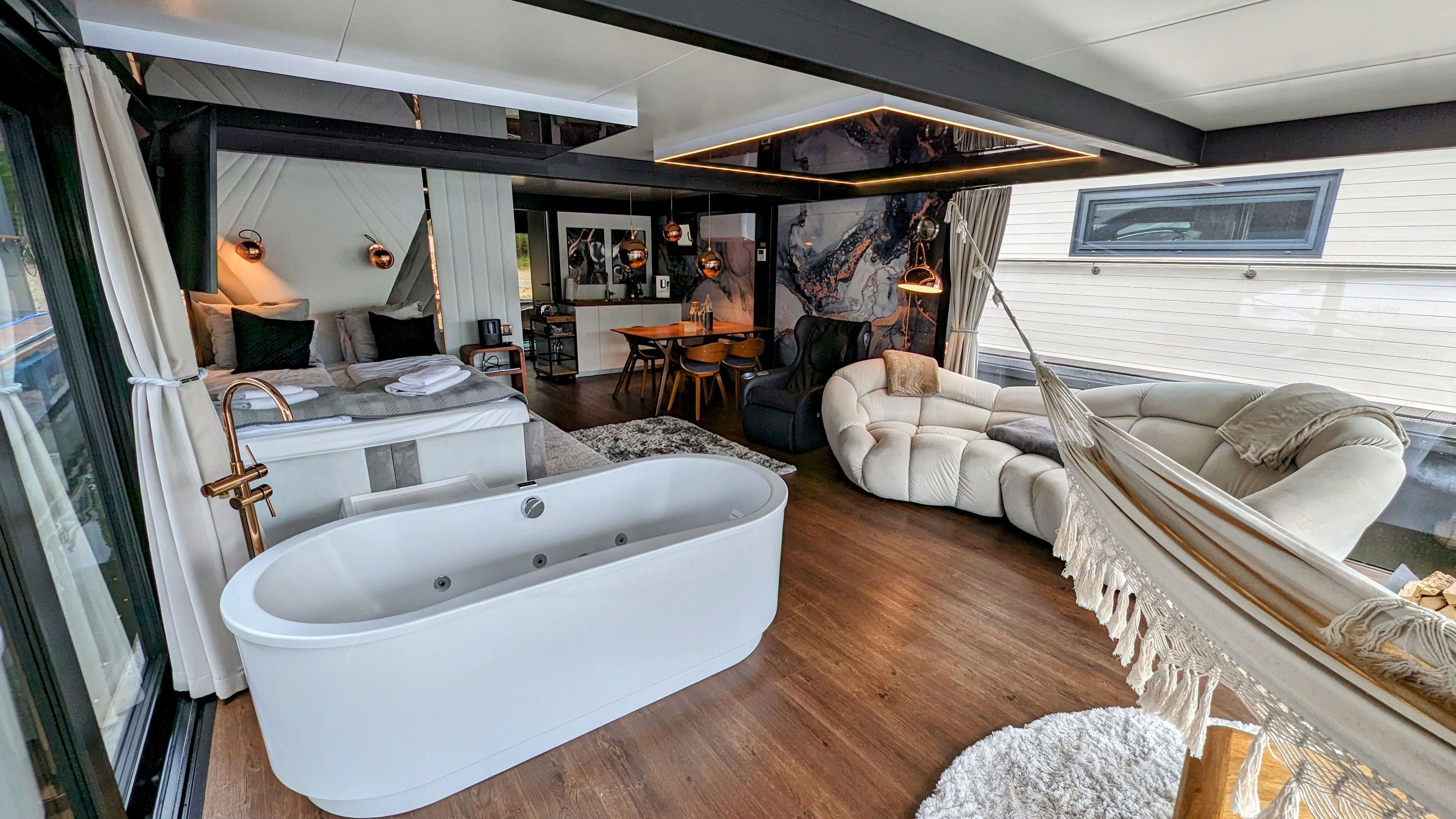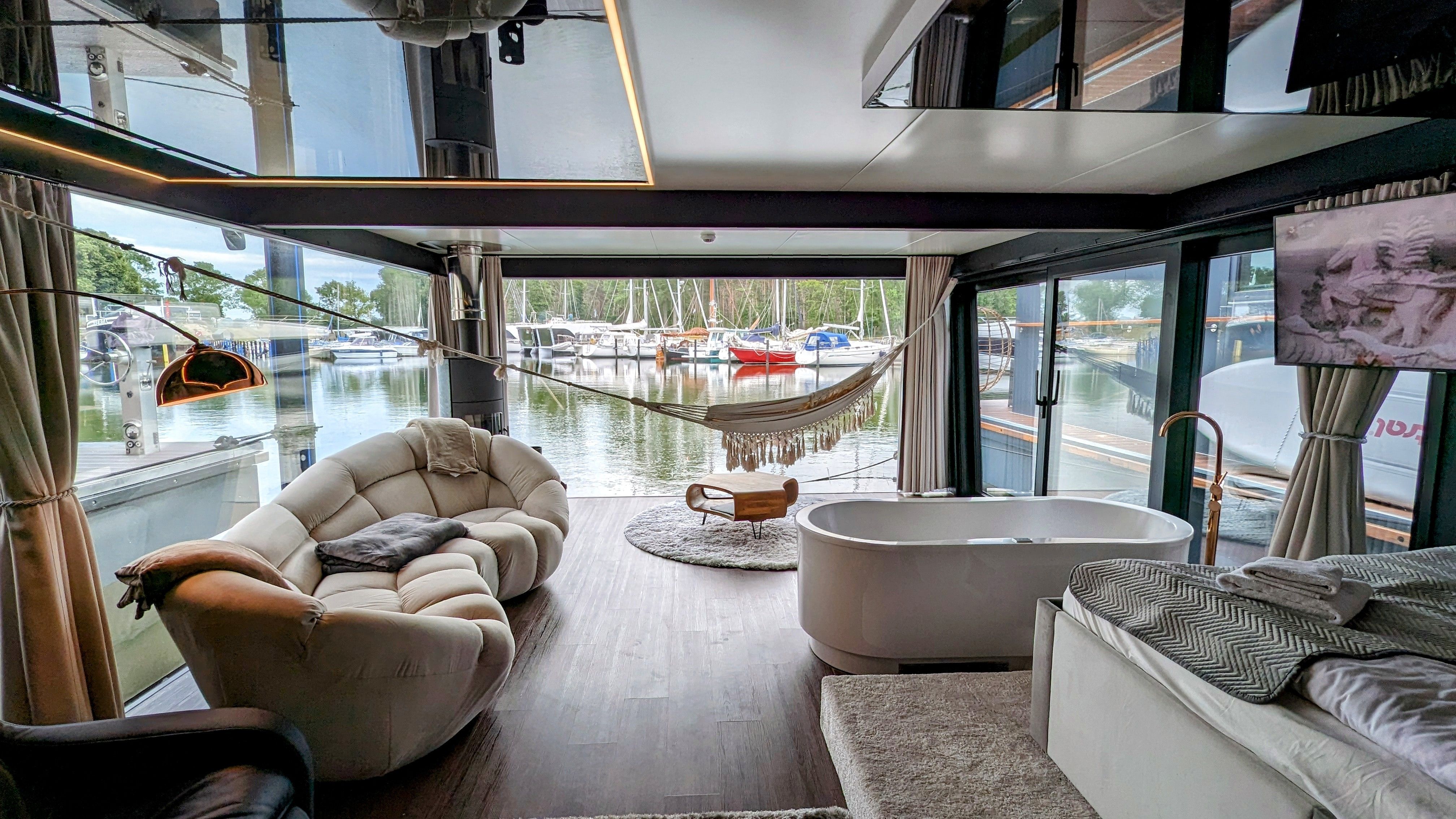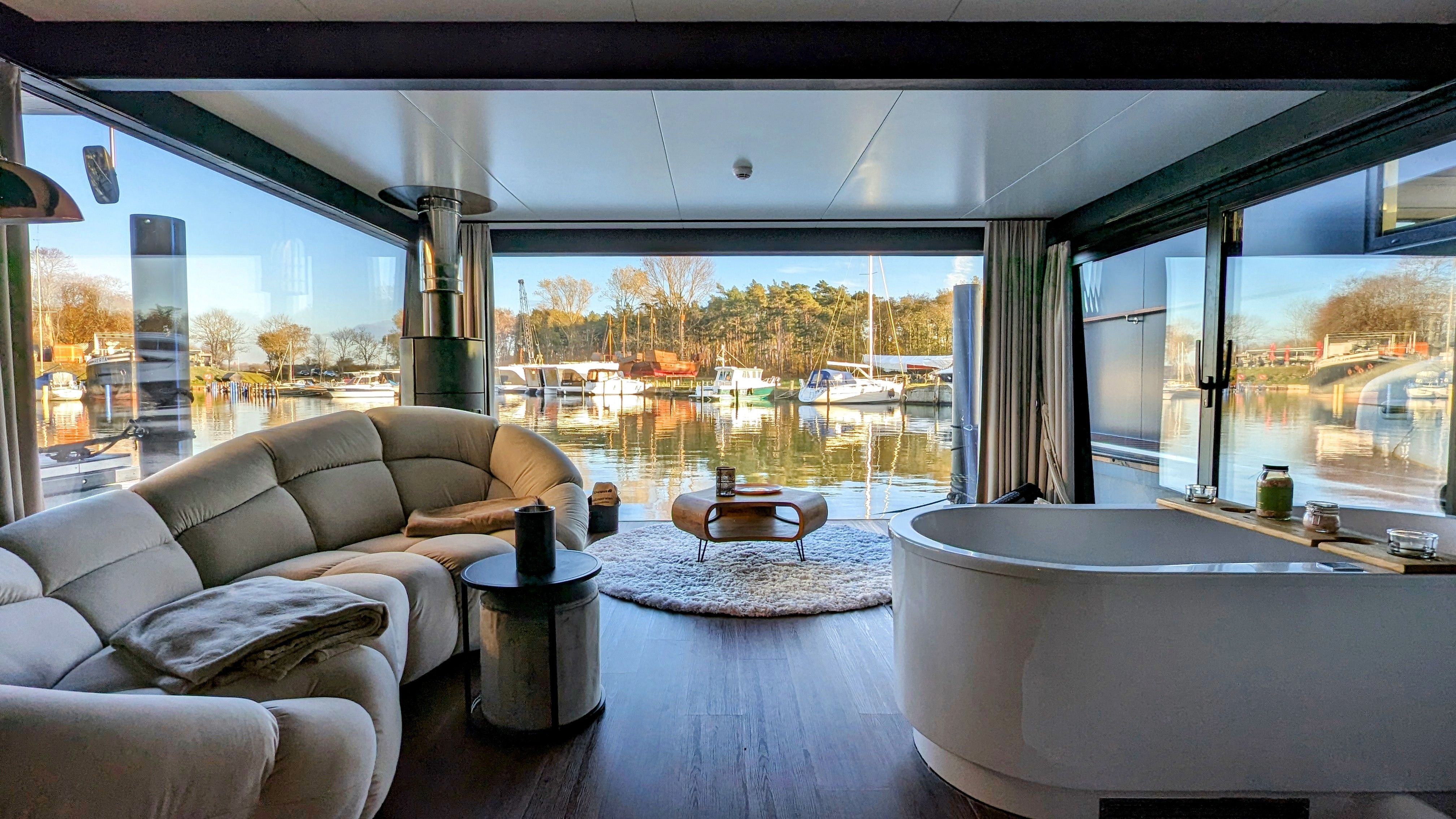 Der offene große Wohn-/Schlafbereich mit Essecke bestimmt den Auftritt des schwimmenden Apartments. Ein klassicher Kamin, eine Whirlwanne vor dem Doppelbett (140 x 200 cm), ein elektrischer Massagesessel und eine kleine Trockensauna bieten die Möglichkeit für ganz persönliche Wellnesszeiten. Eine Essecke mit kleiner Küchenzeile mit Kühlschrank, Spüle, BEKO-Kaffeemaschine, Wasserkocher und Toaster, sowie Eiswürfelmaschine gehören zur Ausstattung um eine Eigenversorgung zu ermöglichen. Frühstück (auch zur Abholung an Bord) und kleine Gerichte können im Hafenbistro gleich um die Ecke genossen werden. Im Wohnbereich gibt es eine Hängematte und 2 Yogamatten. Ferner sorgen eine Klimaanlage mit Heizfunktion im Wohnbereich und das große Panoramafenster mit atemberaubenden Blick auf den Hafen und Boote für Entspannung pur. Eine 2. kleine Kajüte mit Doppelbett (140 x 200) runden den Wohnbereich ab. W-LAN, 2 Smart-TV und eine Bose-Homesound 500-Anlage gehören zur Entertainmentausstattung. 2 Bäder mit großen Duschbereichen, Waschbecken und WC stehen im Sanitärbereich zur Verfügung. Im Eingangsbereich auf einer kleinen Terrasse befindet sich eine kleine Sitzecke. Darüber hinaus befindet sich auf dem Dach der Hausboot-Suite noch eine zusätzliche Sitzgruppe mit Blick auf den Jasmunder Bodden.