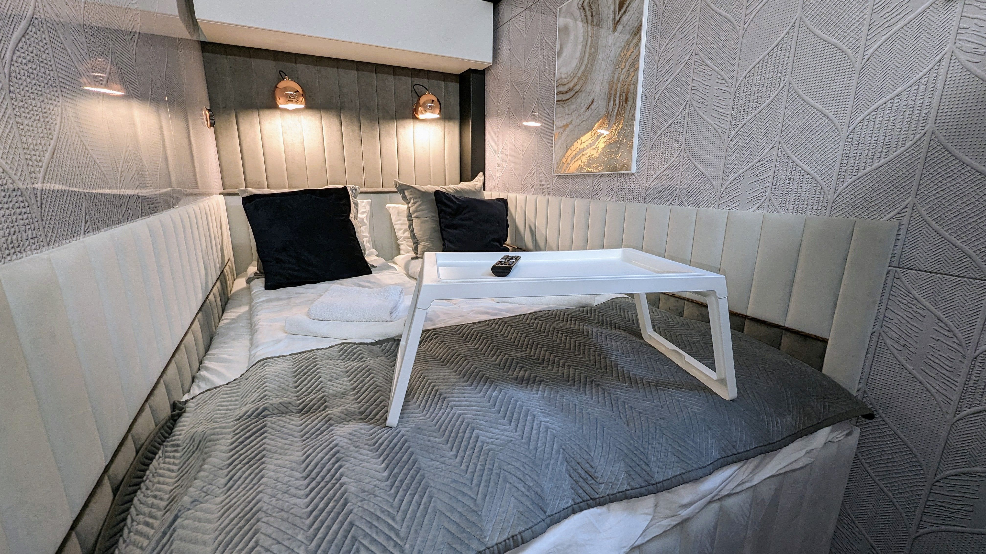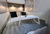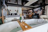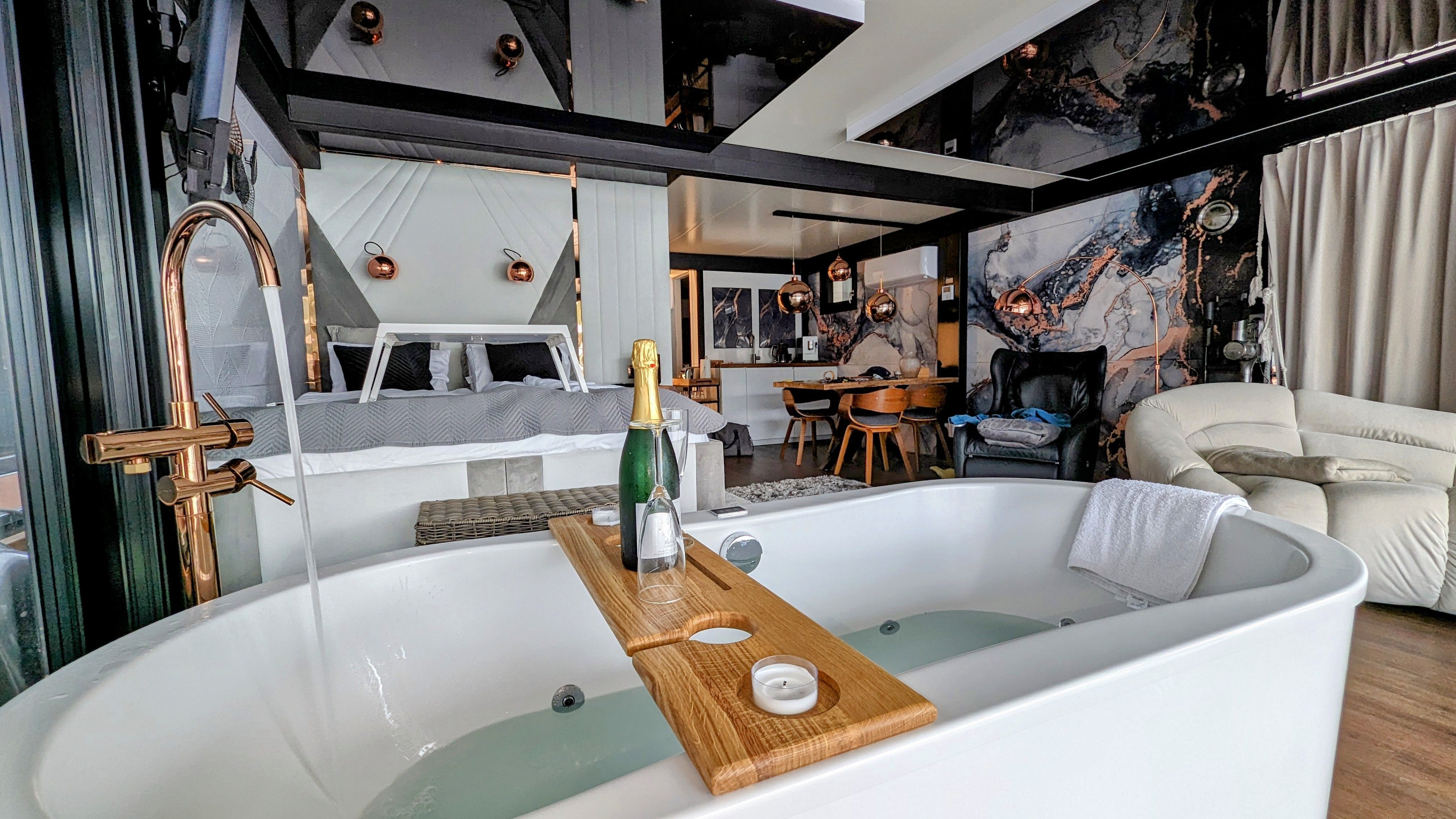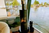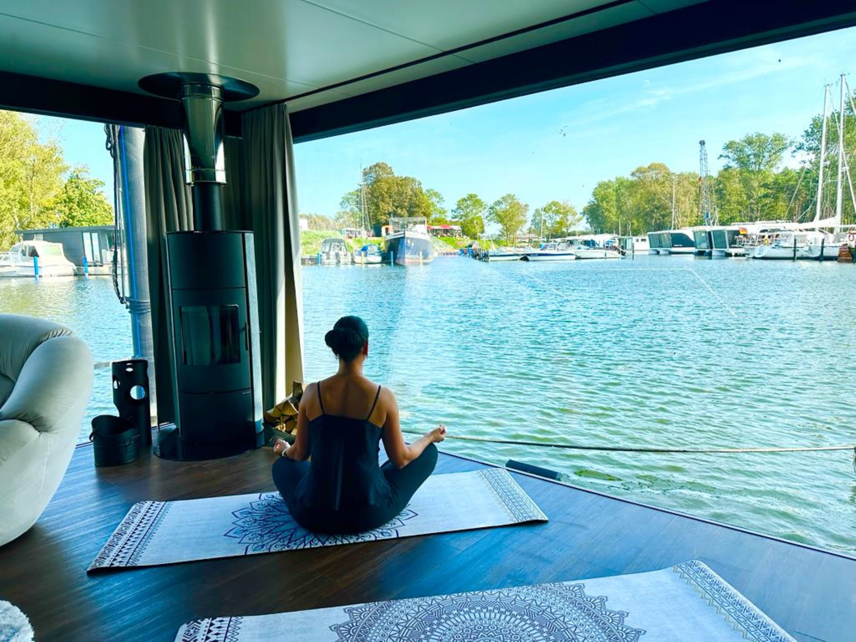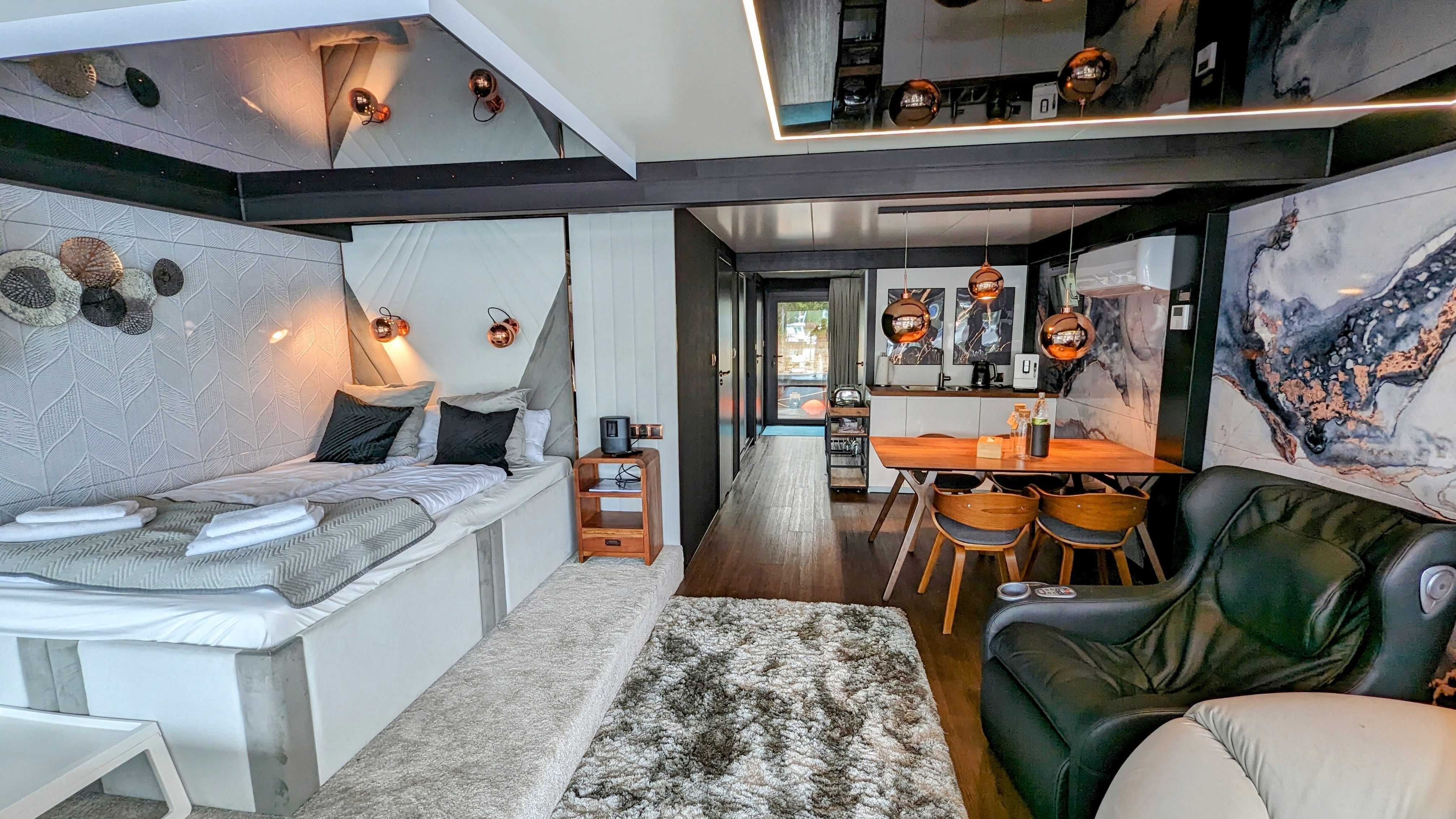 Der offene große Wohn-/Schlafbereich mit Essecke bestimmt den Auftritt des schwimmenden Apartments. Ein klassicher Kamin, eine Whirlwanne vor dem Doppelbett (140 x 200 cm), ein elektrischer Massagesessel und eine kleine Trockensauna bieten die Möglichkeit für ganz persönliche Wellnesszeiten. Eine Essecke mit kleiner Küchenzeile mit Kühlschrank, Spüle, BEKO-Kaffeemaschine, Wasserkocher und Toaster, sowie Eiswürfelmaschine gehören zur Ausstattung um eine Eigenversorgung zu ermöglichen. Frühstück (auch zur Abholung an Bord) und kleine Gerichte können im Hafenbistro gleich um die Ecke genossen werden. Im Wohnbereich gibt es eine Hängematte und 2 Yogamatten. Ferner sorgen eine Klimaanlage mit Heizfunktion im Wohnbereich und das große Panoramafenster mit atemberaubenden Blick auf den Hafen und Boote für Entspannung pur. Eine 2. kleine Kajüte mit Doppelbett (140 x 200) runden den Wohnbereich ab. W-LAN, 2 Smart-TV und eine Bose-Homesound 500-Anlage gehören zur Entertainmentausstattung. 2 Bäder mit großen Duschbereichen, Waschbecken und WC stehen im Sanitärbereich zur Verfügung. Im Eingangsbereich auf einer kleinen Terrasse befindet sich eine kleine Sitzecke. Darüber hinaus befindet sich auf dem Dach der Hausboot-Suite noch eine zusätzliche Sitzgruppe mit Blick auf den Jasmunder Bodden.
