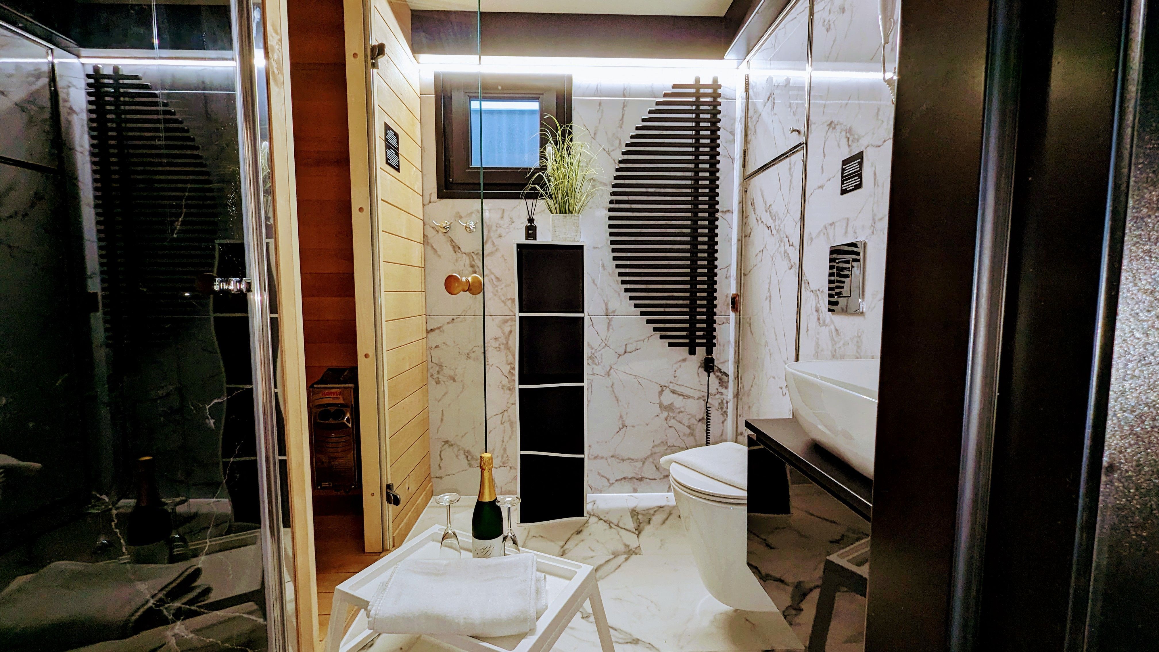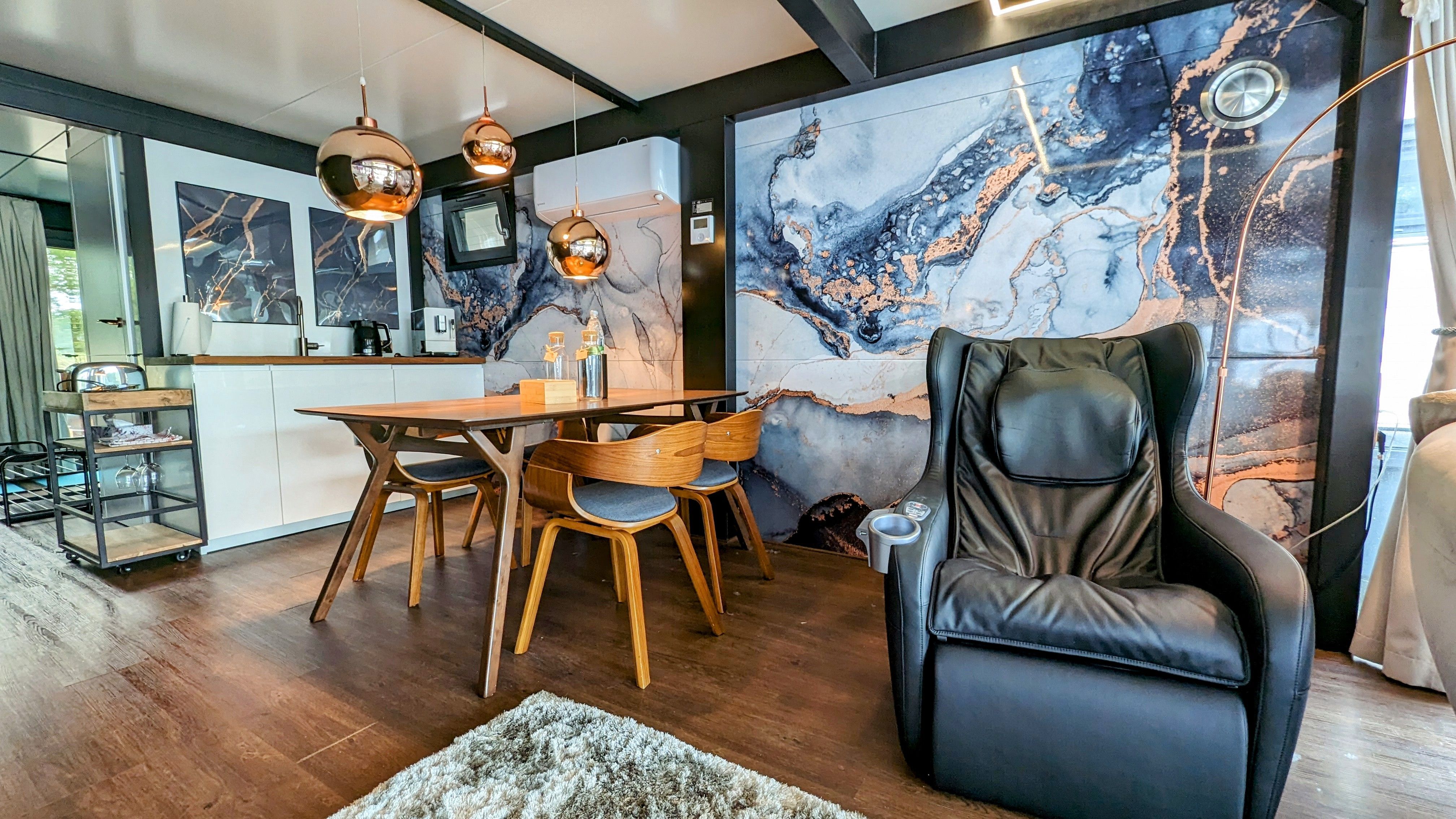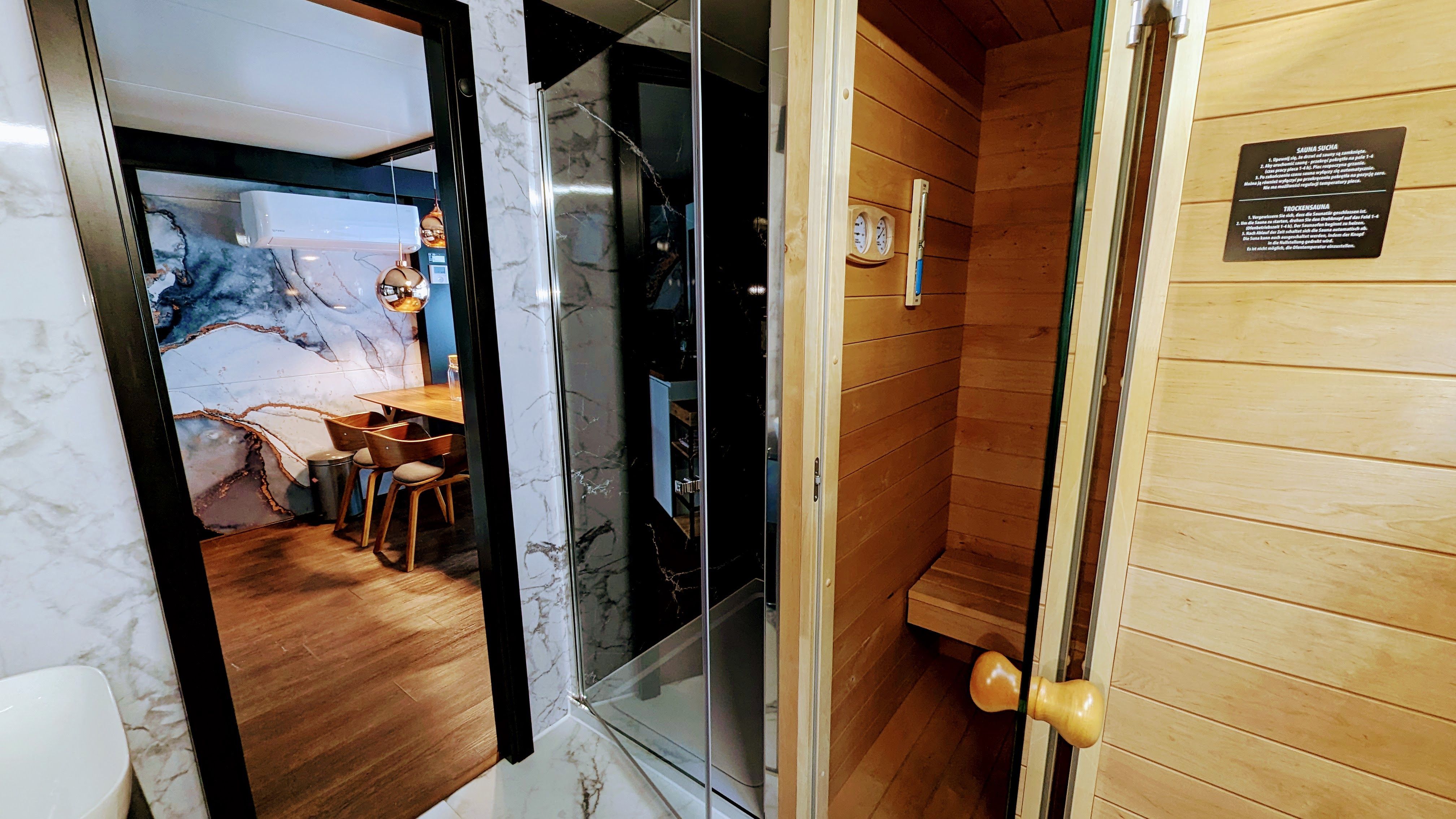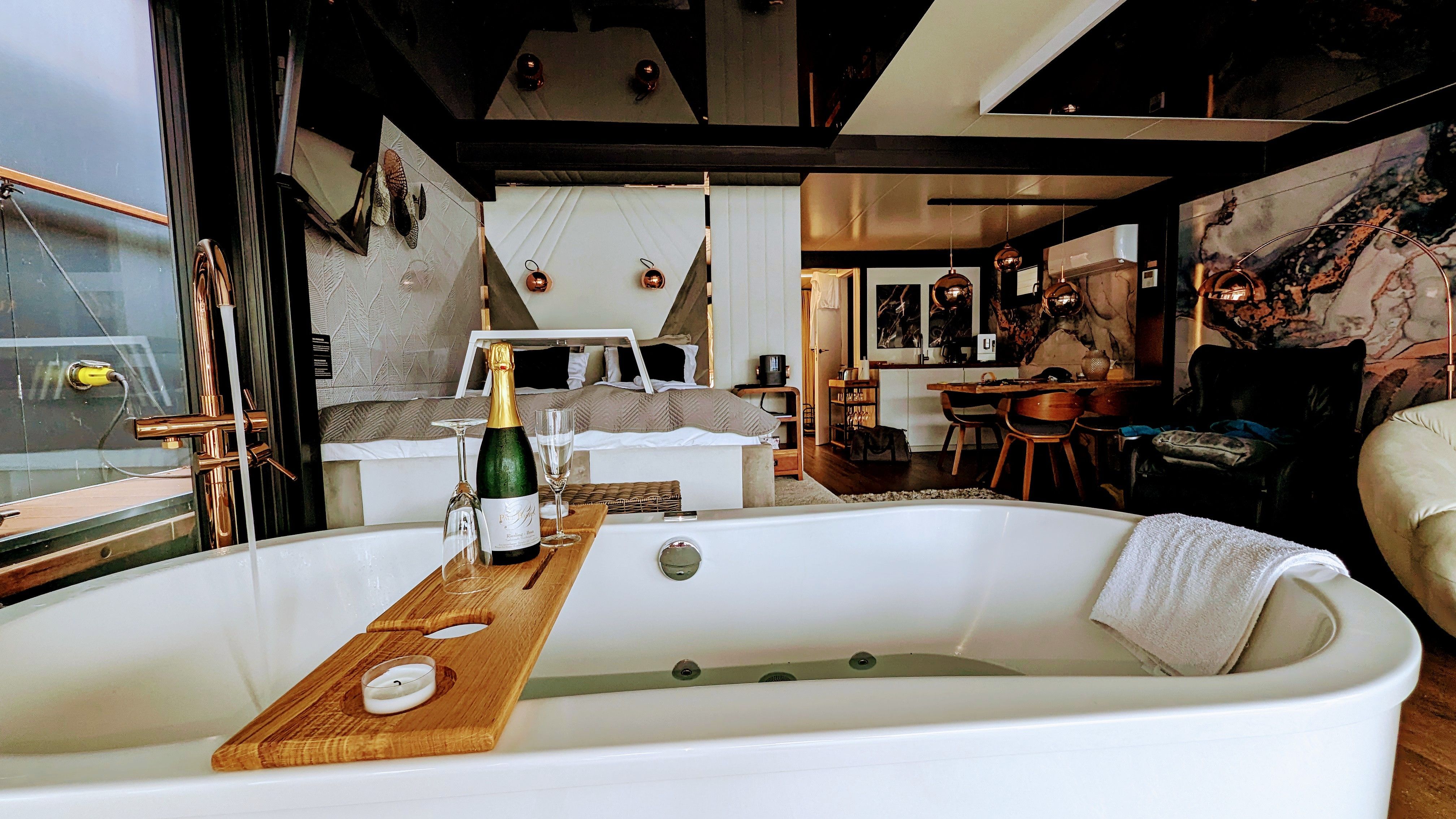 Der offene große Wohn-/Schlafbereich mit Essecke bestimmt den Auftritt des schwimmenden Apartments. Ein klassicher Kamin, eine Whirlwanne vor dem Doppelbett (140 x 200 cm), ein elektrischer Massagesessel und eine kleine Trockensauna bieten die Möglichkeit für ganz persönliche Wellnesszeiten. Eine Essecke mit kleiner Küchenzeile mit Kühlschrank, Spüle, BEKO-Kaffeemaschine, Wasserkocher und Toaster, sowie Eiswürfelmaschine gehören zur Ausstattung um eine Eigenversorgung zu ermöglichen. Frühstück (auch zur Abholung an Bord) und kleine Gerichte können im Hafenbistro gleich um die Ecke genossen werden. Im Wohnbereich gibt es eine Hängematte und 2 Yogamatten. Ferner sorgen eine Klimaanlage mit Heizfunktion im Wohnbereich und das große Panoramafenster mit atemberaubenden Blick auf den Hafen und Boote für Entspannung pur. Eine 2. kleine Kajüte mit Doppelbett (140 x 200) runden den Wohnbereich ab. W-LAN, 2 Smart-TV und eine Bose-Homesound 500-Anlage gehören zur Entertainmentausstattung. 2 Bäder mit großen Duschbereichen, Waschbecken und WC stehen im Sanitärbereich zur Verfügung. Im Eingangsbereich auf einer kleinen Terrasse befindet sich eine kleine Sitzecke. Darüber hinaus befindet sich auf dem Dach der Hausboot-Suite noch eine zusätzliche Sitzgruppe mit Blick auf den Jasmunder Bodden.