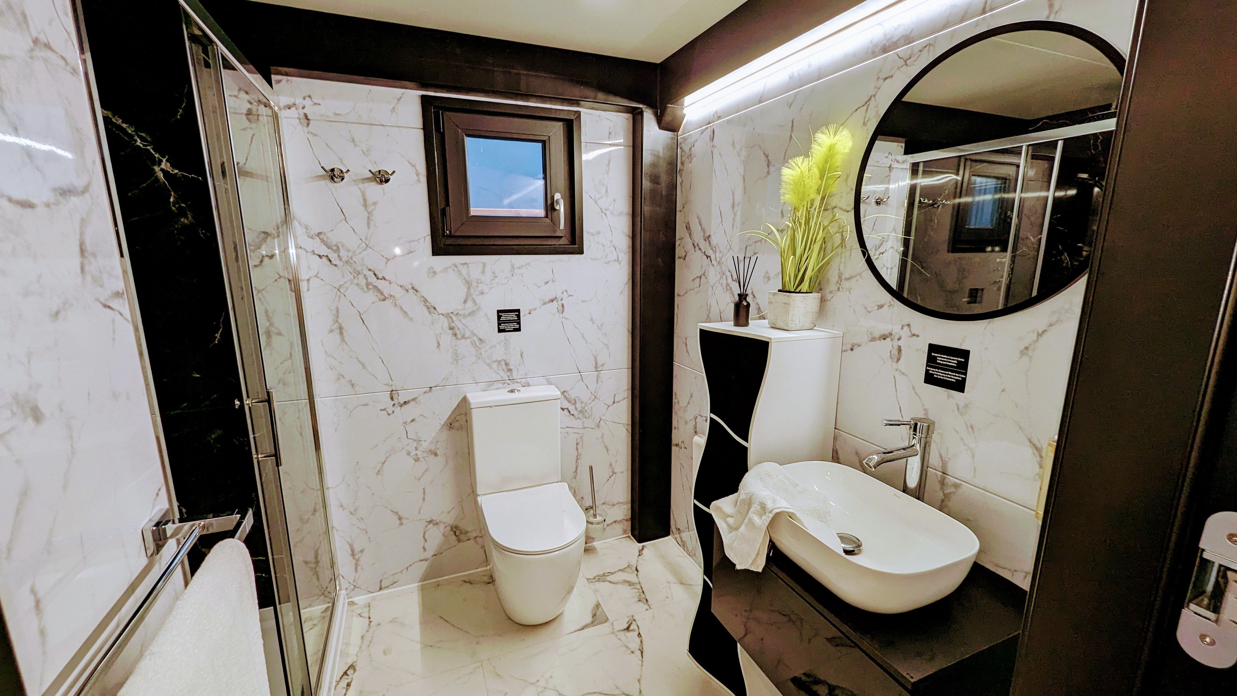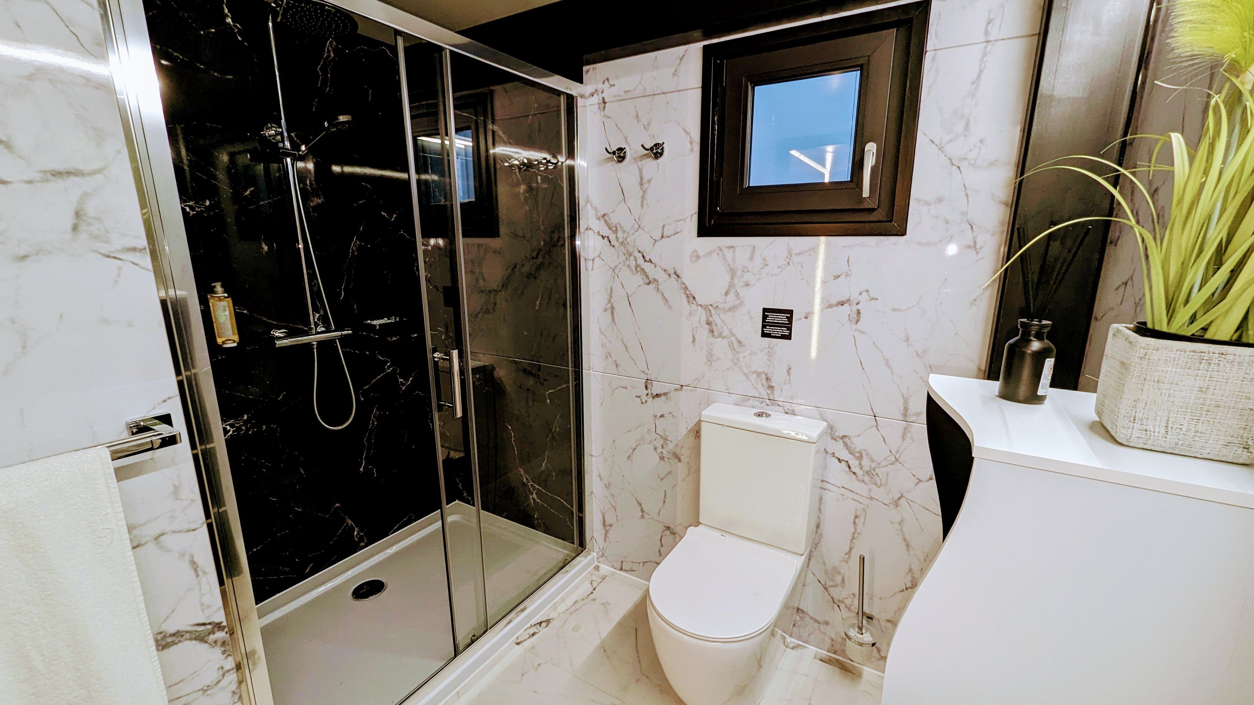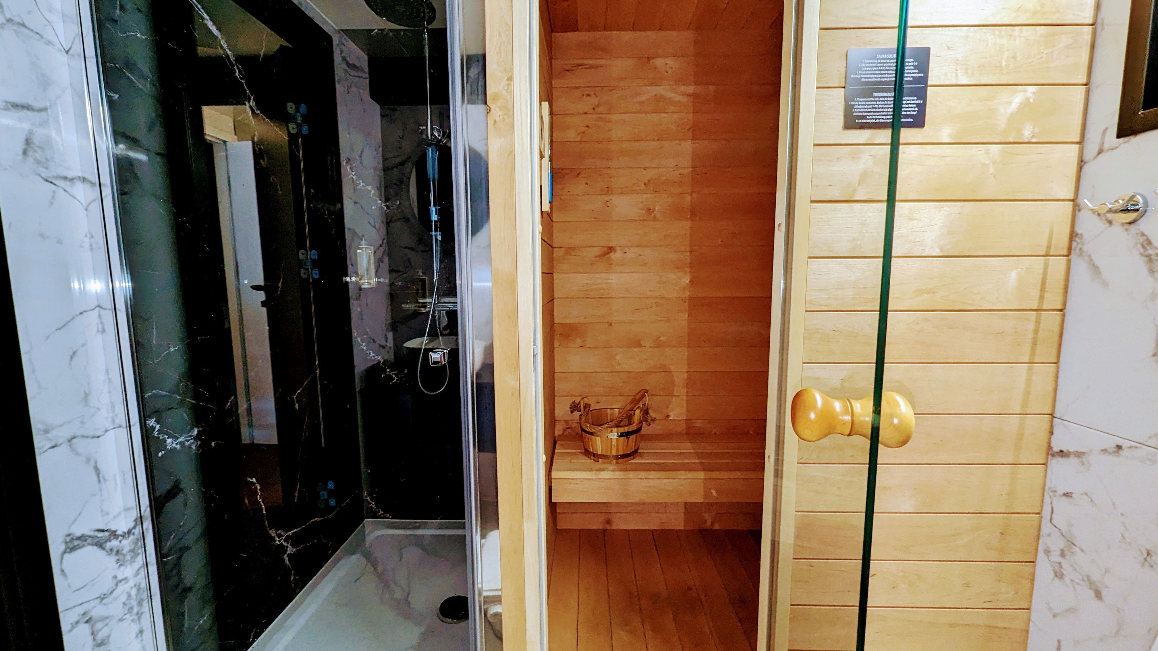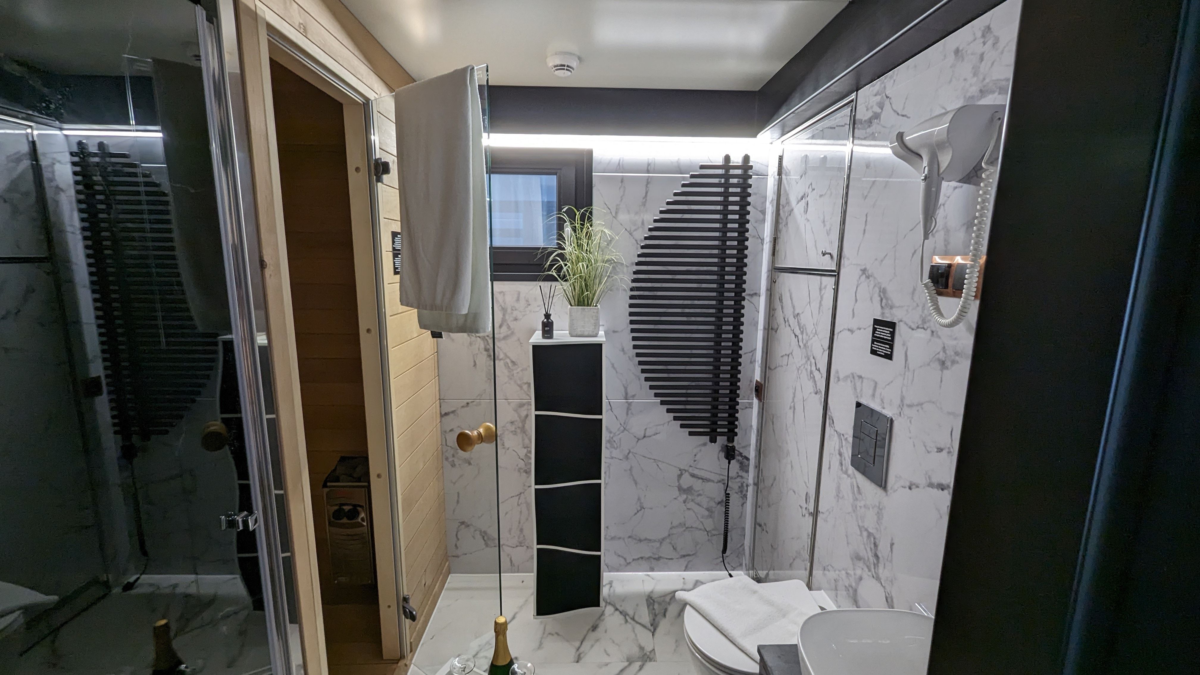 Der offene große Wohn-/Schlafbereich mit Essecke bestimmt den Auftritt des schwimmenden Apartments. Ein klassicher Kamin, eine Whirlwanne vor dem Doppelbett (140 x 200 cm), ein elektrischer Massagesessel und eine kleine Trockensauna bieten die Möglichkeit für ganz persönliche Wellnesszeiten. Eine Essecke mit kleiner Küchenzeile mit Kühlschrank, Spüle, BEKO-Kaffeemaschine, Wasserkocher und Toaster, sowie Eiswürfelmaschine gehören zur Ausstattung um eine Eigenversorgung zu ermöglichen. Frühstück (auch zur Abholung an Bord) und kleine Gerichte können im Hafenbistro gleich um die Ecke genossen werden. Im Wohnbereich gibt es eine Hängematte und 2 Yogamatten. Ferner sorgen eine Klimaanlage mit Heizfunktion im Wohnbereich und das große Panoramafenster mit atemberaubenden Blick auf den Hafen und Boote für Entspannung pur. Eine 2. kleine Kajüte mit Doppelbett (140 x 200) runden den Wohnbereich ab. W-LAN, 2 Smart-TV und eine Bose-Homesound 500-Anlage gehören zur Entertainmentausstattung. 2 Bäder mit großen Duschbereichen, Waschbecken und WC stehen im Sanitärbereich zur Verfügung. Im Eingangsbereich auf einer kleinen Terrasse befindet sich eine kleine Sitzecke. Darüber hinaus befindet sich auf dem Dach der Hausboot-Suite noch eine zusätzliche Sitzgruppe mit Blick auf den Jasmunder Bodden.
