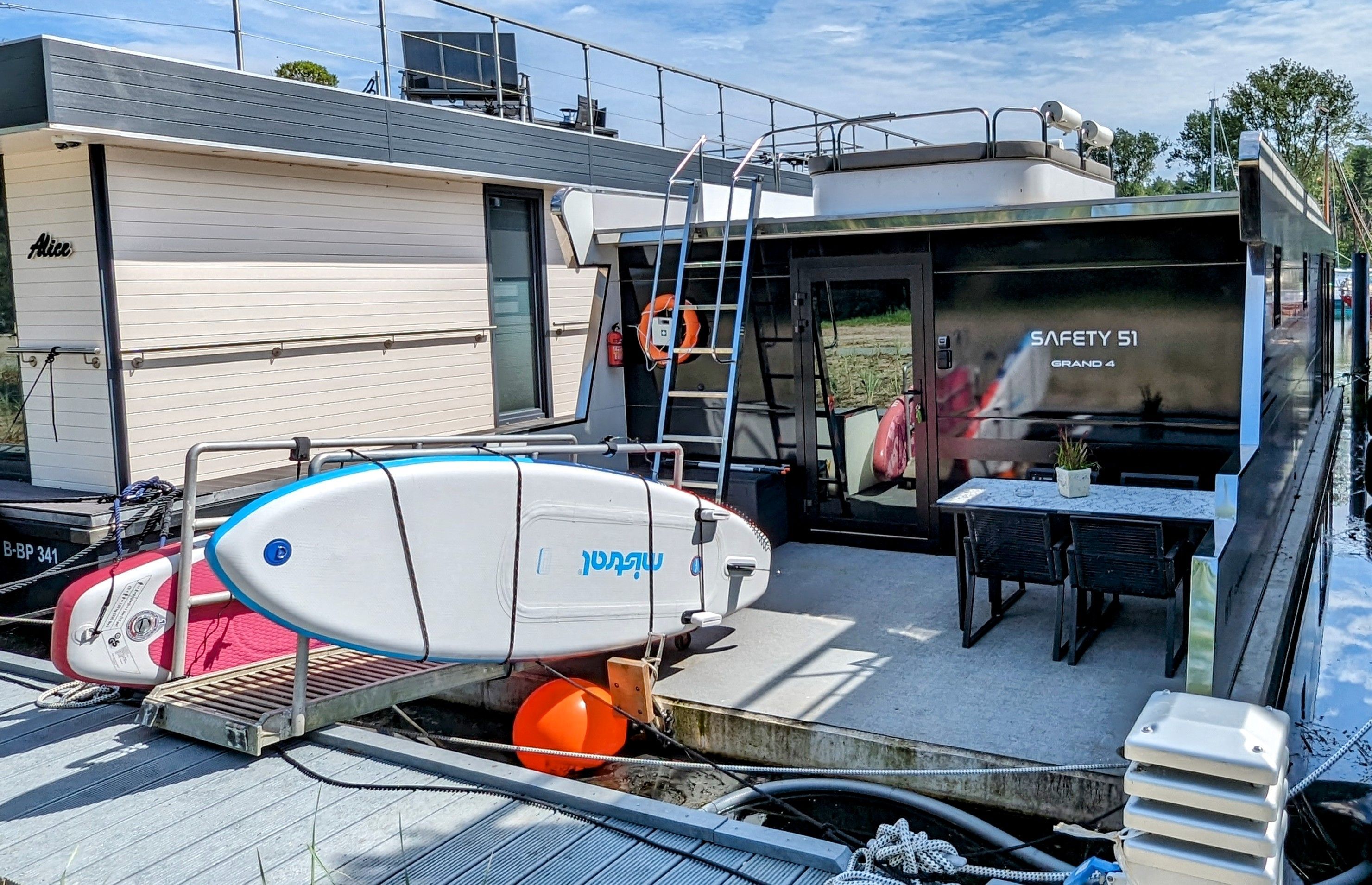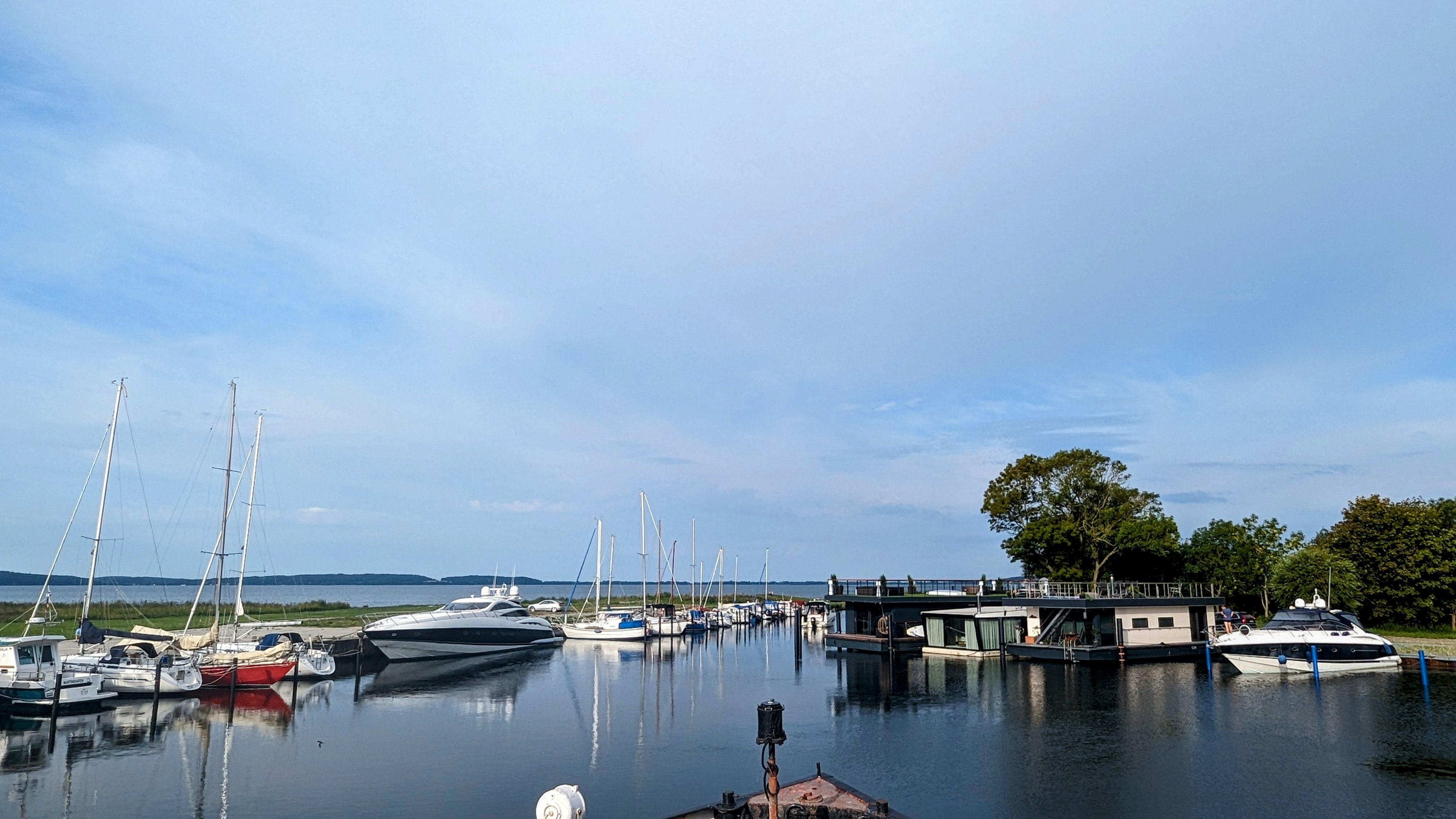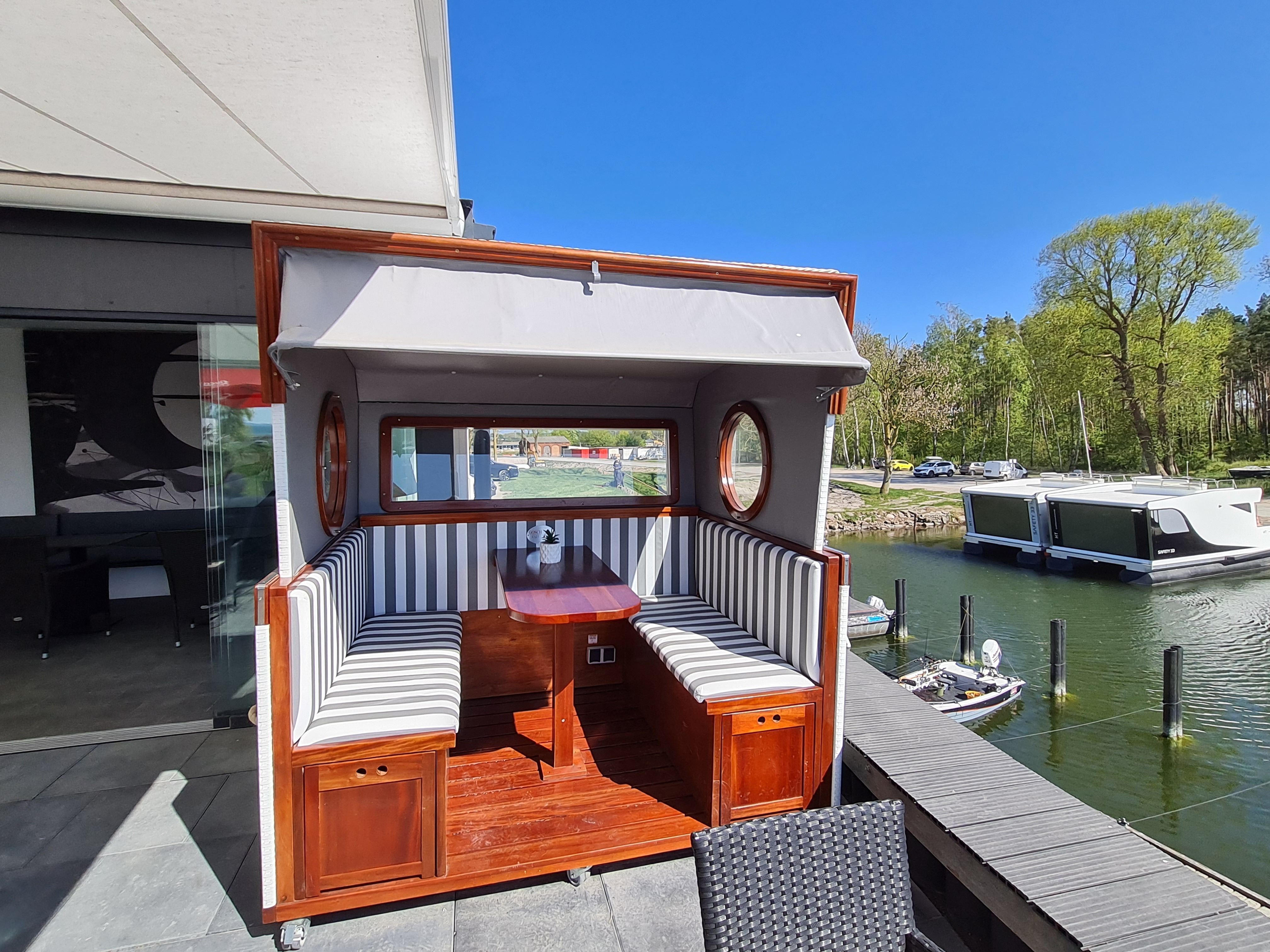 Unser Hausboot, die schwimmende Hafensuite DeLuxe, im Hafenbecken der kleinen Marina Martinshafen gelegen, bietet Luxus pur auf ca. 60 m² Relaxwohnfläche und 2 Außenterrassen auf 2 Etagen. Ein großes Panoramafenster verstärkt den weitläufigen Raumeindruck und eröffnet tolle Blicke auf das Hafengeschehen. Eine kleine Trockensauna, eine Whirlwanne direkt vor dem Doppelbett (140 x 200 cm), ein elektrischer Massagesessel und ein klassischer Kamin sorgen für besondere und persönliche Wellnessmomente an Bord. Eine Essecke mit einer kleinen Küchenzeile bietet Möglichkeiten für eine einfache Selbstversorgung. Hier stehen ein Kühlschrank, eine BEKO-Kaffeemaschine, ein Toaster, ein Wasserkocher und ein Eiswürfelmaker zur Verfügung. Entertainmentinfrastruktur ist mit W-LAN, 2 Smart-TV`s und einer Bose-Homesound-500-Anlager vorhanden. 2 Bäder mit großen bodentiefen Duschen, Waschbecken und WC sowie eine zusätzliche kleine Kajüte mit einer Doppelkoje (140 x 200 cm) runden das Luxusangebot der schwimmenden Hafensuite ab. Eingebettet in das Naturschutzgebiet rund um den Großen Jasmunder Bodden und ideal zentral gelegen im nördlichen Teil der Insel Rügen liegt die Hafenlady in geschützter Lage in der Marina Martinshafen. Lassen Sie den Blick schweifen über die den gesamten Tag glitzernde Wasseroberfläche oder genießen Sie eine Flasche Wein mit Blick auf den Sonnenuntergang am Ende eines ereignisreichen Urlaubstages. Unsere einmalige Urlaubs-Location für Sie liegt fest im Hafen vertaut - bereit für entspannte Stunden und einmalige Urlaubs-Momente. Mehr Urlaub mit und auf dem Wasser geht nicht. Mit viel unberührter Natur, direkt auf dem Wasser und einem kleinen Strandabschnitt direkt am Hafen. Genießen Sie bei uns ganz entspannte Stunden. Oder bei entsprechendem Wetter die sehr guten Voraussetzungen für Kite- oder Wind-Surfen. 2 SuP`s gehören zur Bordausstattung für einen Wasserausflug auf dem Bodden dazu. Auf jeden Fall werden Sie nach unvergesslichen Momenten bei einem Glas Wein mit Blick auf den Sonnenuntergang über dem großen Jasmunder Bodden immer wieder zurückkommen wollen – in die schwimmende Hafensuite De Luxe in der Marina Martinshafen.