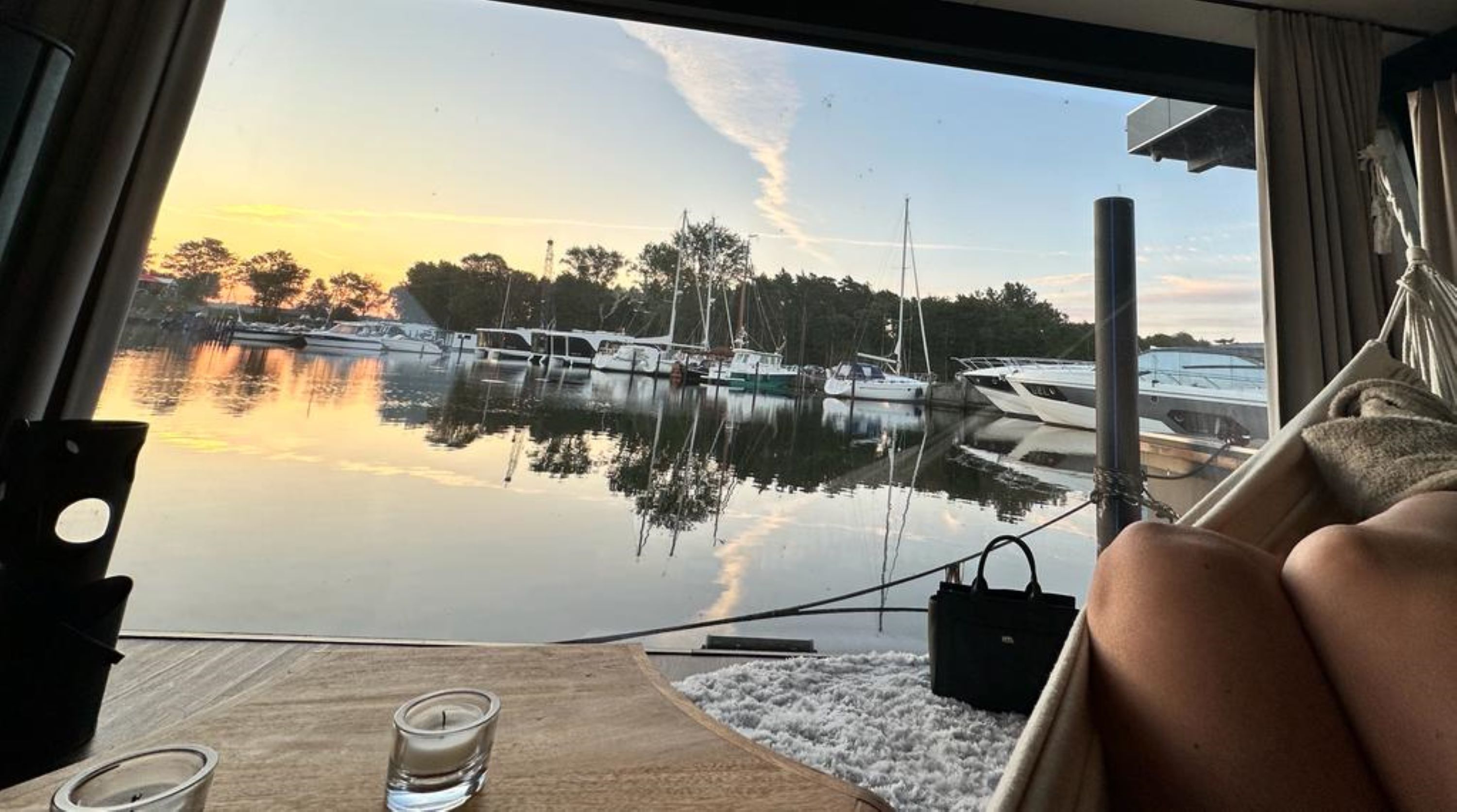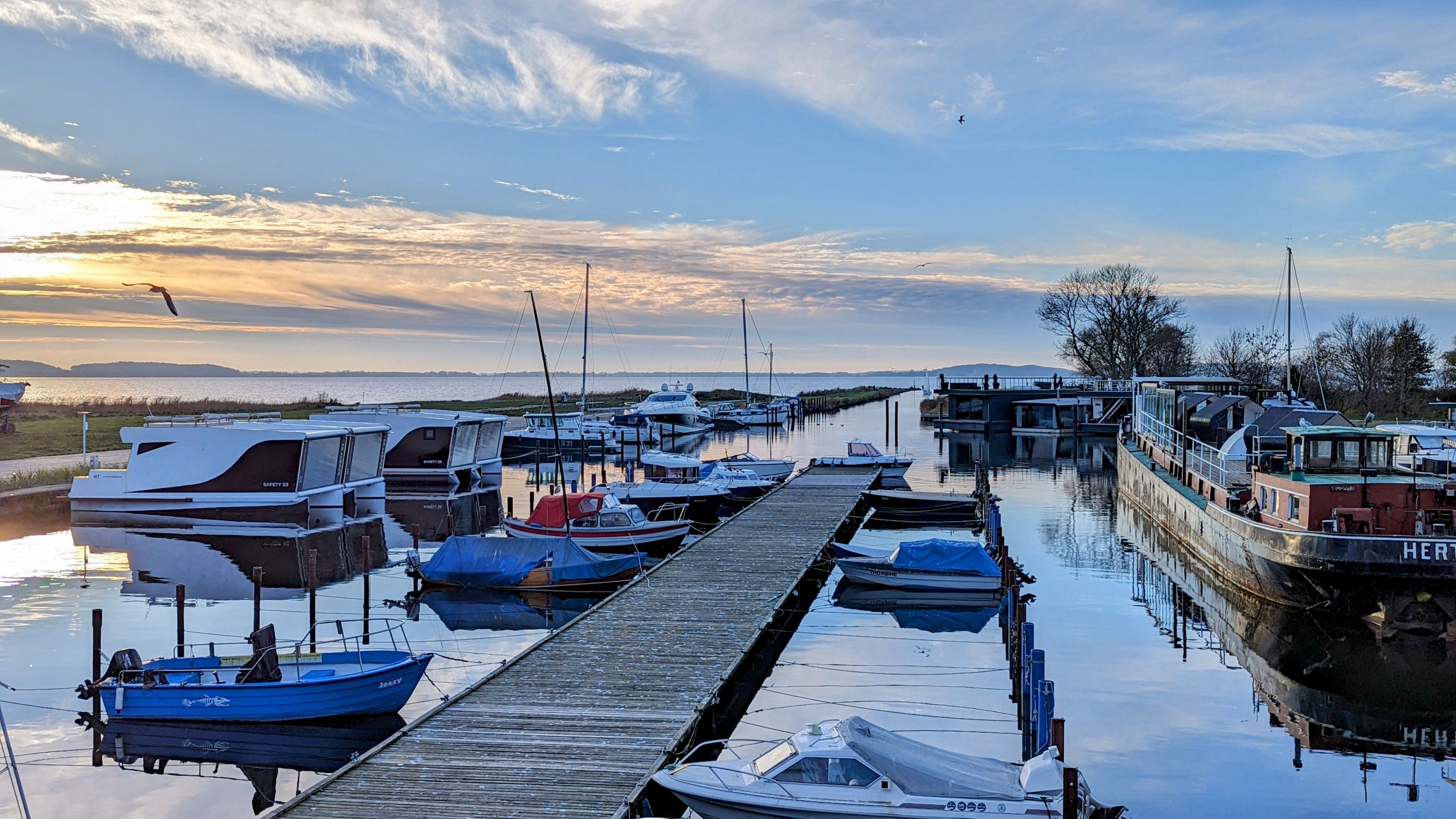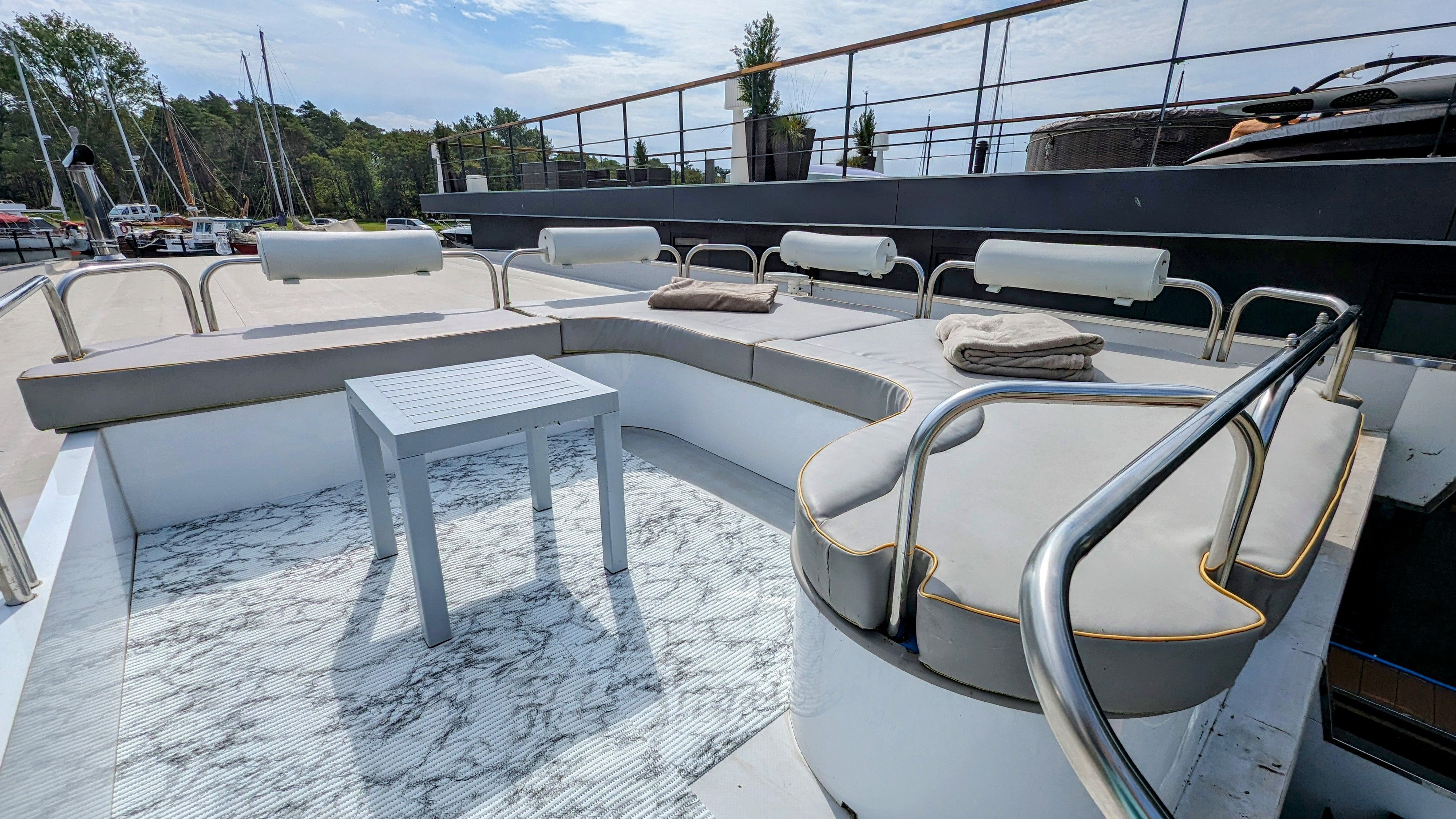Unser Hausboot, die schwimmende Hafensuite DeLuxe, im Hafenbecken der kleinen Marina Martinshafen gelegen, bietet Luxus pur auf ca. 60 m² Relaxwohnfläche und 2 Außenterrassen auf 2 Etagen. Ein großes Panoramafenster verstärkt den weitläufigen Raumeindruck und eröffnet tolle Blicke auf das Hafengeschehen. Eine kleine Trockensauna, eine Whirlwanne direkt vor dem Doppelbett (140 x 200 cm), ein elektrischer Massagesessel und ein klassischer Kamin sorgen für besondere und persönliche Wellnessmomente an Bord. Eine Essecke mit einer kleinen Küchenzeile bietet Möglichkeiten für eine einfache Selbstversorgung. Hier stehen ein Kühlschrank, eine BEKO-Kaffeemaschine, ein Toaster, ein Wasserkocher und ein Eiswürfelmaker zur Verfügung. Entertainmentinfrastruktur ist mit W-LAN, 2 Smart-TV`s und einer Bose-Homesound-500-Anlager vorhanden. 2 Bäder mit großen bodentiefen Duschen, Waschbecken und WC sowie eine zusätzliche kleine Kajüte mit einer Doppelkoje (140 x 200 cm) runden das Luxusangebot der schwimmenden Hafensuite ab. Eingebettet in das Naturschutzgebiet rund um den Großen Jasmunder Bodden und ideal zentral gelegen im nördlichen Teil der Insel Rügen liegt die Hafenlady in geschützter Lage in der Marina Martinshafen. Lassen Sie den Blick schweifen über die den gesamten Tag glitzernde Wasseroberfläche oder genießen Sie eine Flasche Wein mit Blick auf den Sonnenuntergang am Ende eines ereignisreichen Urlaubstages. Unsere einmalige Urlaubs-Location für Sie liegt fest im Hafen vertaut - bereit für entspannte Stunden und einmalige Urlaubs-Momente. Mehr Urlaub mit und auf dem Wasser geht nicht. Mit viel unberührter Natur, direkt auf dem Wasser und einem kleinen Strandabschnitt direkt am Hafen. Genießen Sie bei uns ganz entspannte Stunden. Oder bei entsprechendem Wetter die sehr guten Voraussetzungen für Kite- oder Wind-Surfen. 2 SuP`s gehören zur Bordausstattung für einen Wasserausflug auf dem Bodden dazu. Auf jeden Fall werden Sie nach unvergesslichen Momenten bei einem Glas Wein mit Blick auf den Sonnenuntergang über dem großen Jasmunder Bodden immer wieder zurückkommen wollen – in die schwimmende Hafensuite De Luxe in der Marina Martinshafen.