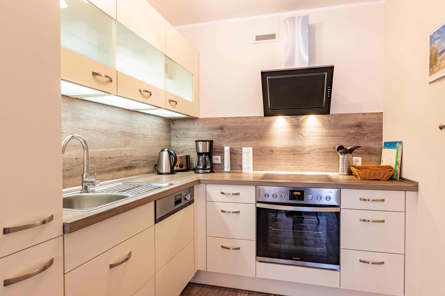 Die Küche ist zum Wohnraum offen. Hier finden Sie eine komfortable Ausstattung mit Spülmaschine. Mikrowelle, Herd, Kühl- und Gefrierschrank, Kaffeemaschine, Eierkocher, Wasserkocher und natürlich ausreichend Geschirr, Besteck und Gläser. Im Schlafzimmer finden Sie extra hohe Betten, verstellbare Lattenroste und viel Stauraum im Kleiderschrank.