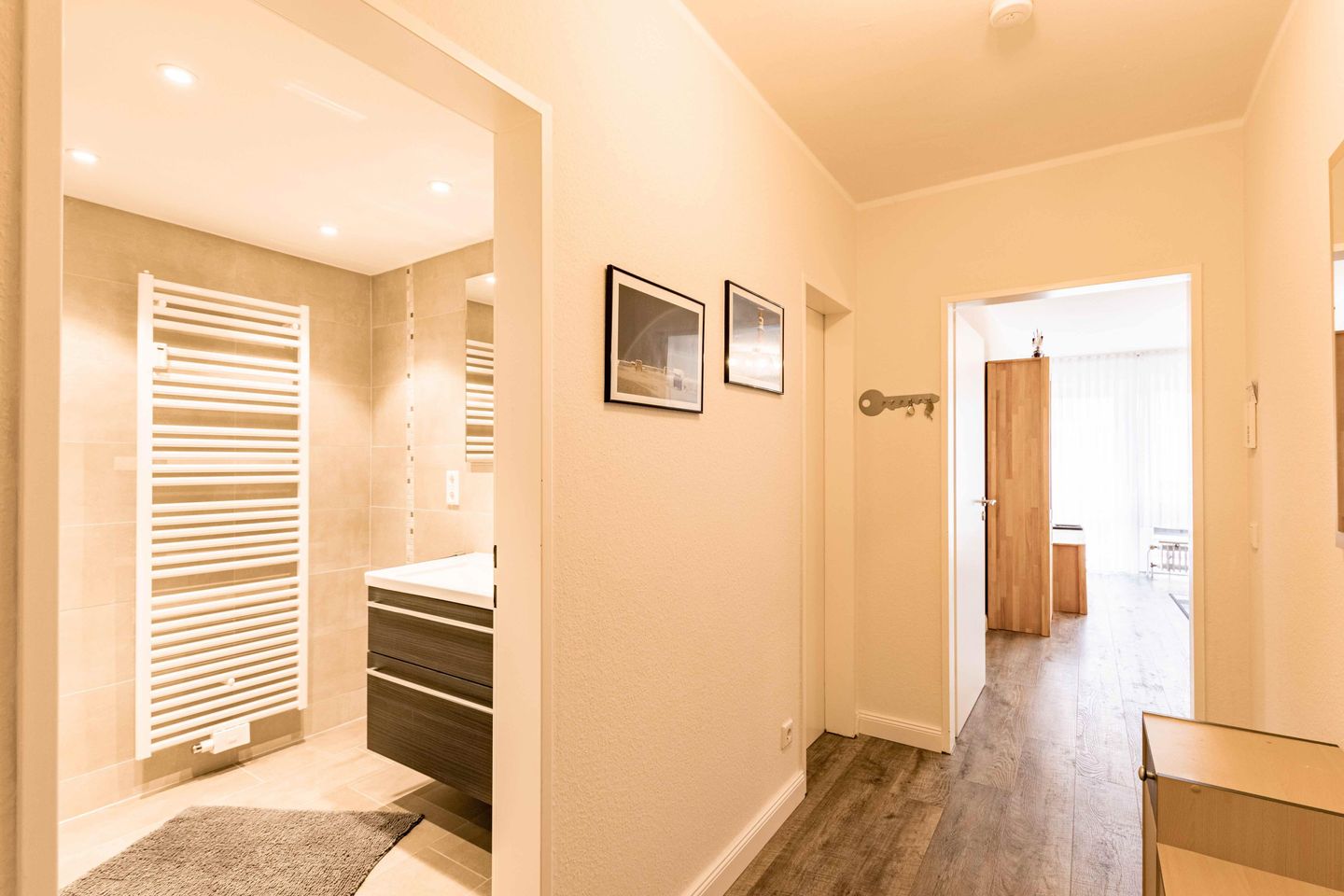 Neben der üblichen Ausstattung im Bad mit Dusche und WC liegen ausreichend Handtücher bei Ihrer Anreise für Sie bereit. Waschmaschine und Trockner können im Haus gemeinschaftlich genutzt werden.